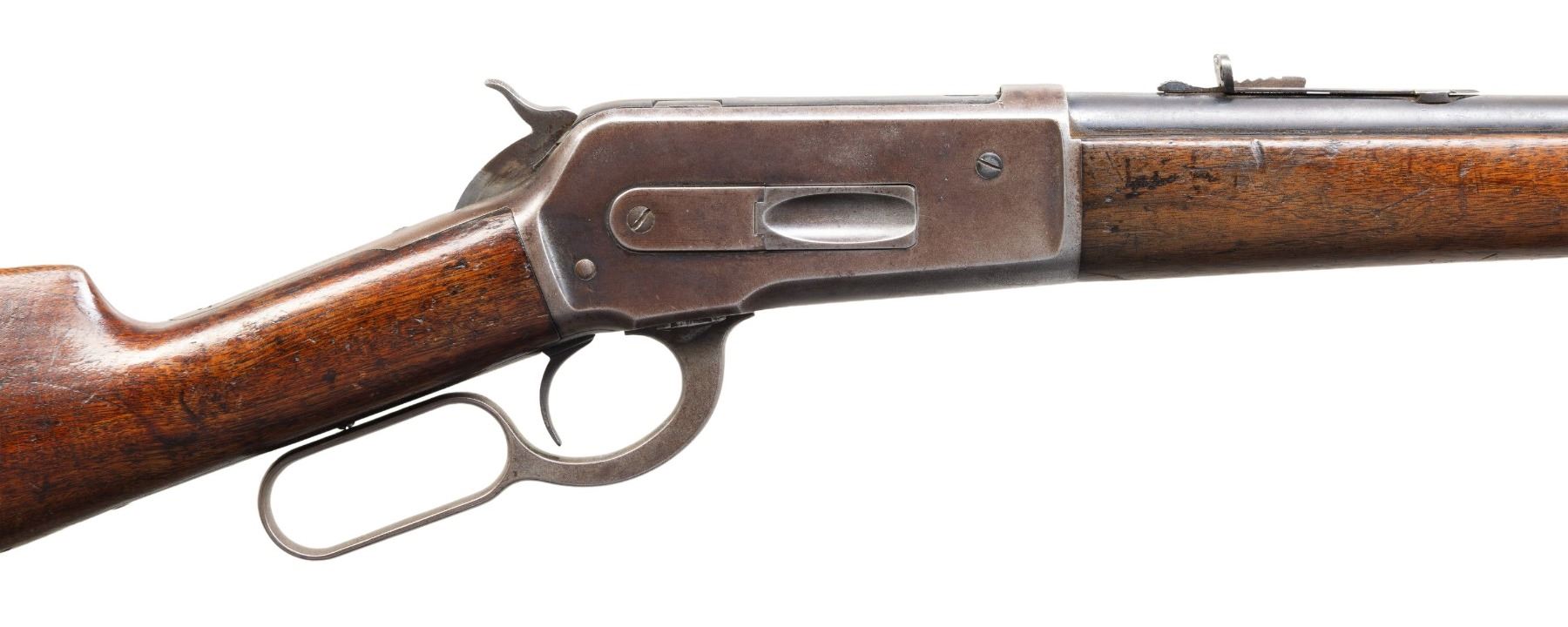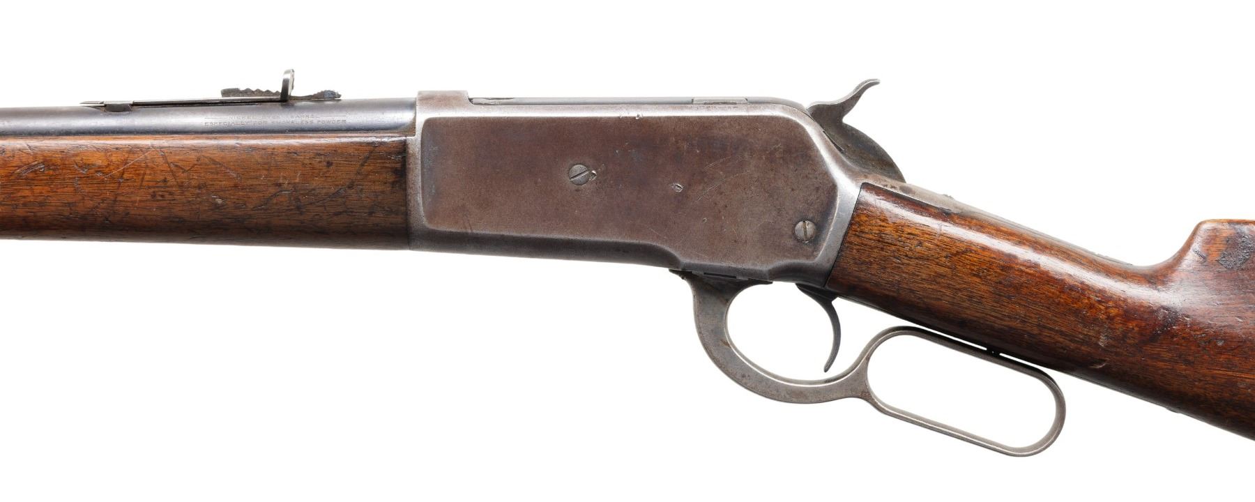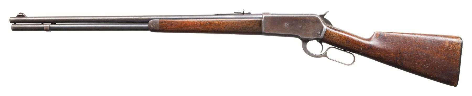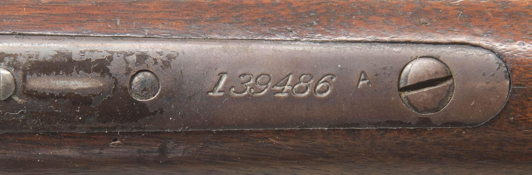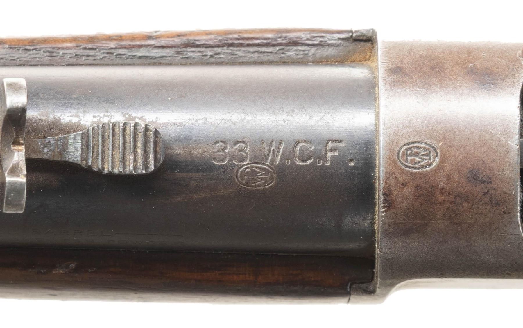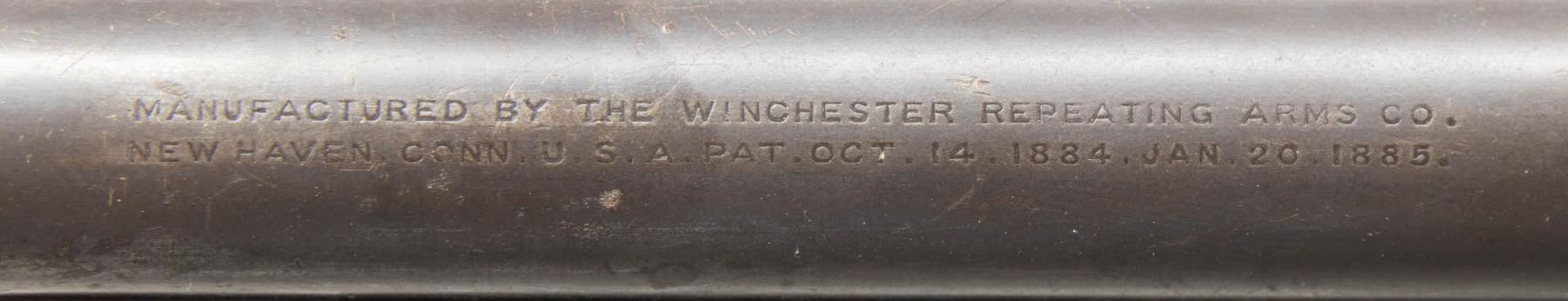 Cal. 33 WCF. S# 139486A. Bbl 24" tapered round. Ramp mounted Lyman No. 3 hunting front sight with original sporting rear sight. Full length tubular mag. Blue finish with case colored lever and hammer. Walnut forearm and straight grip stock with hard rubber shotgun buttplate. Mfg. 1906. CONDITION: bbl and mag tube have 40% dull fading blue showing scratches and marks. Action blue has largely faded to gray with scratches and marks. Wood has added finish over heavy wear with scratches, marks and dents. Sound action. Dark lightly pitted bore. (25-6730/DS). CURIO. $1,200-1,800.