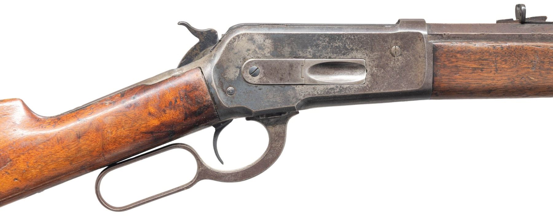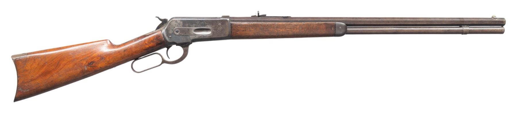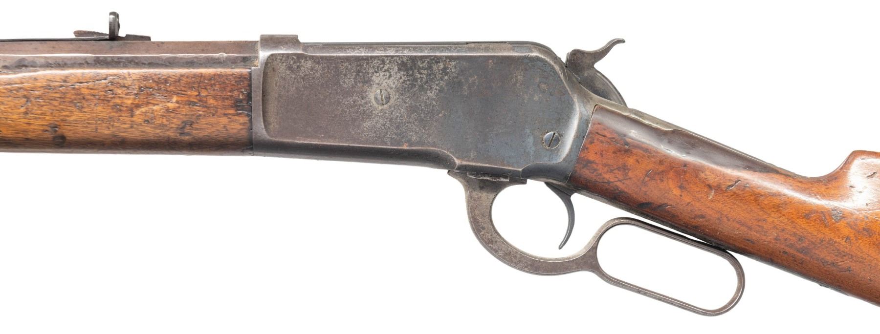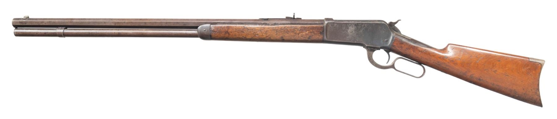 Cal. 38-56 WCF. S# 71197. Bbl. 26" octagon w/ sporting sights. Full length mag. Walnut forearm & straight grip stock w/ crescent steel buttplate. Mfg. 1892. CONDITION: metal finish has faded to a mottled gray brown w/ spotted light pitting & corrosion. Edges of barrel show numerous dents. Wood has a worn appearance w/ numerous dents & marks. Stock left of the top tang has a large area of epoxy repair. Sound action. Dark bore retains intact rifling showing scattered light pitting. (01-28711/DS). ANTIQUE. $1,000-1,500.