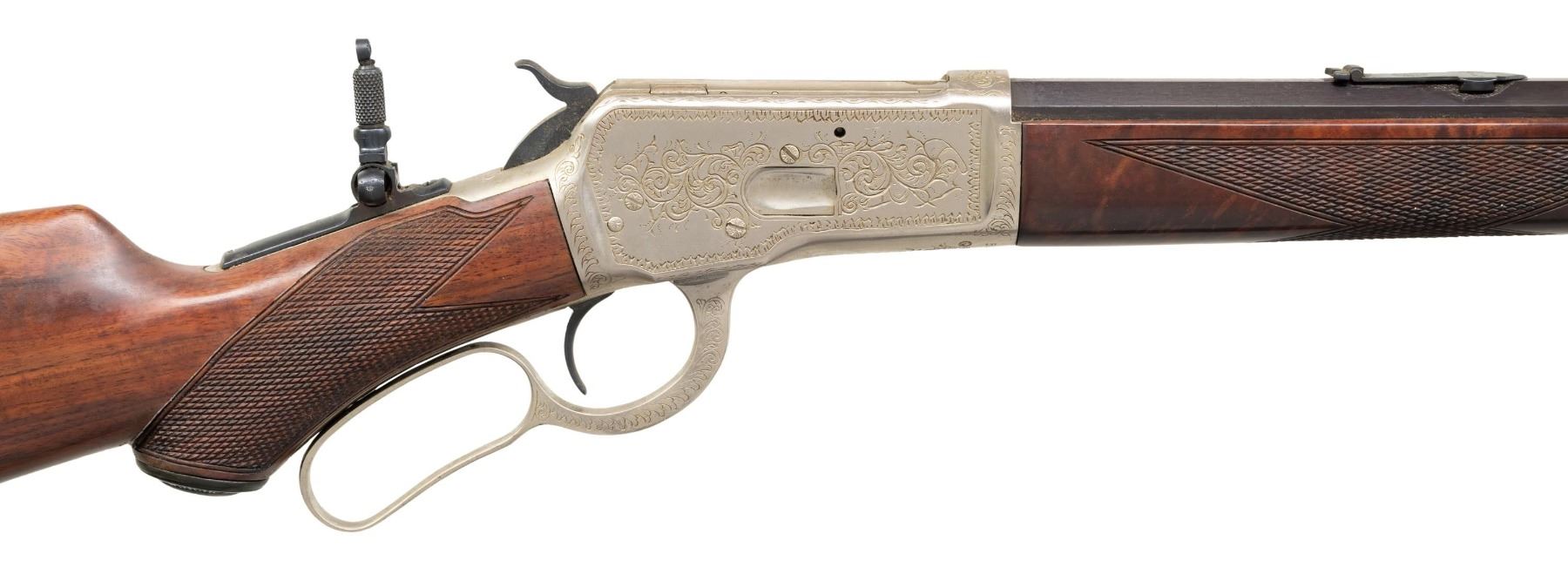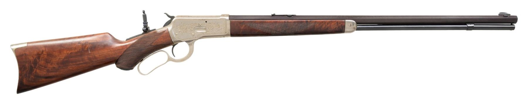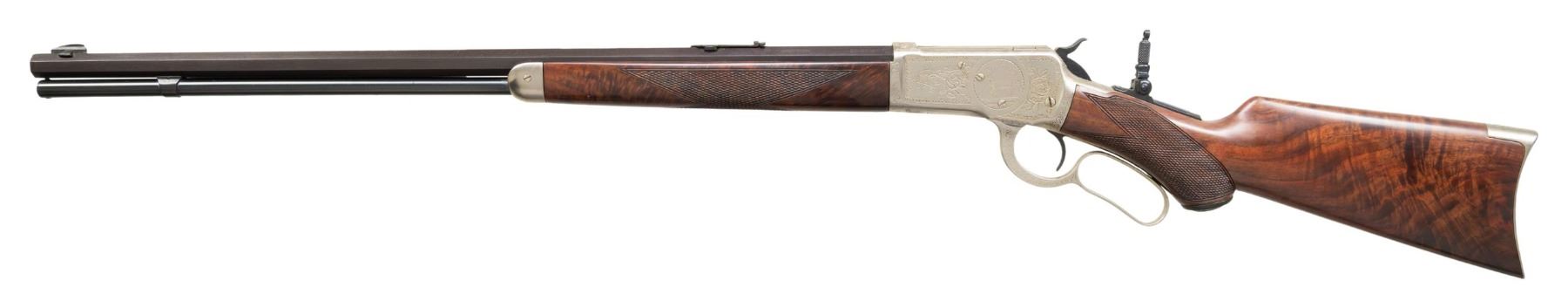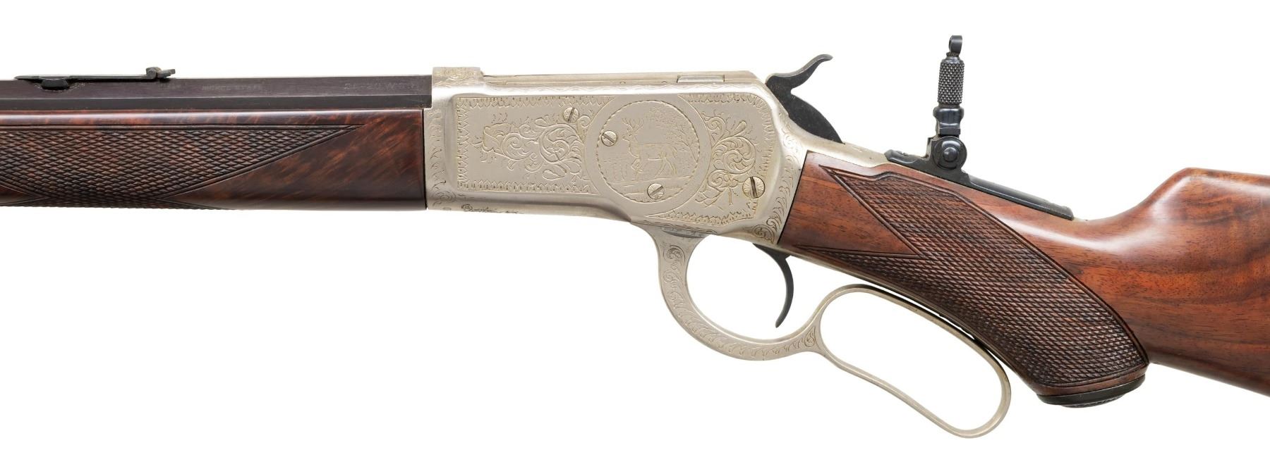 RIFLE. Cal. 25-20. S#. 505790. Bbl. 24" octagon. Aftermarket sights consist of brass blade Sheard front, Marble Express rear and combination tang sight. Full length replacement mag. tube. Bright finished action has custom hand engraving similar to factory style 9. Foliate scroll engraving with fancy borders features a game scene with a mule deer buck on the left side. Custom replacement forend and hard rubber capped pistol grip stock of fancy Claro Walnut. Features include crescent steel buttplate and style H checkering. Left inside of lower tang is marked with assembly no. "7596" and wood grade marking "X". Mfg. 1909. CONDITION: reblued bbl. shows spotted surface corrosion and light pitting. Replacement mag. has good blue. Bright finished action shows spots of light pitting. Replacement wood has good finish. Sound action. Dark lightly pitted bore. (25-1302/DS). CURIO. $2,000-4,000.