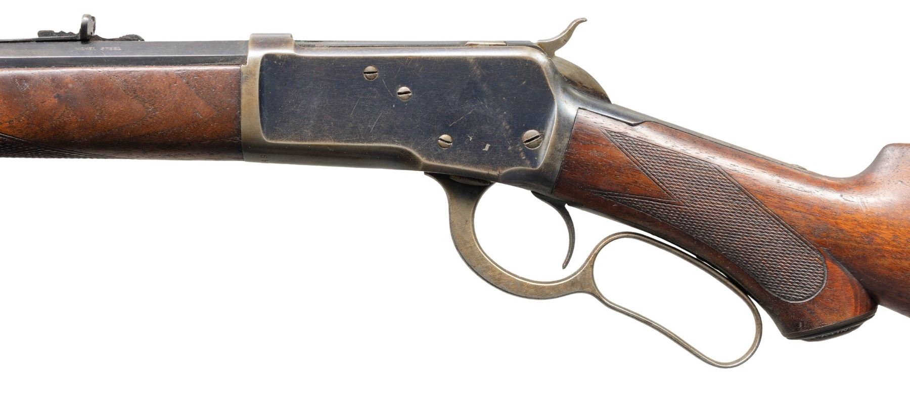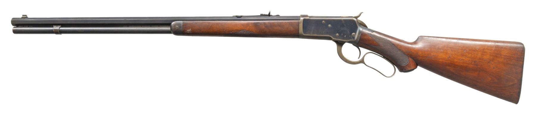 Cal. 38 WCF. S# 252849. Mfg. 1905. Bbl. 24" Octagon with replacement dovetailed white bead front sight, elevator adjustable sporting rear sight. "Manufactured by the Winchester Repeating Arms Co. / - New Haven, Conn. U.S.A. Pat. Oct. 14. 1884 -" marked top flat. Full mag. Plain trigger. Lower tang marked "18920 CH". Style "I" checkered pistol grip walnut stock set that terminates with a checkered steel shotgun buttplate that is marked "5933" on the reverse. The butt is marked with the matching "5933" under the buttplate. Winchester Repeating Arms hard rubber pistol grip cap. CONDITION: overall good. Bbl retains approx 85% original bluing with thinning finish, some high edge/muzzle wear and a moderate freckling of old oxidation. The mag tube is in similar condition with a small dent. Receiver finish is thinning in the carry areas with the exposed metal having an even grey/brown patina with scattered handling marks. The stock set has scattered handling marks, scratches and some moderate dings. Bright bore showing some wear to the rifling and some minor pits. (25-1307/ZAL). CURIO. $1,500-2,000.
