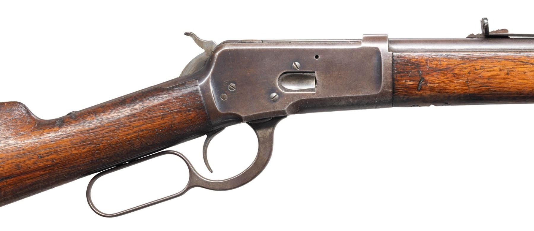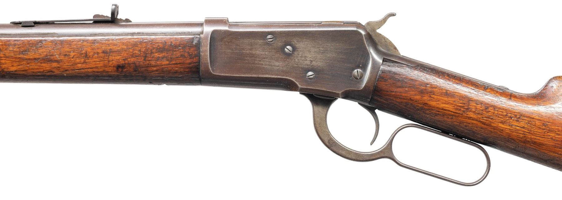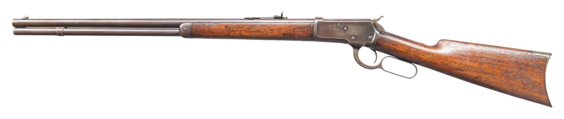 Cal. 44 WCF. S# 35488. Bbl 24" rnd with sporting sights. Full length mag. Forearm and straight grip walnut stock with crescent steel buttplate. Mfg. 1893. CONDITION: metal has faded to brown showing small dents and marks. Wood has added finish over roughed scrape appearance with dents and marks. Both sides of stock are chipped along with top tang. Good mechanics. Lightly pitted bore retains sound rifling. (01-28177/DS). ANTIQUE. $1,200-1,600.