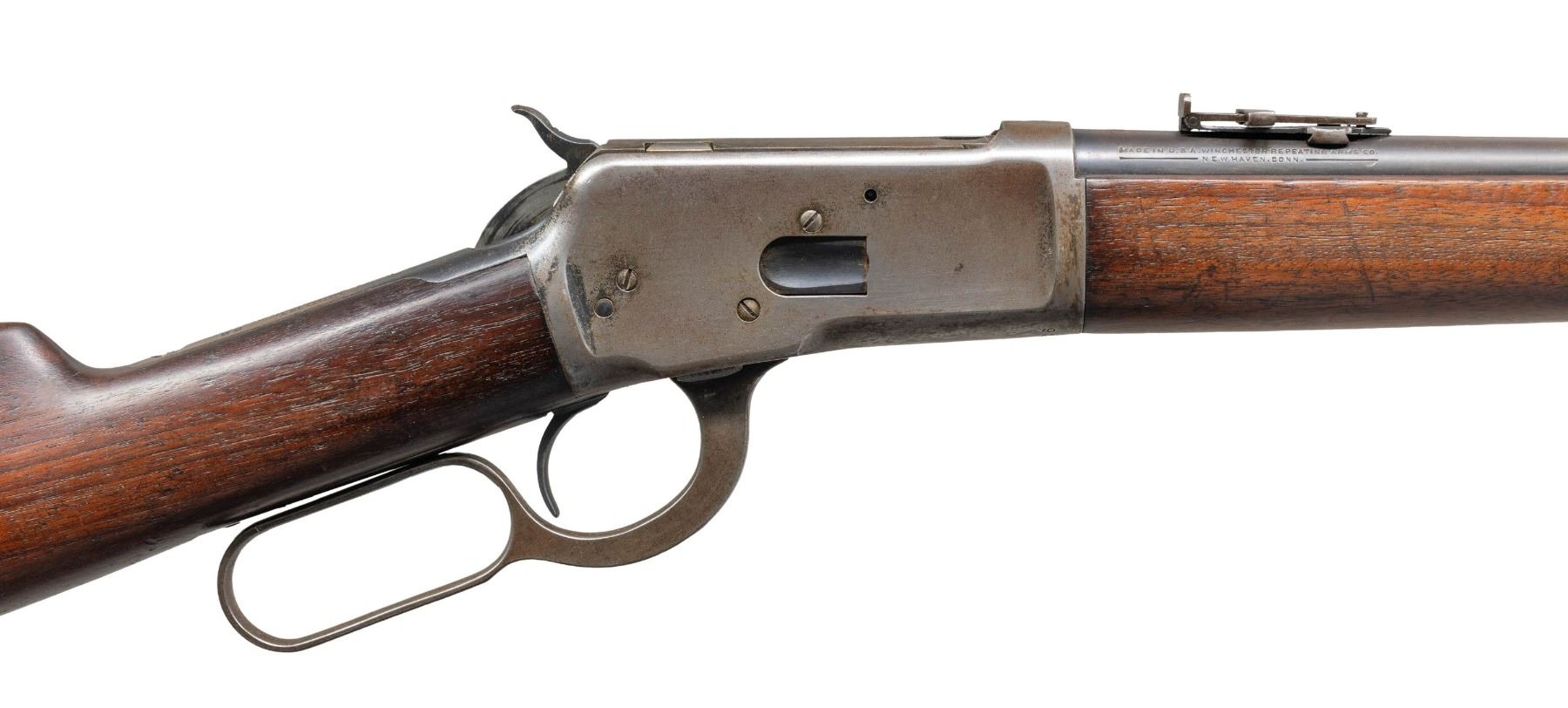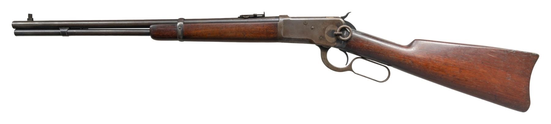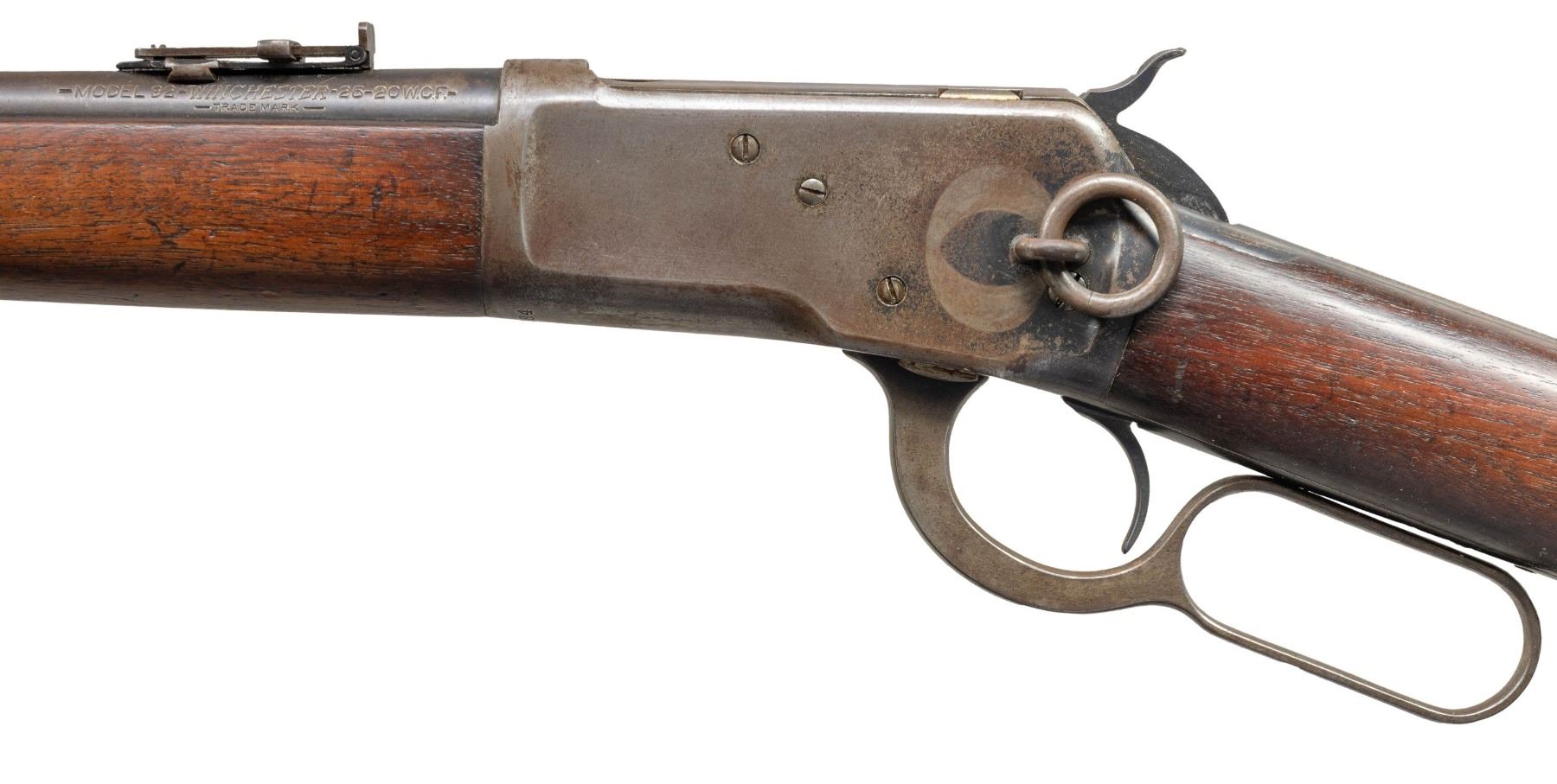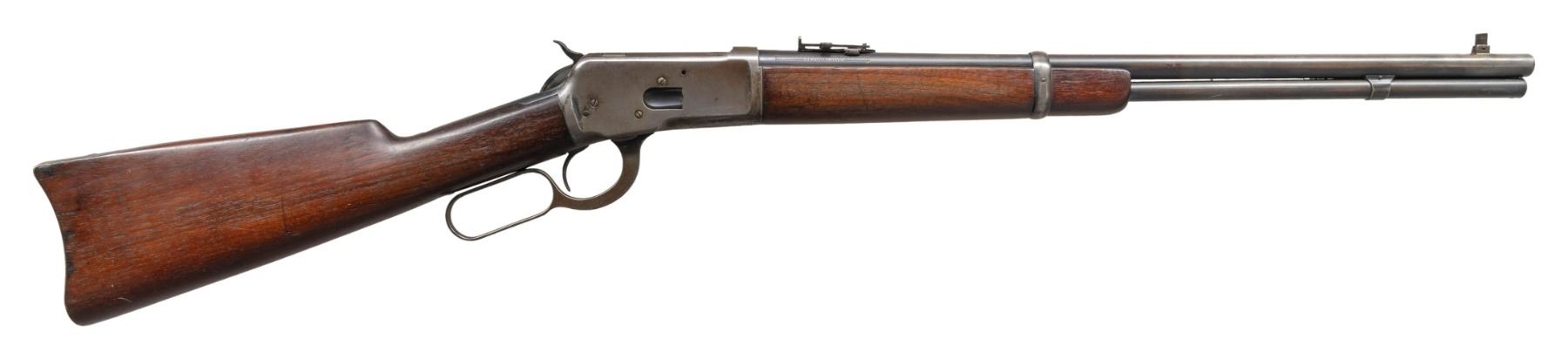 Cal. 25-20 WCF. S# 937084. Mfg. 1925. Bbl. 20" with pinned carbine blade front sight (replacement blade). Carbine rear sight. Bbl marked "-Model 92 W- Winchester-25-20 W.C.F.- / -Trademark-". Uncheckered straight grip walnut carbine stock set held with single barrel band and terminated with a smooth steel carbine buttplate. CONDITION: overall fair with bbl finish thinning to approx 30% coverage with the exposed metal finish turning to a light grey patina and carrying minor handling marks and light scratches. Receiver finish only remains in the protected area with approx 15% coverage with the predominance in the upper tang area behind the hammer. Loading gate retains 50% of its blued finish. Crisp markings. The stock set is good and caught a light sanding and refinish showing some scratches and scattered light handling marks. Bore shows some light frosting, mild pitting and distinct sharp rifling. (25-1321/ZAL). CURIO. $1,000-1,500.