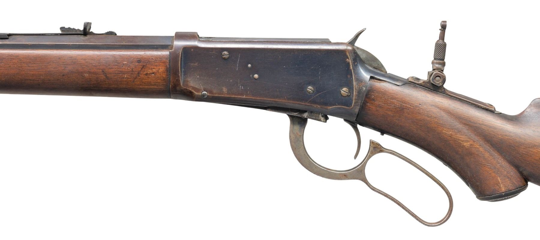 ACTION RIFLE. Cal. 32-40. S# 190688. Mfg. 1903. Bbl. 24" part rd - oct. with Lyman bead front sight (bead missing), elevator adjustable sporting rear sight. "Manufactured by the Winchester Repeating Arms Co. / New Haven. Conn. U.S.A. Patented August 21. 1894." Marked on the top flat. Button mag. Plain trigger. Lyman No.1 2nd variation tang sight. Lower receiver tang marked "17331 CH". Plain pistol grip walnut stock set with replacement blued crescent smooth buttplate & Winchester Repeating Arms hard rubber pistol grip cap. The butt is marked "94 / 17331" under the buttplate. CONDITION: overall good. Bbl has thinning original blue with approx 70% coverage showing some high edge wear, a few dings at the muzzle, and some scattered light freckled oxidation. Receiver has thinning finish in the carry areas with exposed areas turning to a brown patina with some evidence of old touch up bluing. The original receiver blue has approx 70% coverage with some scattered light handling marks and light scratches. The stock set has been sanded and refinished and the replacement buttplate is not a great fit. Nose cap has thinning finish with the balance showing a brown patina. Lever has traces of case coloring in the protected areas. Loading gate retains 30% fire blue. Buttplate has 95% reblued finish. Bore shows light frosting and some scattered pitting with distinct rifling. (25-1311/ZAL). CURIO. $1,000-1,500.