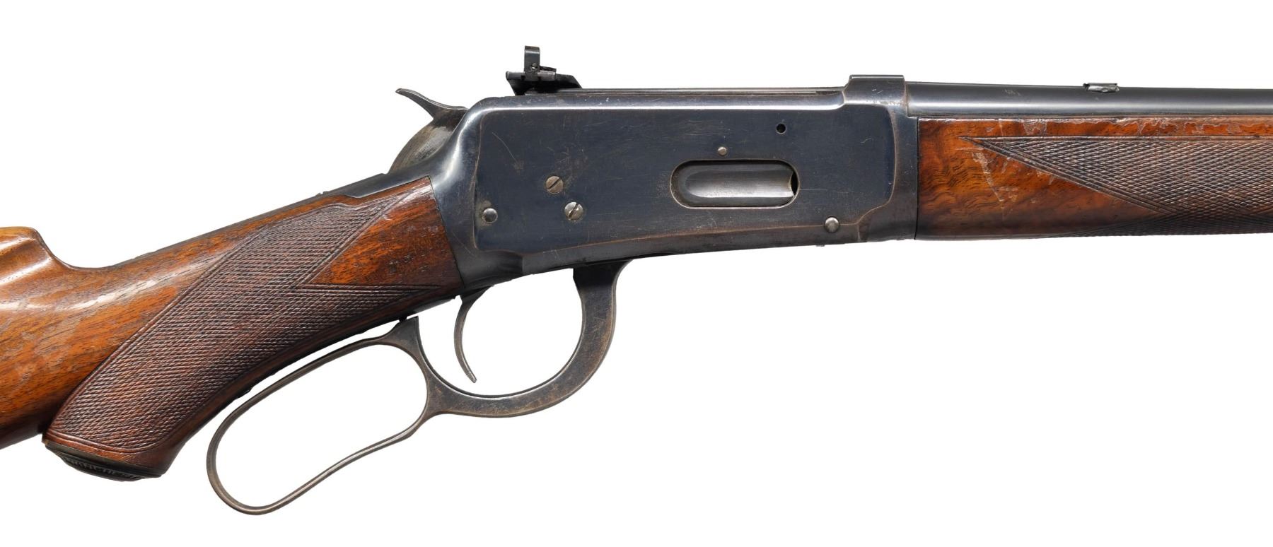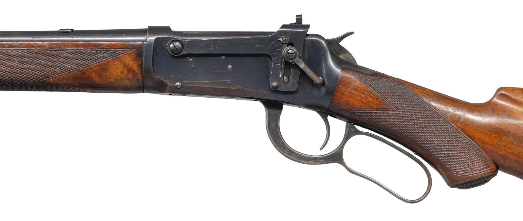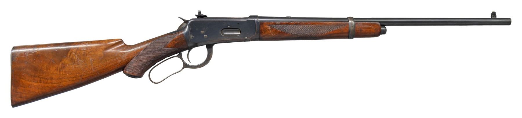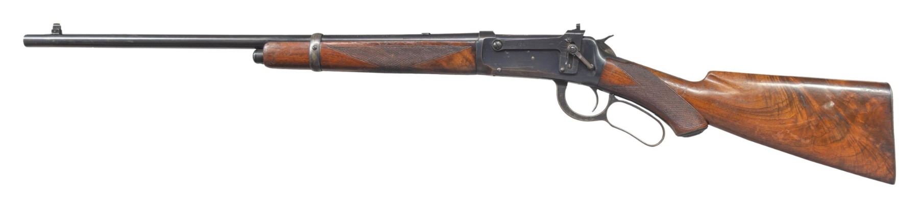 Cal. 32 WS. S# 936034. Bbl 20" carbine style. Replacement Sheard brass bead pinned blade front sight, filler in rear dovetail with a "Climbin Lyman" receiver sight. Button mag. Band fastened carbine forearm and hard rubber capped pistol grip stock of fancy walnut with style "H" factory checkering. LOP: 13 1/8" to a smooth steel buttplate. Top tang channel of stock is stamped with assembly number "123". Mfg. 1923. CONDITION: bbl and action retain over 80% lightly worn blue showing handling marks, edge wear and small spots of light pitting. Left side of receiver has a series of small dents below the Lyman sight. Original wood finish shows spots of finish loss with numerous scratches, loss and dents. Sound action. Very good bright bore. (25-1379/DS). CURIO. $4,000-6,000.