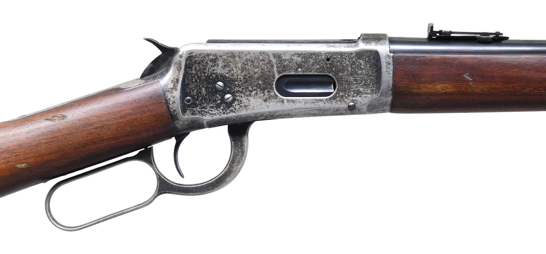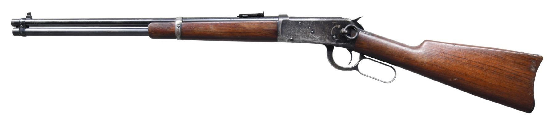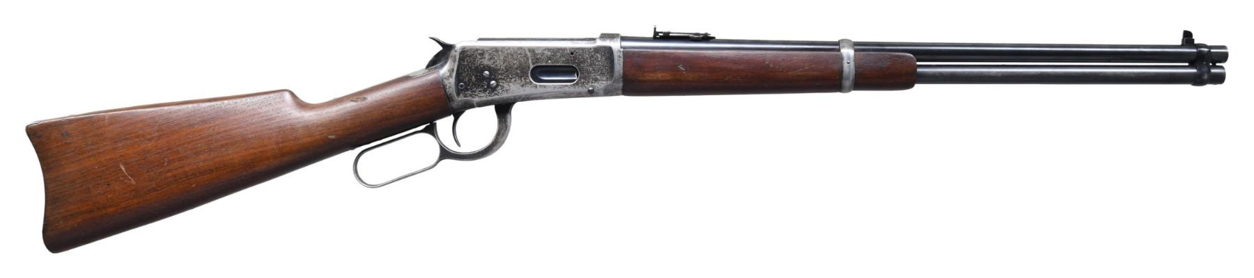 CARBINE IN DESIRABLE 25-35 WCF. Cal. 25-35 WCF. S# 969223. Bbl. 20" round with carbine post front sight and Carbine leaf rear. The 25-35 chambering remains one of the most desirable calibers amongst Winchester 1894 collectors today. "ARMAX" survey indicates that from S# 1-353,999, only 10.4% of all model 1894 Winchesters were mfg in 25-35. Full length mag. Blue finish. Left side of action has a saddle ring. Band fastened forearm and straight grip gumwood stock with steel carbine buttplate. Mfg. in 1925. CONDITION: bbl. and mag. tube retain 80% lightly worn blue showing scratches and marks with wear spots. Action has 40% blue showing spotted flaking. Wood has lightly worn original finish showing scratches marks and dents. Mechanically fine. Bore bore with strong rifling. (25-1743/BH). CURIO. $2,500-3,500.