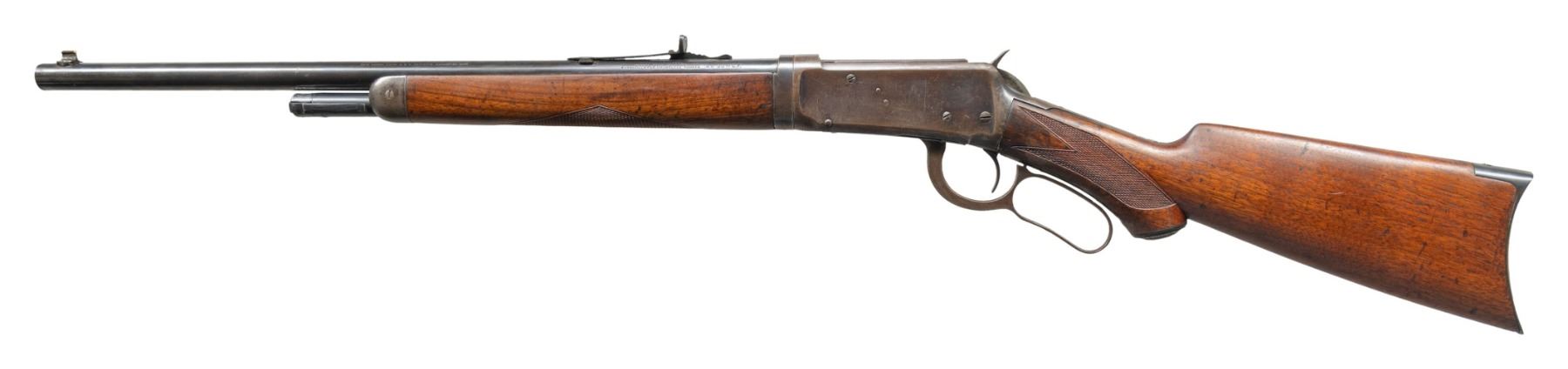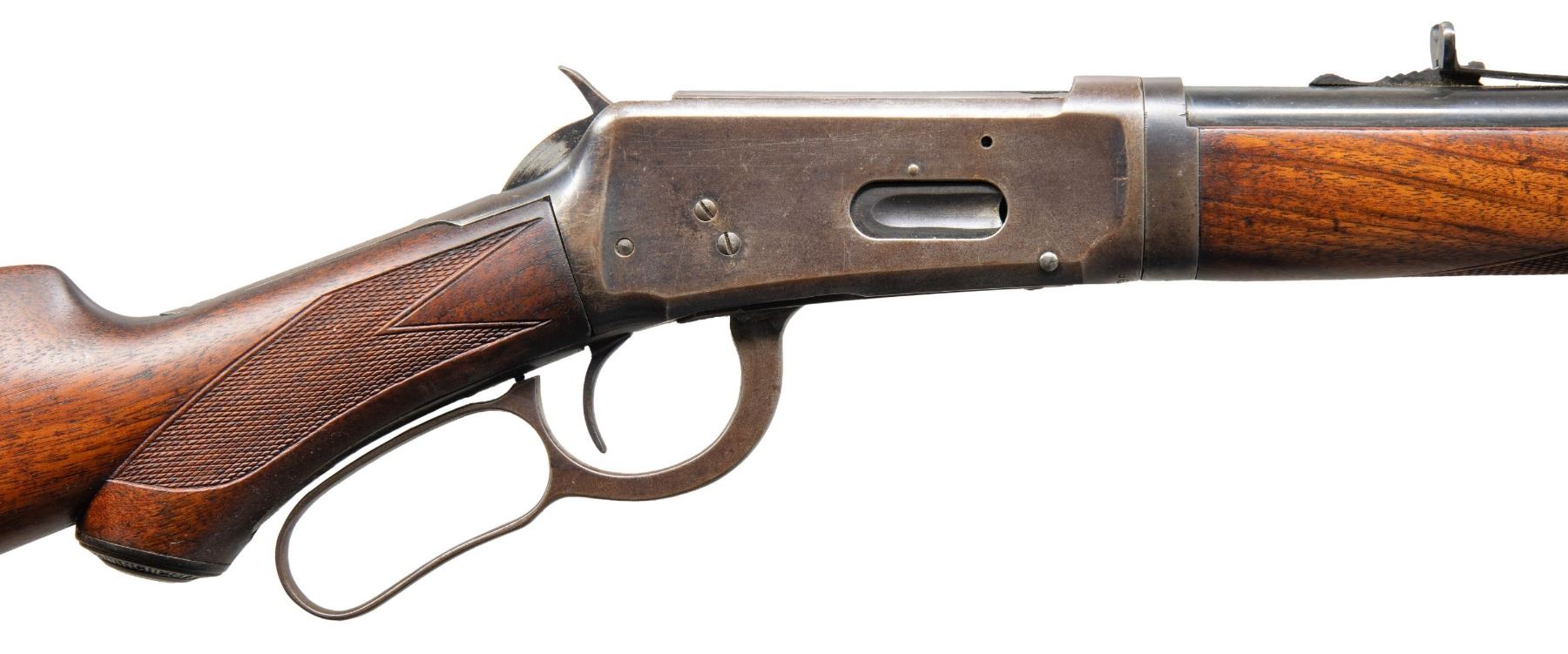 RIFLE. Cal. 25-35 WCF. S# 963345. Mfg. 1923. Bbl. 20" rd with shallow dovetailed Lyman white bead front sight and elevator adjustable semi buckhorn rear sight. "Manufactured by the Winchester Repeating Arms Co. / New Haven. Conn. U.S.A. Patented August 21 1894" found directly center left on barrel. "-Nickel Steel Barrel- / Especially for smokeless powder - .25-35 W.C.F." found at the left side of breech end of bbl. Takedown action with "SHC" found stamped on the bbl portion of the takedown. Plain trigger. "29 (dot)(dot)" found on the upper tang. Style I checkered pistol grip stock set with "29" found in the upper channel of the stock and under the buttplate. The stock terminates with a reblued possible replacement crescent steel butt plate and Winchester Repeating Arms pistol grip cap. CONDITION: overall condition is good with the bbl retaining 85% of its original bluing that is thinning and showing scattered handling marks. Receiver finish has thinned to about 20% with most being in the protected areas. The balance has turned to a brown/grey patina with scattered handling marks and light scratches. The stock set has been refinished and the checkering is freshly cut. Bore shows light frosting with sharp rifling. (25-1325/ZAL). CURIO. $1,500-2,250.