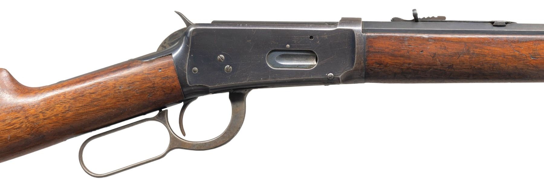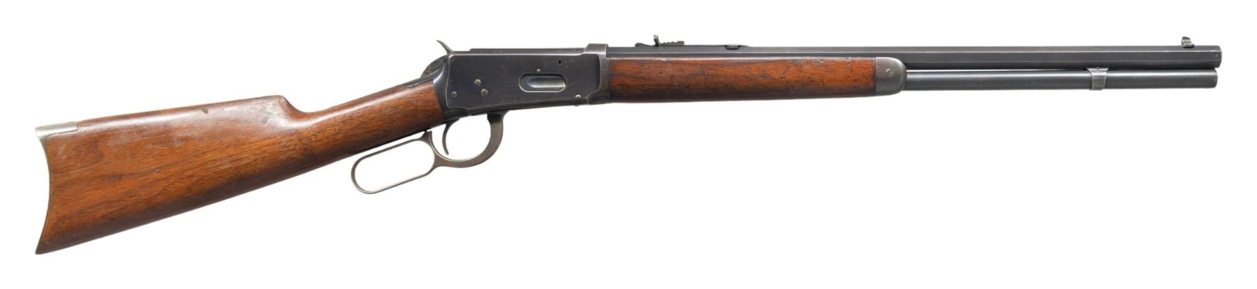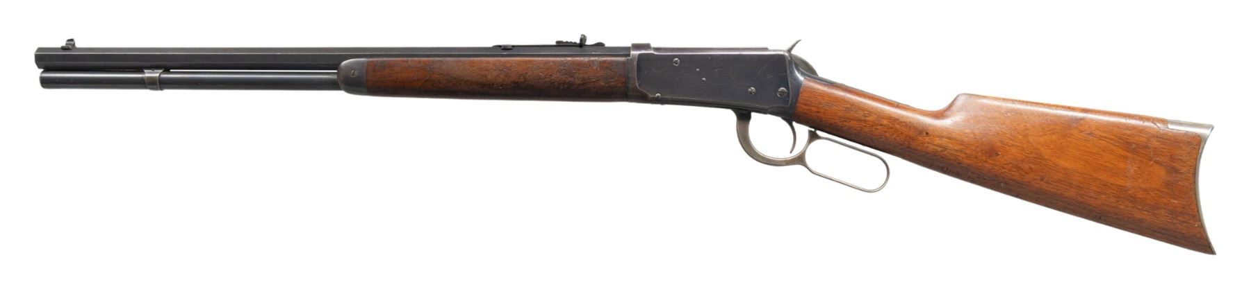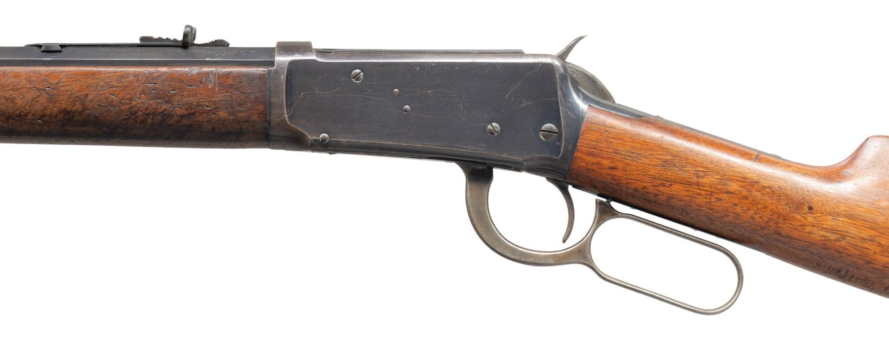RIFLE. Cal. 30 WCF. S# 403898. Bbl. 20". Model 1894 lever action short rifle mfg. by Winchester in 1907. Left quarter flat of the octagonal bbl. is marked with Winchester's mfg. and patent information, with the cal. designation marked towards the breech. Upper receiver tang is marked "MODEL 1894/ -WINCHESTER-/ TRADEMARK". Metal components exhibit a blue finish overall, save for on the hammer and lever, which exhibit a case colored finish. Plain wood forearm and straight grip stock with crescent steel buttplate. Dovetailed blade front sight with dovetailed U-notch rear sight. Full length mag. tube. CONDITION: metal components retain large amounts of their original factory blue finish, showing areas of wear and thinning that are fading to gray and brown patinas (most notably on carry area of receiver), light to mild edge wear, scattered scratches and superficial handling marks, as well as scattered spots of light to mild surface oxidation overall. Hammer and lever retain traces of their original case colored finish in protected areas. Buttplate has been cleaned, exhibiting scattered spots of dark oxidation and pitting. Dark bore, exhibiting consistent mild to moderate pitting, while retaining good, albeit worn rifling throughout. Proper manual mechanics. Wood furniture shows numerous scattered superficial marks and impressions from handling and storage, but otherwise remain sound. (25-1336/MLW). CURIO. $1,000-1,500.