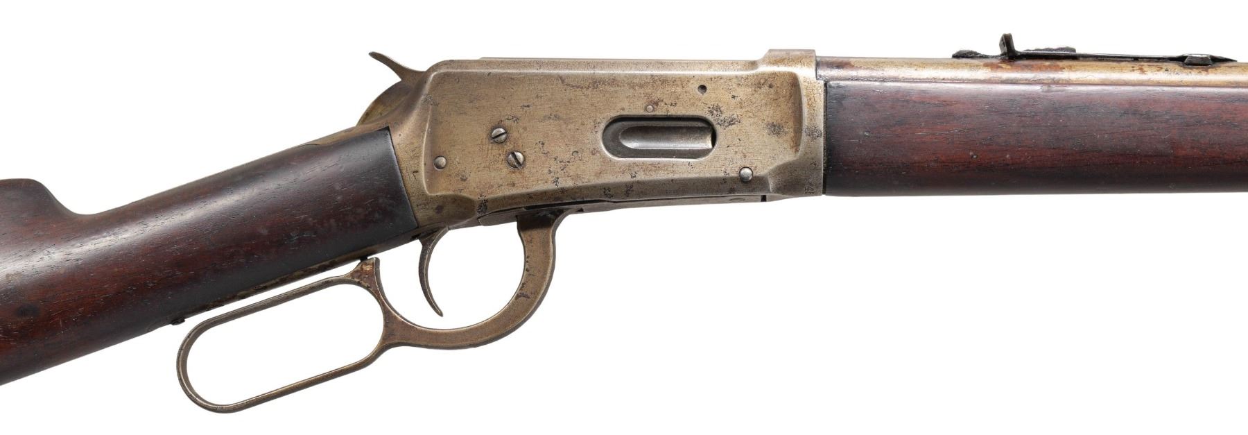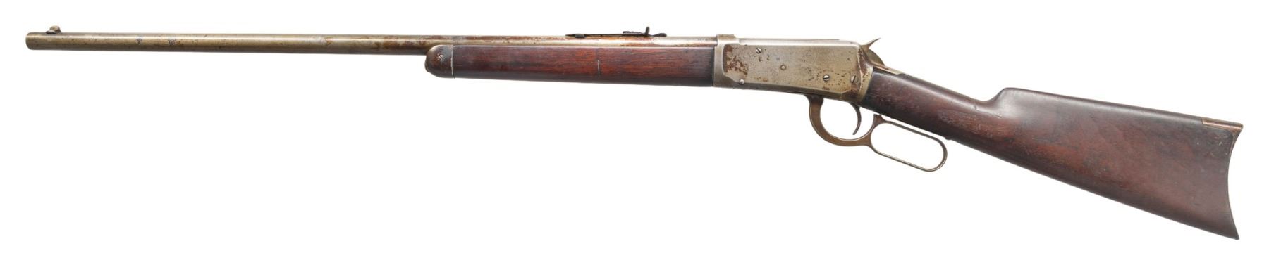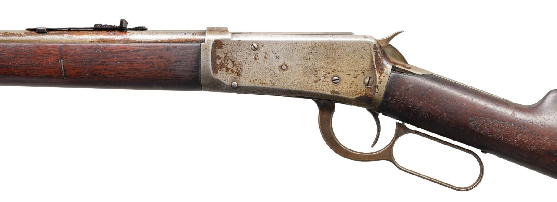 Cal. 32-40. S#. 458571. Bbl. 26" round. Sporting front with replacement flat top sporting rear sight. Half length mag. Walnut forend & stock with crescent steel buttplate.1908 mfg. CONDITION: metal finish has a faded gray appearance with spots of light pitting showing spots of stock finish over spray. Heavily sanded wood has a dark appearance showing scratches & marks. The stock has chips on both sides of the top tang. Sound action. Dark pitted bore. (25-5297/DS). CURIO. $1,000-1,500.