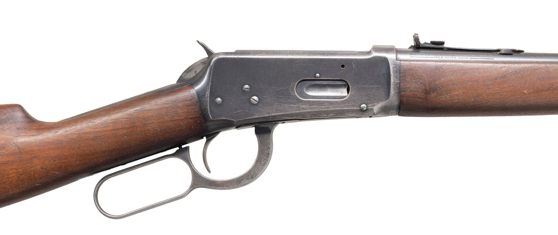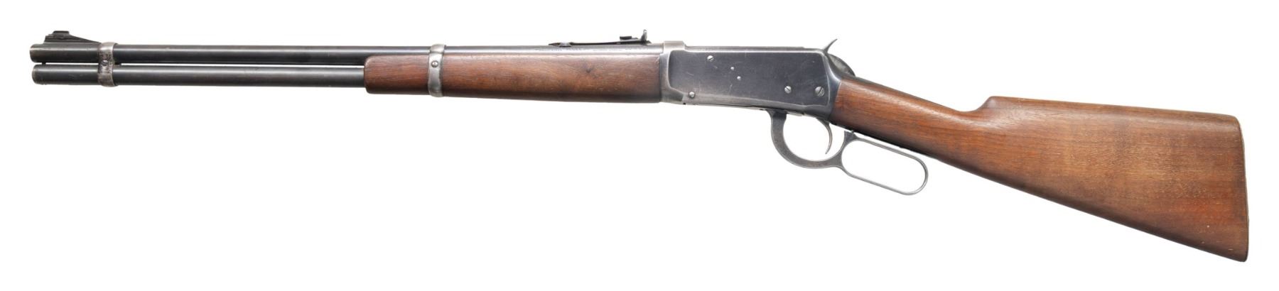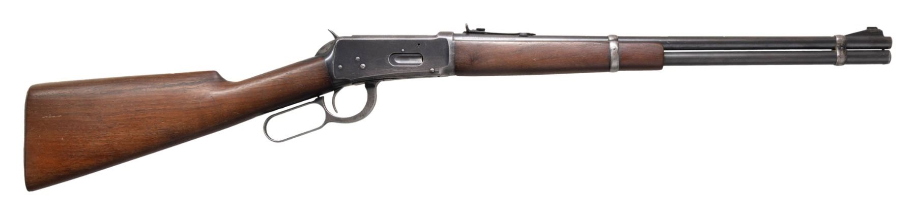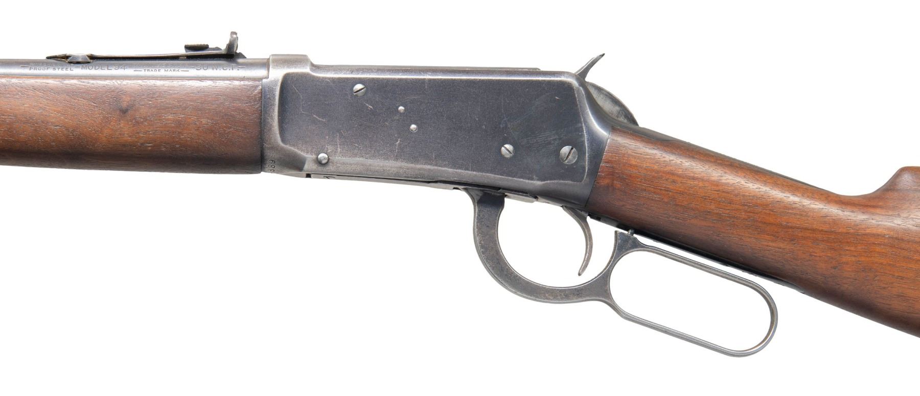 Cal. 30-30. S# 1194389. Bbl. 20". Model 94 lever action carbine mfg. by Winchester in 1939. Left side of the bbl. is marked with the model and cal. designations, with Winchester's mfg. information marked on the right. Metal components exhibit a blue finish overall. Plain wood forearm and straight grip stock with grooved steel buttplate. Ramped aluminum beaded blade front sight with dovetailed U-notch rear sight. CONDITION: metal components retain large amounts of their original factory blue finish, exhibiting areas of wear and thinning that are fading to gray patina, with areas of light surface oxidation and pitting present overall. Buttplate exhibits patches of mild oxidation. Near mirror bore, exhibiting some scattered spots of light to mild pitting, while retaining well defined rifling throughout. Proper manual mechanics. Wood furniture shows scattered marks and impressions from handling and storage, but otherwise remains sound. PROVENANCE: From the Buckstix Collection. (25-6406/MLW). CURIO. $600-900.