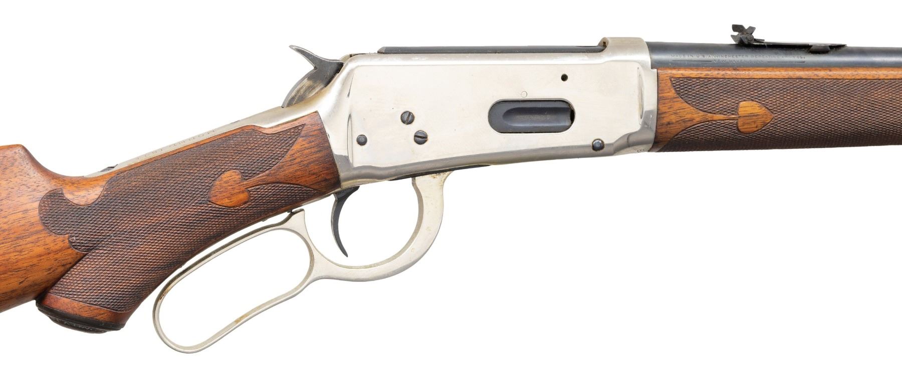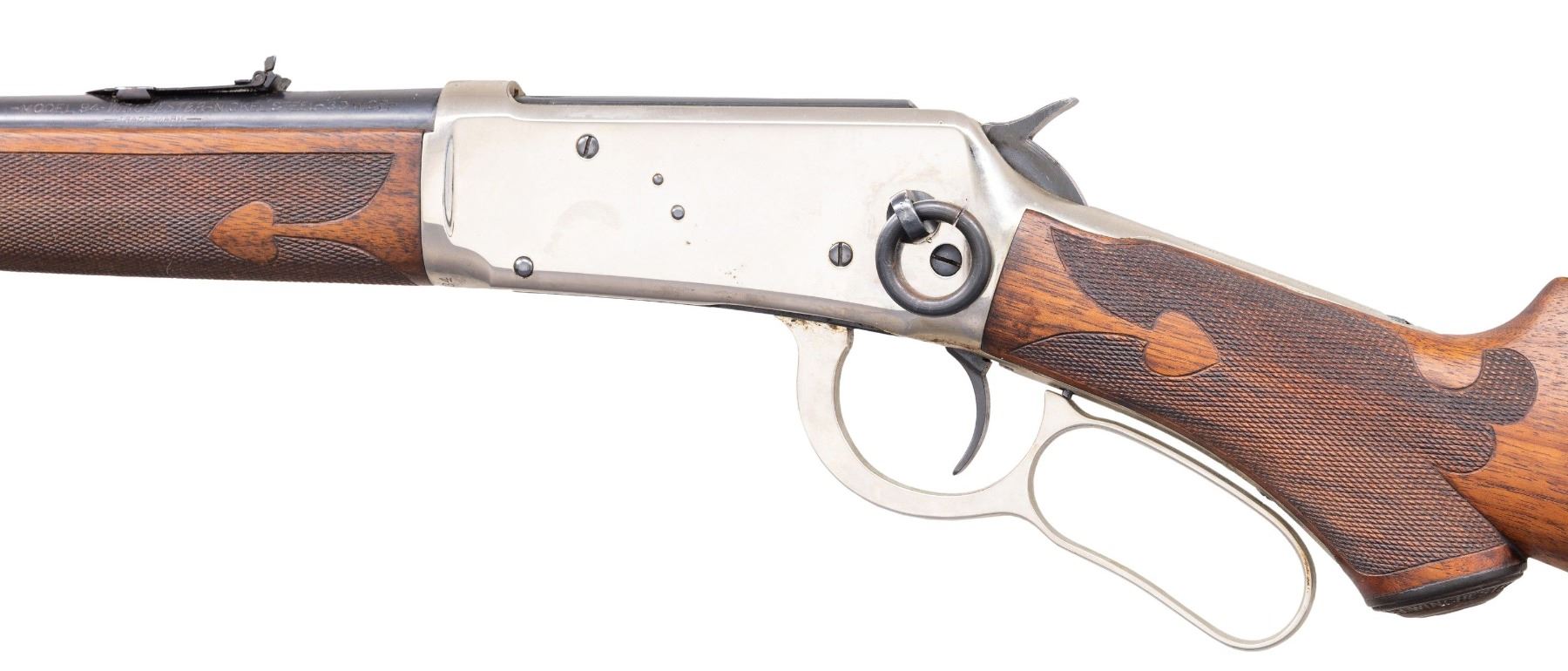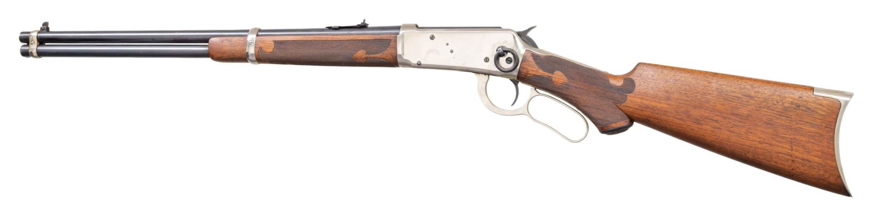 CARBINE. Cal. 30 WCF. S# 840834. Bbl. 20" carbine style. Full length mag. Pinned blade front with express style rear sight. Blued bbl. & mag. tube. Action, bbl. bands & crescent steel rifle style buttplate have and added nickel finish. Left side of receiver has a saddle ring. Special order hard rubber capped pistol grip stock. Left inside lower tang is marked with assembly # 748 followed by "O". Butt of the stock has matching assembly # 748. Stock & forend have added spade pattern hand checkering. S# indicates 1919 mfg. CONDITION: 90% bbl. & mag blue show light scratches. Action & fittings retain over 98% renickeled finish. Sanded wood has a non-gloss finish showing small chips along the top tang. Sound mechanics. Good bore. (25-1388/DS). CURIO. $500-800.