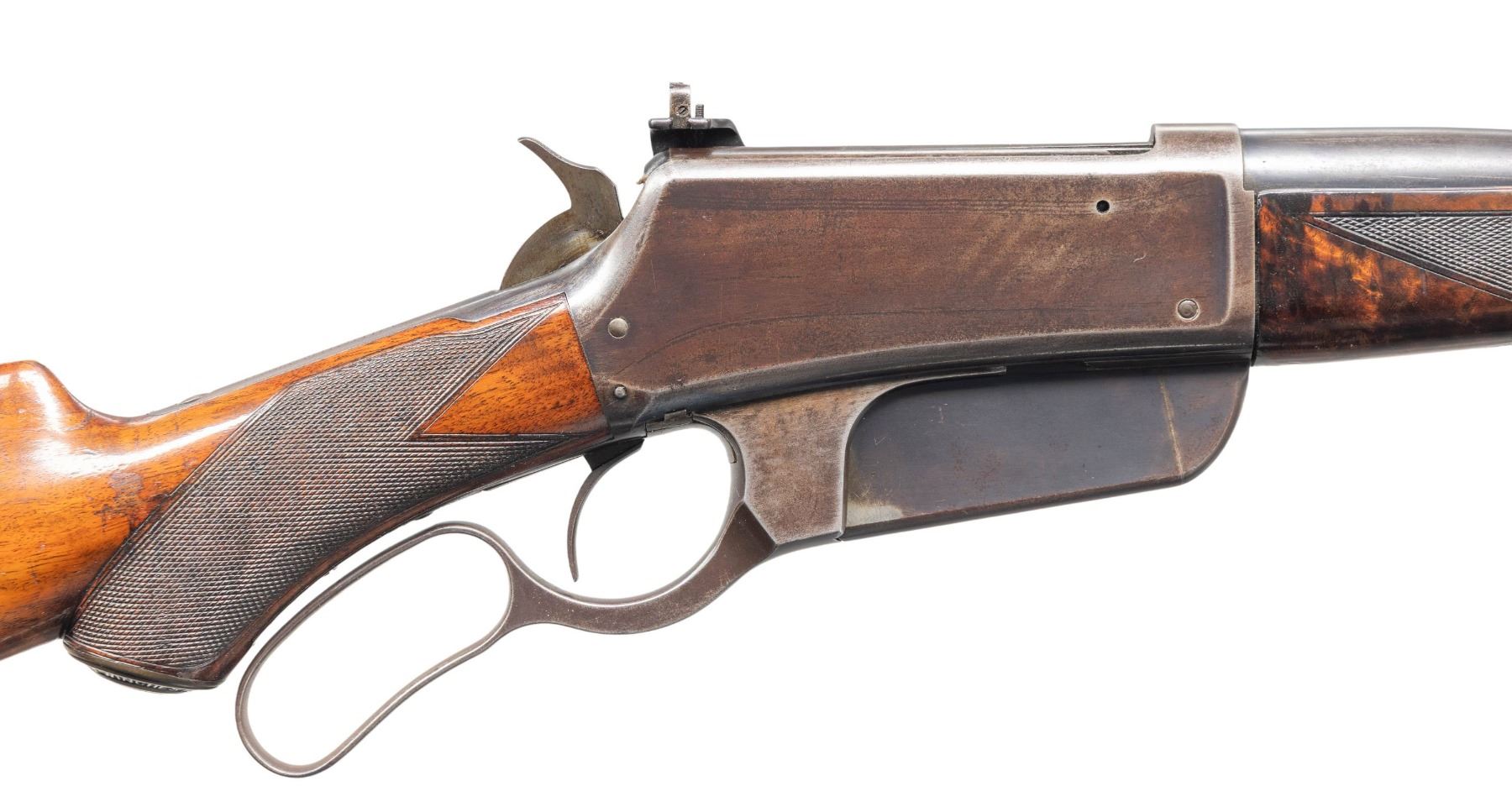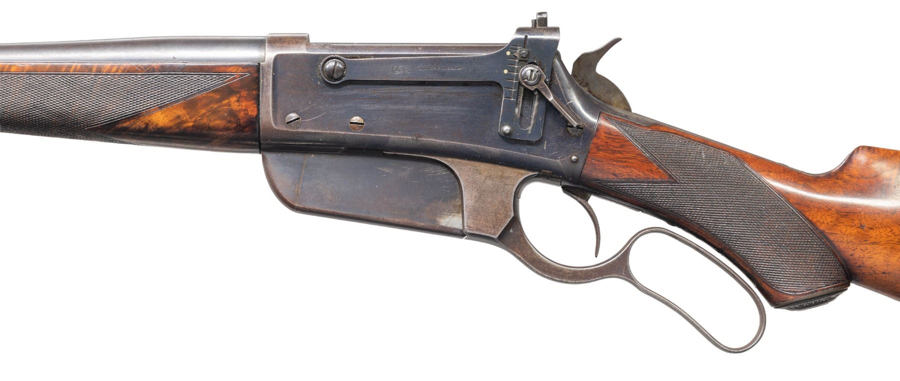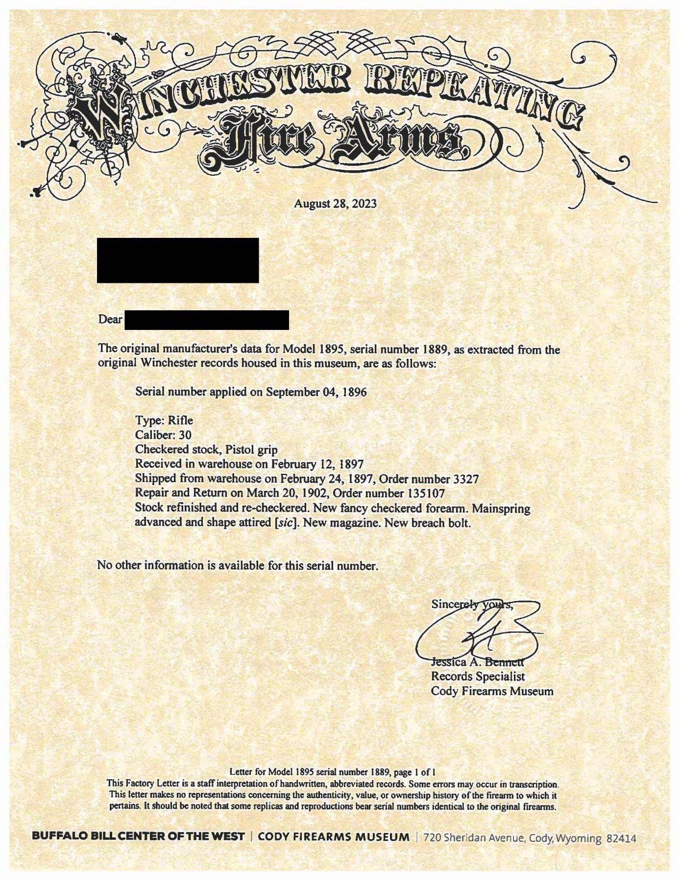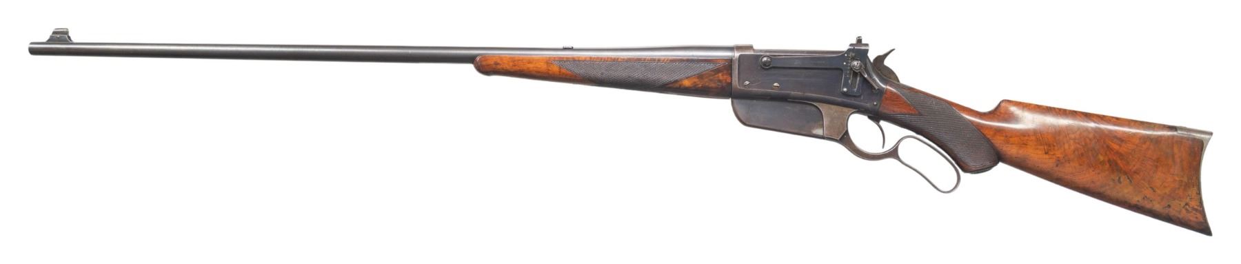 MODEL 1895 DELUXE "FLATSIDE" LEVER ACTION RIFLE. Cal. 30 U.S. (30-40 Krag. S# 1889. Bbl. 28" with ramp mounted blade front sight, blank in rear dovetail and Climbin' Lyman receiver sight. Nicely figured walnut pistol grip stock & schnabel tipped forend with ebony insert have style "H" checkering. The left lower tang marked "3286 CF". Stock marked "3286" & "95" under the buttplate. UNATTACHED ACCESSORIES: Winchester factory letter stating the following: Serial number applied September 04, 1896 / Type: Rifle / Caliber: 30 / Checkered stock, Pistol grip / Received in warehouse on February 12, 1897 / Shipped from warehouse on February 24, 1897, Order number 3327 / Repair & Return on March 20, 1902, Order number 135107 / Stock refinished & recheckered. New fancy checkered forearm. Mainspring advanced and shape attired [sic]. New magazine. New Breech bolt. CONDITION: good overall. Metal parts retain approx. 30% original blue, turning brown / patina with even mild freckling and scattered light oxidation. Wood retains 90%+ factory varnish with scattered spots of flaking, scratched & dents. Very good bore shows strong rifling. Mechanically excellent. (01-28740/BH). ANTIQUE. $6,000-9,000.