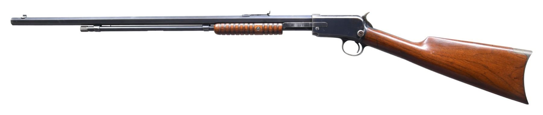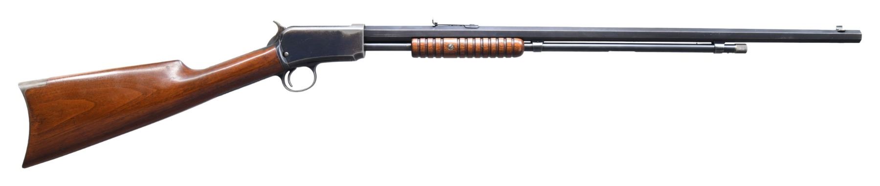 Cal. 22 WRF. S# 139441. Bbl. 24". Model 1890 slide action rifle mfg. by Winchester in 1902. Top flat of the octagonal bbl. is marked with Winchester's mfg. information, with the cal. designation marked at the breech. Metal components exhibit a blue finish overall, save for on the hammer, which exhibits a case color hardened finish. Plain wood straight grip buttstock, with grooved wood pump. Dovetailed blade front sight (rear of bead painted white), with U-notch rear sight. Upper assembly is properly unnumbered. CONDITION: metal components retain the majority of their original factory blue finish, exhibiting areas of light to mild wear and thinning (primarily on edges), with some superficial handling marks present overall. Receiver exhibits areas of wear and thinning that show through to gray patina. Buttplate retains a mostly gray and brown patina. Mirror bore, exhibiting what appears to be some scattered small spots or light pitting and/or oxidation, while retaining strong rifling throughout. Wood furniture exhibits scattered marks and impressions from handling and storage, but otherwise remain sturdy and serviceable. PROVENANCE: Estate of Russell Dickerman. (25-1813/MLW). CURIO. $500-800.