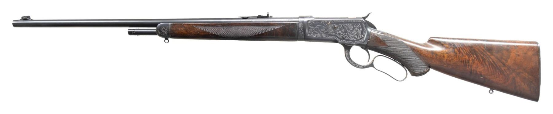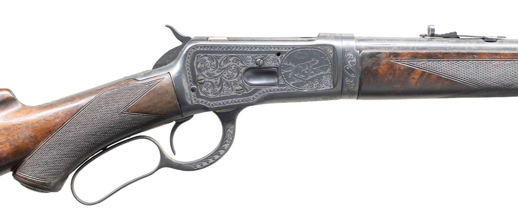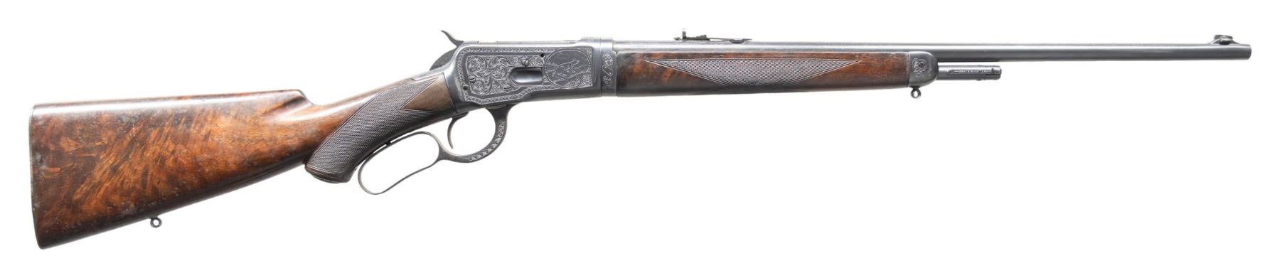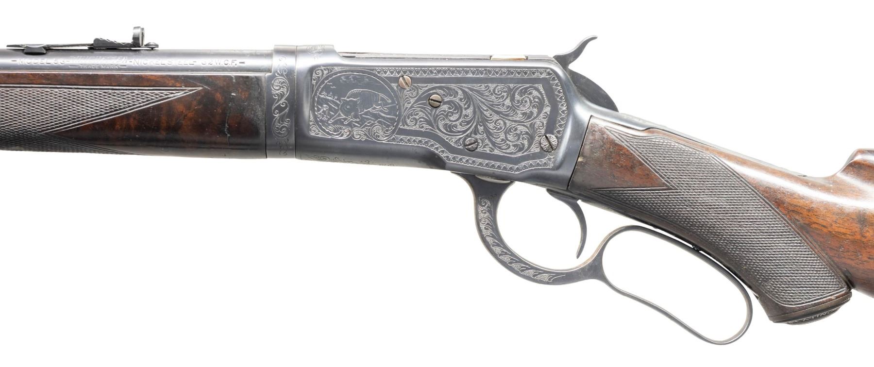 ACTION RIFLE. Cal. 32 WCF. S#. 580. Bbl. 22" tapered round of take down style. Half length mag. Ramp mounted blade front with Marbles elevator adj. rear sight. Beautifully upgraded rifle with generous coverage of after market hand engraving. Receiver sides have panels of vine type foliate scroll with punch dot back grounds and shaded borders featuribng heart shaped decorations. The right side circular scene features a fox. Left side scene depicts a charging wild bore. Matching engraving extends to upper & lower action areas, breech end of bbl., lever and the grooved steel buttplate. Forend & hard rubber capped pistol grip stock of fancy black walnut have style H checkering and Winchester sling eyes. Right inside of upper tang is stamped "11oo" Top tang channel stock has a pencil marking"QB M53". Mfg. 1924, 1st year of production. CONDITION: metal retains over 95% reblued finish. Refinished wood shows marks & mildew spots with an undersize fit at the action. Sound mechanics. The bore is generally bright with strong rifling. (25-1297/DS). CURIO. $2,000-3,000.
