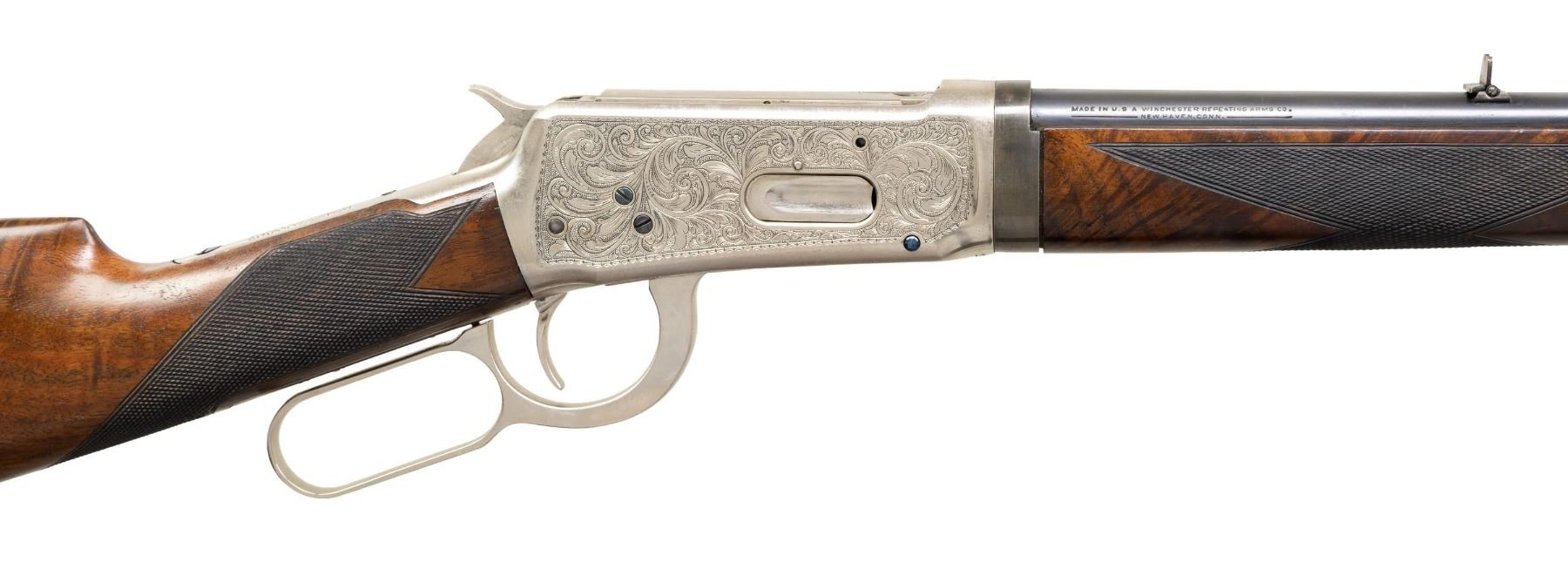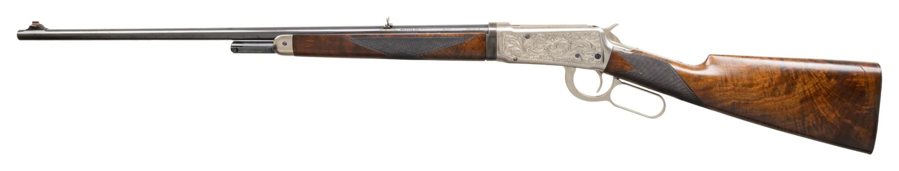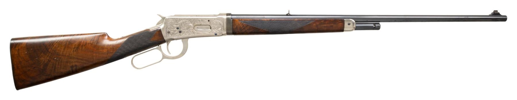 TAKEDOWN LEVER ACTION RIFLE. Cal. 30 WCF. S# 10066. Bbl 24" tapered round. Ramp mounted replacement front sight having a broken bead with a reverse mounted folding two leaf rear sight. Half length takedown mag. Bright finished action has full coverage custom engraving on both of its sides. Engraving consists of flowing scroll with punch dot backgrounds and decorative borders. Forearm and straight grip stock of fancy walnut have a grooved steel buttplate with custom style H hand checkering. Mfg. 1928. CONDITION: barrel, mag, buttplate and action screws retains 90% reblue finish. Action has bright finish showing small marks. Custom stocks have good finish and checkering with a few small scratches. Sound action. Good bright bore. (25-1384/DS). CURIO. $2,000-3,000.