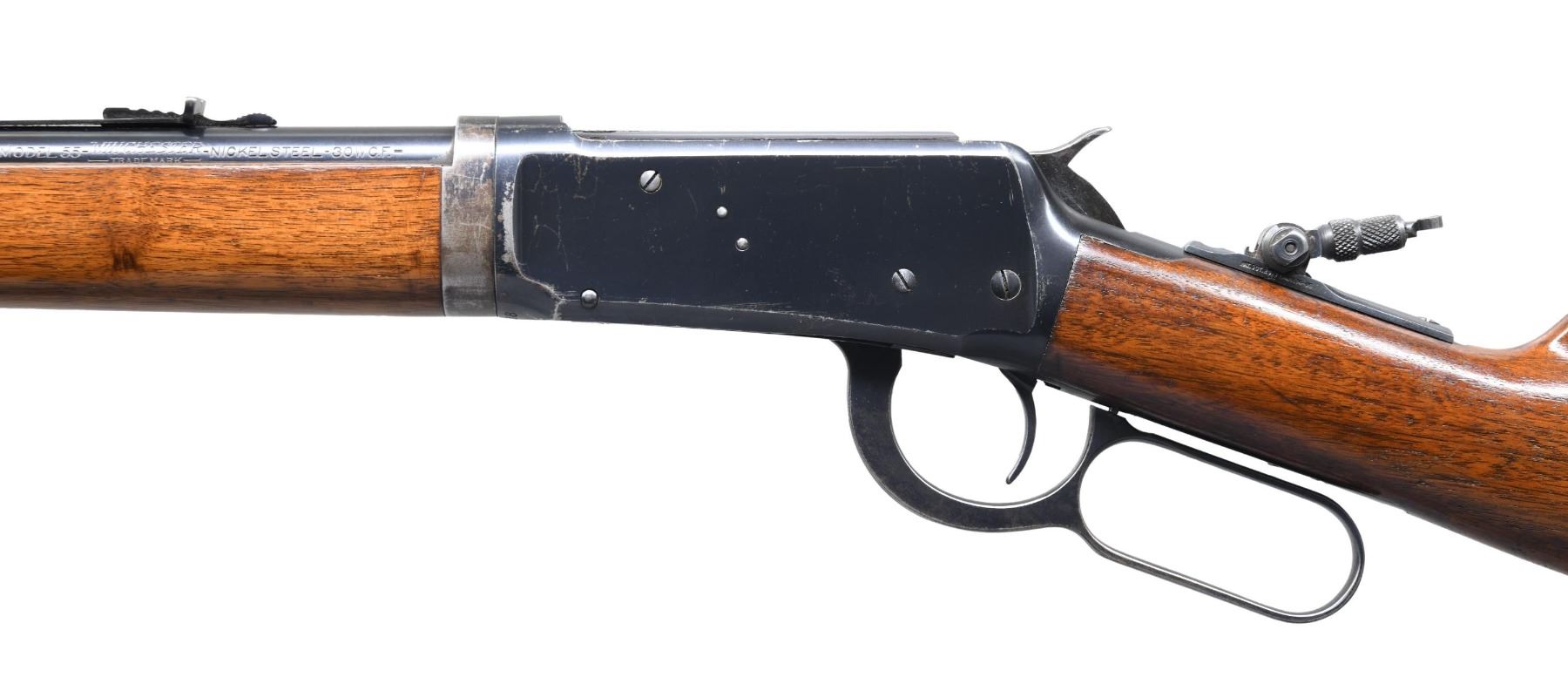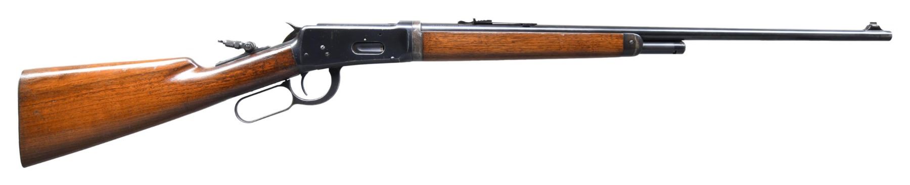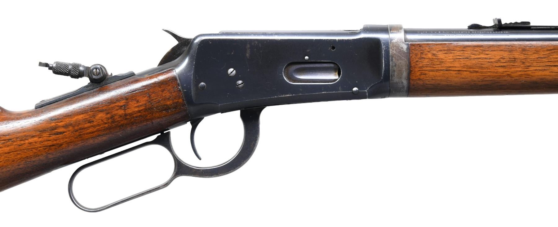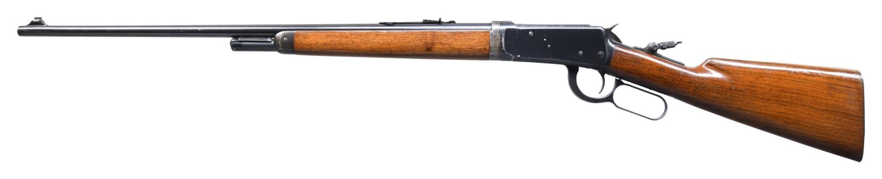 LEVER ACTION RIFLE. Cal. 30 WCF (30-30). S# 10588. Bbl. 24" tapered rnd. Ramp mounted Lyman bead front sight with flat top sporting rear sight and Marbles combination tang sight. Half length takedown mag. Blue finish. Walnut forearm and straight grip stock with grooved flat steel buttplate. Mfg. in 1929. CONDITION: typically found with flaked receiver finish due to the high nickel content of the time period, this nice example retains over 75% original blue, showing carry and edge wear with spots of flaking and handling marks. Original wood finish shows scattered light scratches and marks. Very good bright bore. (25-1737/DS). CURIO. $2,500-3,500.