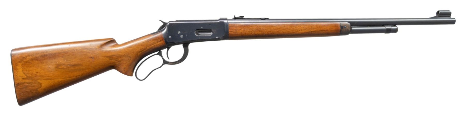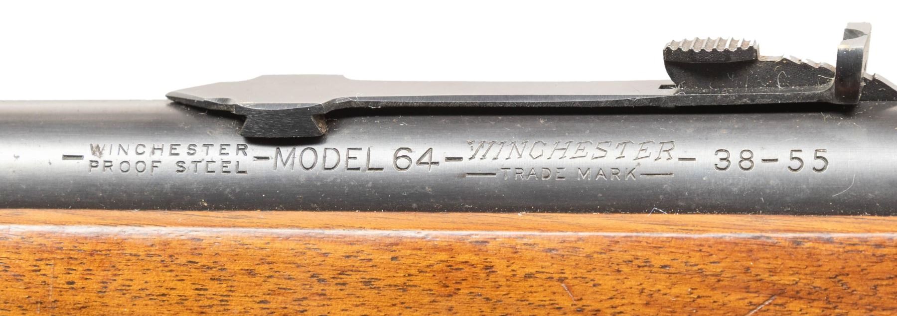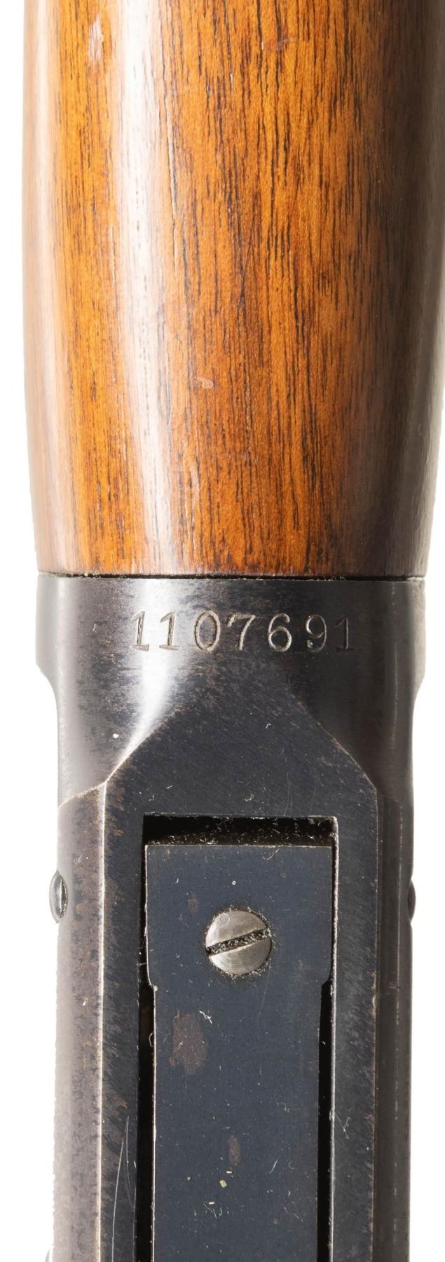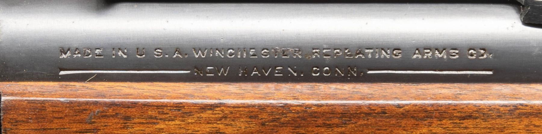 Cal. 38-55. S#. 1107691. Bbl. 20" round. Hooded ramp bead front with sporting rear sight. 2/3 length mag. Blue finish. Semi beavertail forend & pistol grip walnut stock with checkered steel buttplate. S#. indicates 1940 mfg. Bottom of bbl. stamped "38-55" and "36". CONDITION: over 90% original blue shows spots flaking to brown. Very good original wood finish shows scattered light marks. Bright near excellent bore. (25-1385/DS). CURIO. $2,000-3,000.