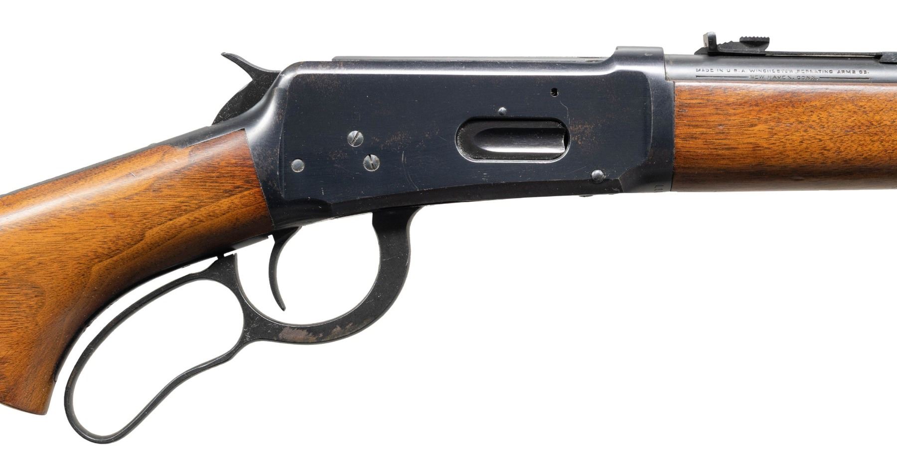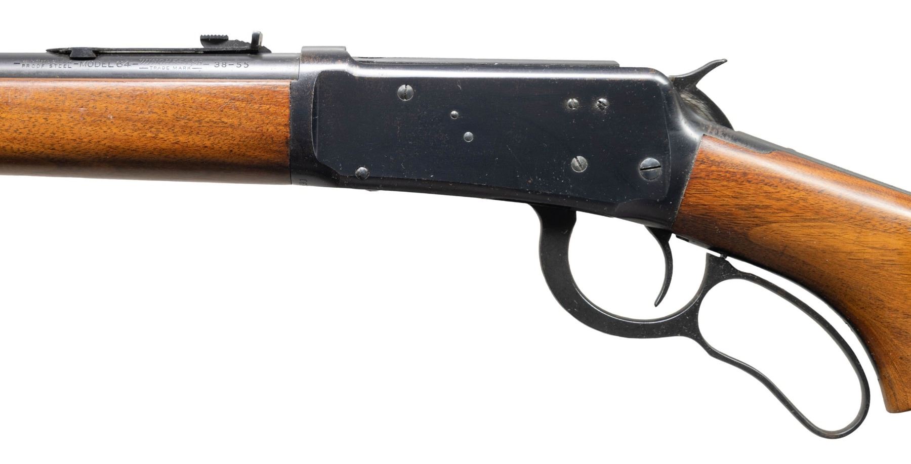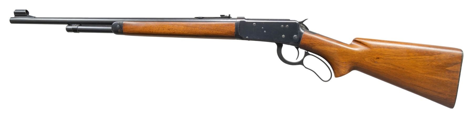 Cal. 38-55. S#. 1107691. Bbl. 20" round. Hooded ramp bead front with sporting rear sight. 2/3 length mag. Blue finish. Semi beavertail forend & pistol grip walnut stock with checkered steel buttplate. S#. indicates 1940 mfg. Bottom of bbl. stamped "38-55" and "36". CONDITION: over 90% original blue shows spots flaking to brown. Very good original wood finish shows scattered light marks. Bright near excellent bore. (25-1385/DS). CURIO. $2,000-3,000.