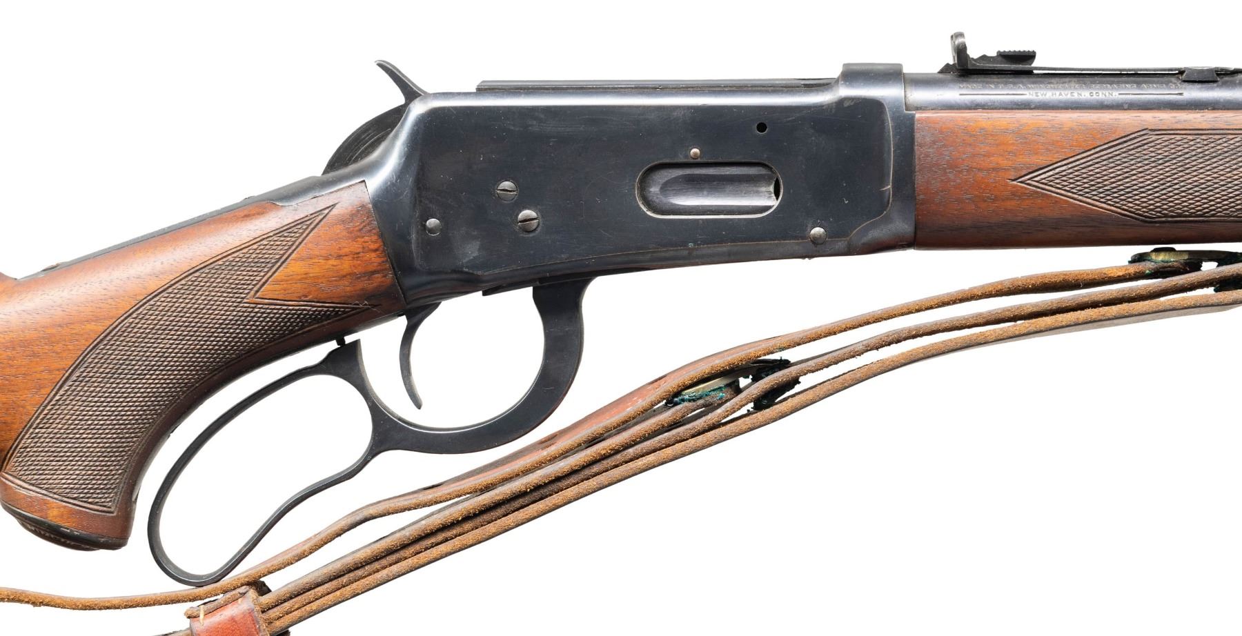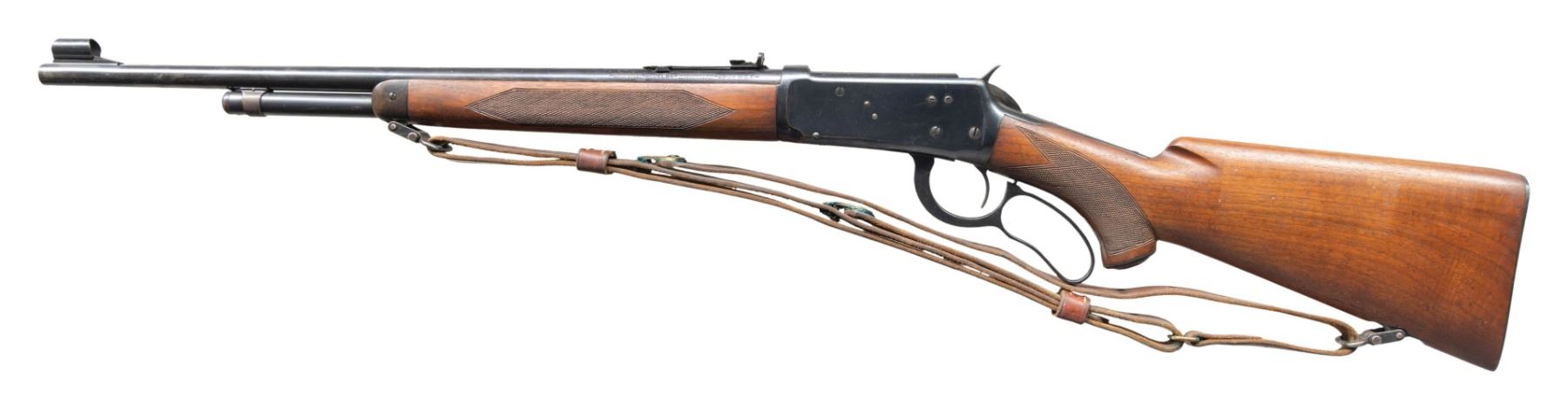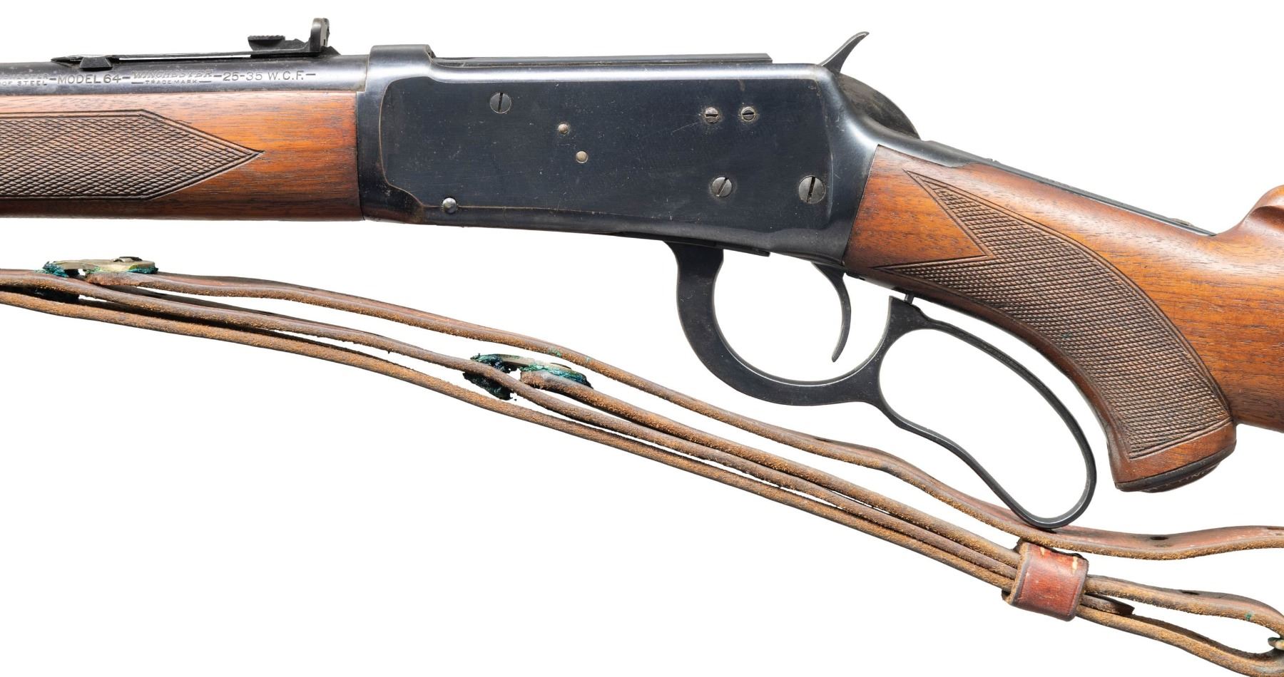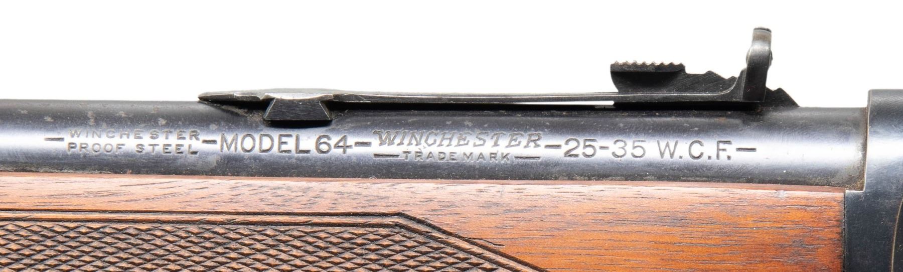 Cal. 25-35 WCF. S# 1271959. Mfg. 1941. Bbl. 20" with hooded dovetailed bead front sight on stippled short ramp. Elevator adjustable sporting rear sight. "-Winchester / Proof Steel - Model 64 - Winchester / -Trademark - 25-35 W.C.F. - " & "Made in U.S.A. Winchester Repeating Arms Co. / - New Haven. Conn. -" Bbl markings. 2/3 mag. Plain trigger. Lower tang marked "R11" under stock. Checkered pistol grip walnut stock that terminates with checkered steel buttplate and Winchester Repeating Arms hard rubber buttplate. Top tang channel of the stock is marked " L103". Factory mounted butt and nosecap sling eyes with QD sling swivels and George Lawrence leather rifle sling. CONDITION: overall very good. Bbl has some thinning finish towards the muzzle with a small patch of touch up blue and scattered handling marks and scattered light freckled oxidation. Receiver is very fine with over 90% original finish coverage that has some thinning finish in the carry areas that has turned to a brown patina and scattered light freckled oxidation. Stock set is very nice with only a few scattered handling marks and good checkering that has light wear to the high points. Bright shiny bore with sharp rifling. (25-1331/ZAL). CURIO. $1,000-2,000.