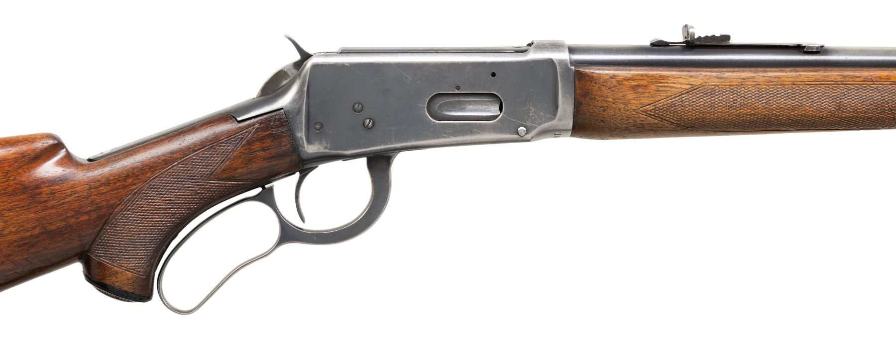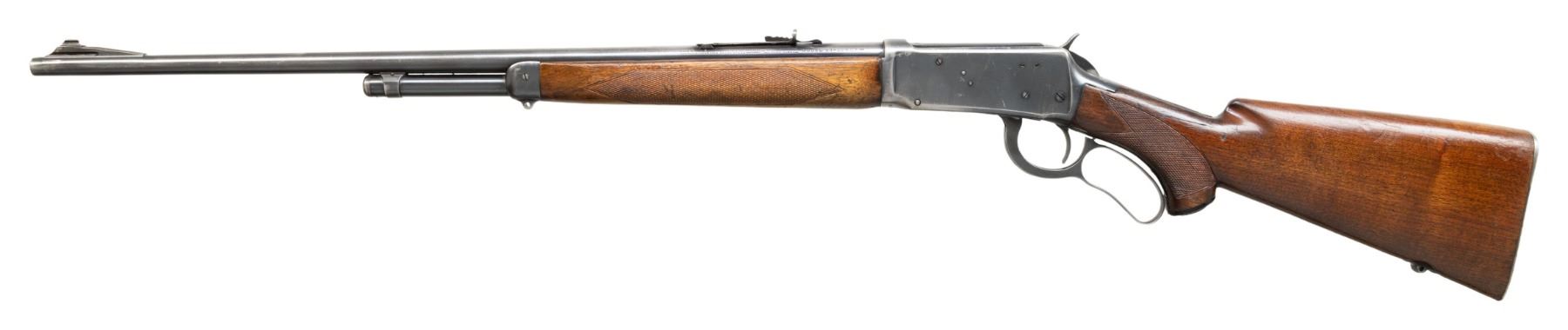 RIFLE. Cal. 30 WCF. S# 1619584. Bbl 24" tapered round, ramp mounted front sight with sporting rear sight. 2/3 length mag. Semi beavertail forearm and hard rubber capped pistol grip stock has factory checkering. Sling eyes for Super Grade swivels and checkered steel buttplate. Mfg. 1949. CONDITION: 70% blue showing carry and edge wear. Stock has worn finish and checkering with numerous scratches, marks and dents. Sound action. Good bright bore. (25-5471/DS). CURIO. $1,000-1,500.