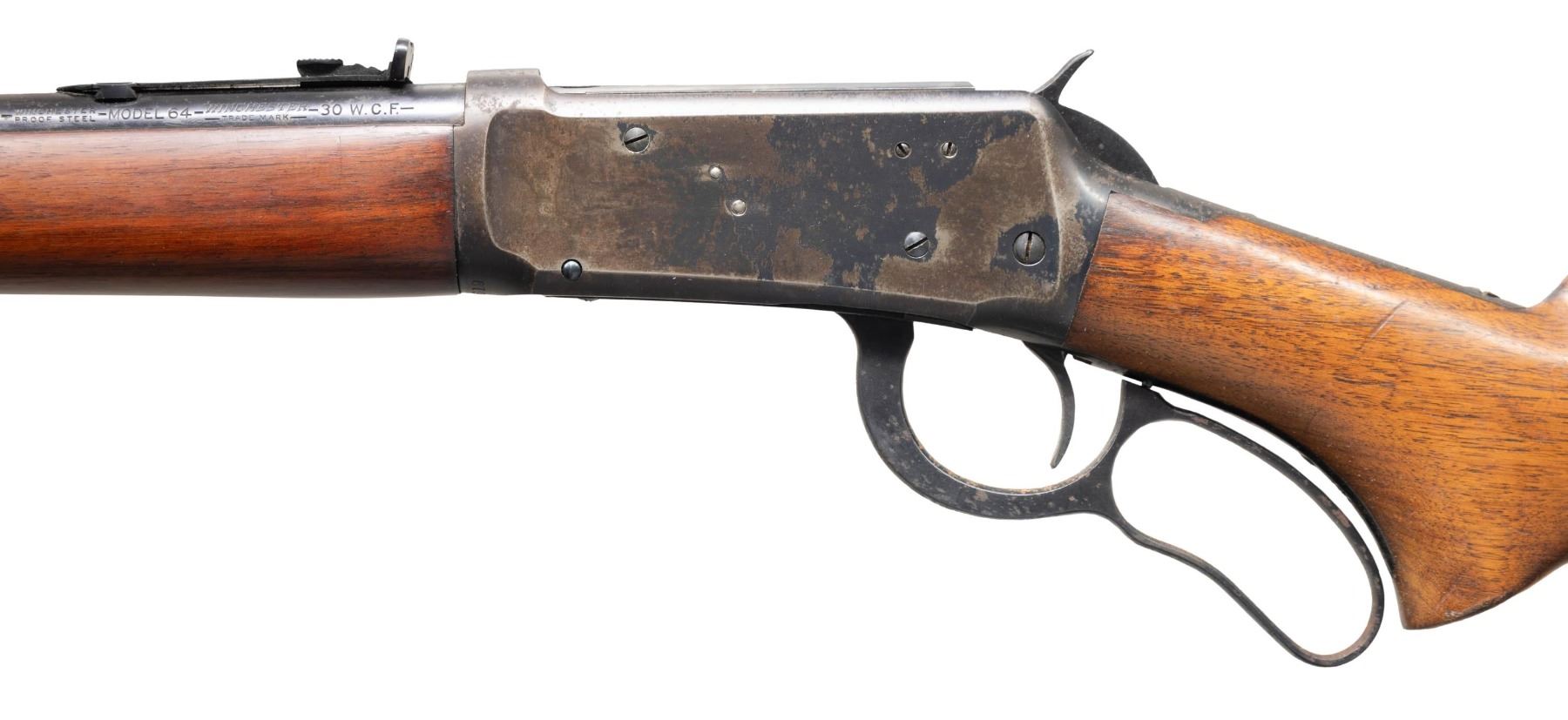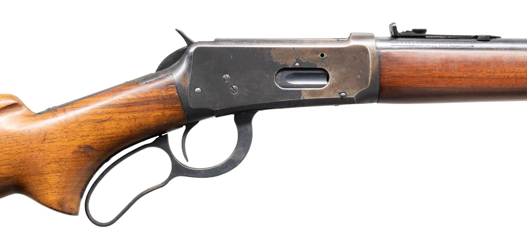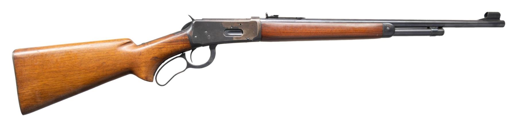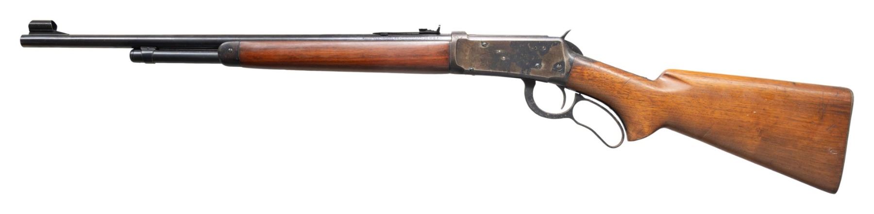 Cal. 30 WCF. S# 1147619. Mfg. 1937. Bbl. 20" Rd with hooded bead front sight dovetailed into a stippled short ramp. Elevator adjustable sporting rear sight. 2/3 mag. Smooth pistol grip walnut stock set with checkered steel buttplate. CONDITION: overall good. Bbl retains 95% original bluing with scattered moderate freckled oxidation running the full length of the bbl. and portions of the receiver. Receiver finish is flaking with approx 50% of the original blue remaining. The balance of the exposed metal surfaces have changed to an brownish patina. Stock set shows light sanding with a moderate amount of light handling marks and some heavier scratches and dings. Bore shows light frosting with sharp rifling and some mild pitting. (25-1335/ZAL). CURIO. $600-900.