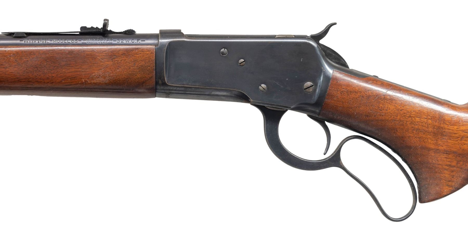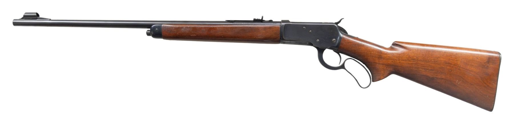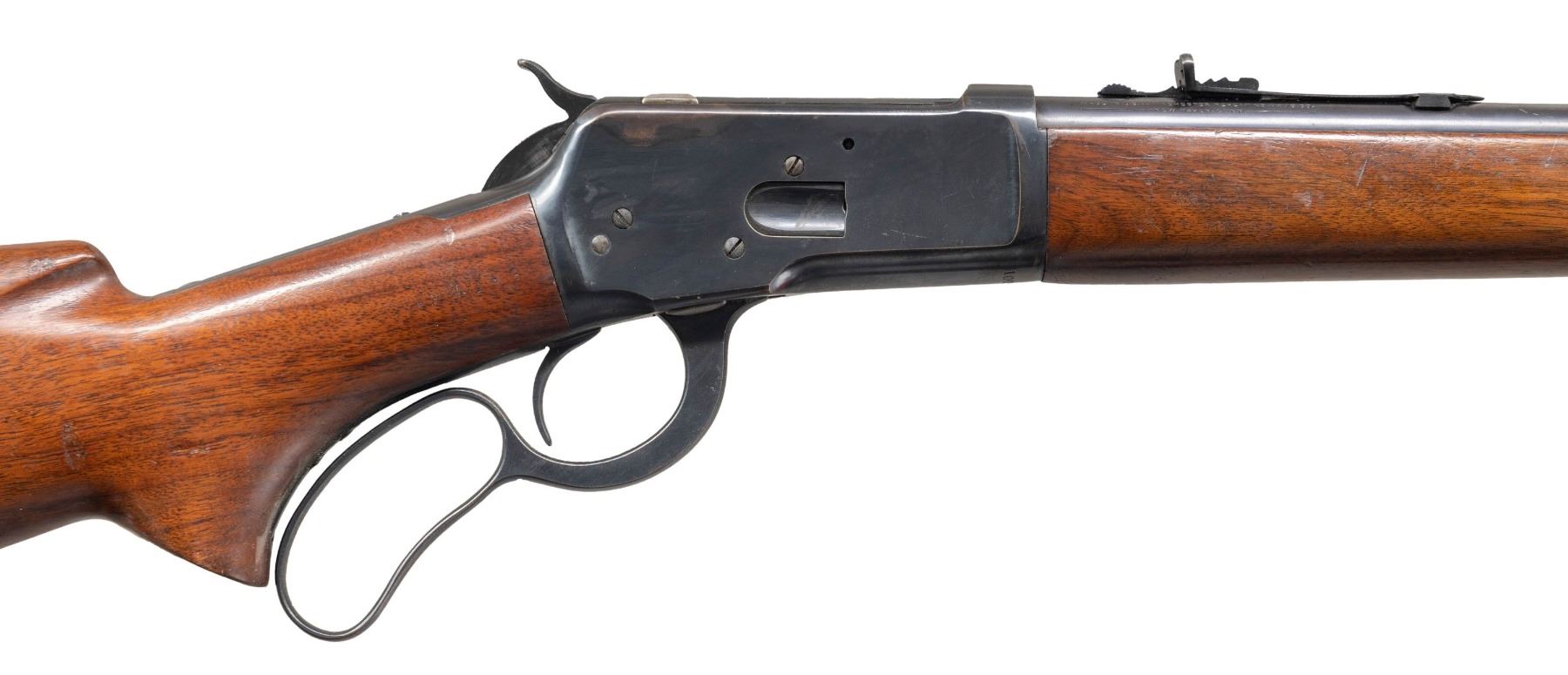 Cal. 32 WCF. S# 1006383. Bbl. 22" with hooded stippled ramp beaded front sight. Elevator adjustable sporting rear sight. Uncheckered pistol grip walnut stock set with checkered steel shotgun buttplate and blued forearm cap. CONDITION: overall very fine. Bbl retains appox 95% original finish showing some dings and mild scratches. Receiver has a spot of touch up finish on the right side near the locking bolts and a few scattered handling marks and some mild freckling, but is otherwise very good. Good stock with nice original finish showing some scattered light scuffs and handling marks. Bright bore with sharp rifling. (25-1272/ZAL). CURIO. $1,000-1,500.