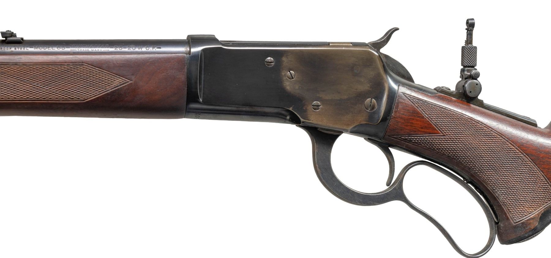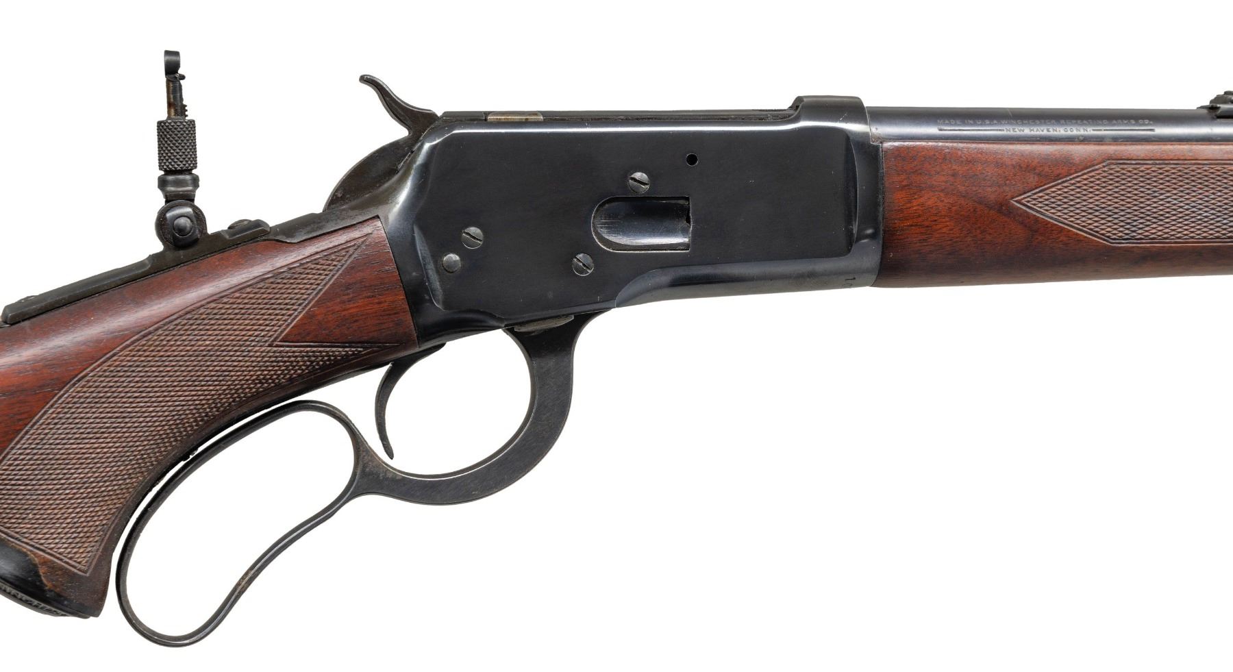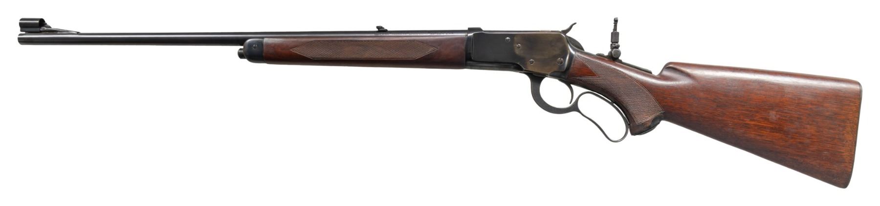 Cal. 25-20 WCF. S# 1006503. Bbl 22" with hooded stippled ramp beaded front sight and folding leaf adjustable rear sight. Lyman 1A tang sight. Checkered recontoured pistol grip walnut butt with checkered forearm terminated with checkered steel shotgun buttplate, screw fastened forearm cap and "Winchester Repeating Arms" hard rubber pistol grip cap over an epoxy filler. CONDITION: a nicely refinished example with 95% metal coverage showing some scattered handling marks. The left side of the receiver has two plugged holes from a receiver sight and discoloration from a non professional touch up blue job on that side. The stock set has been after market adjusted with added checkering and shaping with epoxy filler added to the pistol grip cap area and minor handling marks. Bore has some mild frosting and some spots of pitting with sharp rifling. Despite the list of work done this is a fairly attractive example if it were not for the left side receiver finish discoloration. (25-1271/ZAL). CURIO. $1,000-1,500.