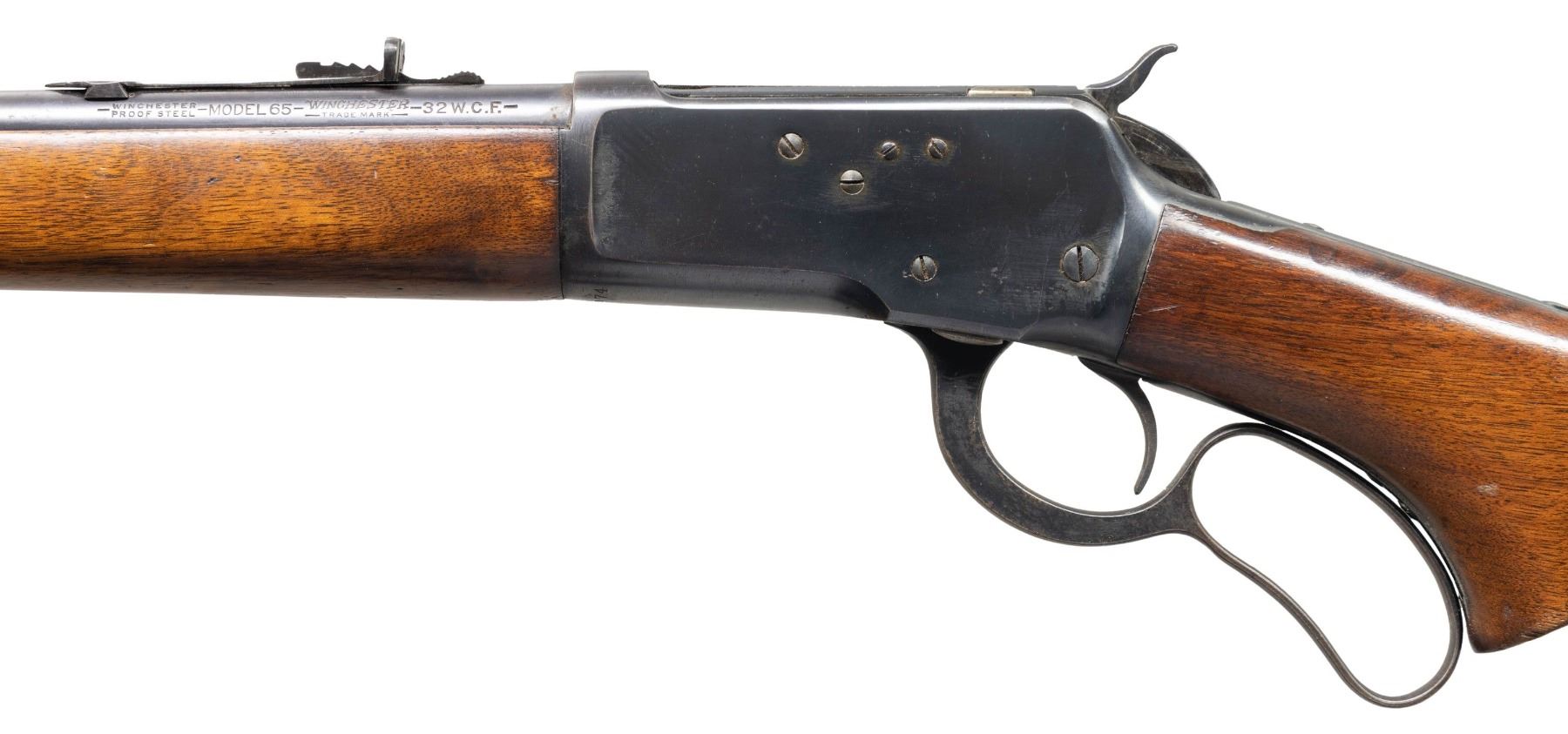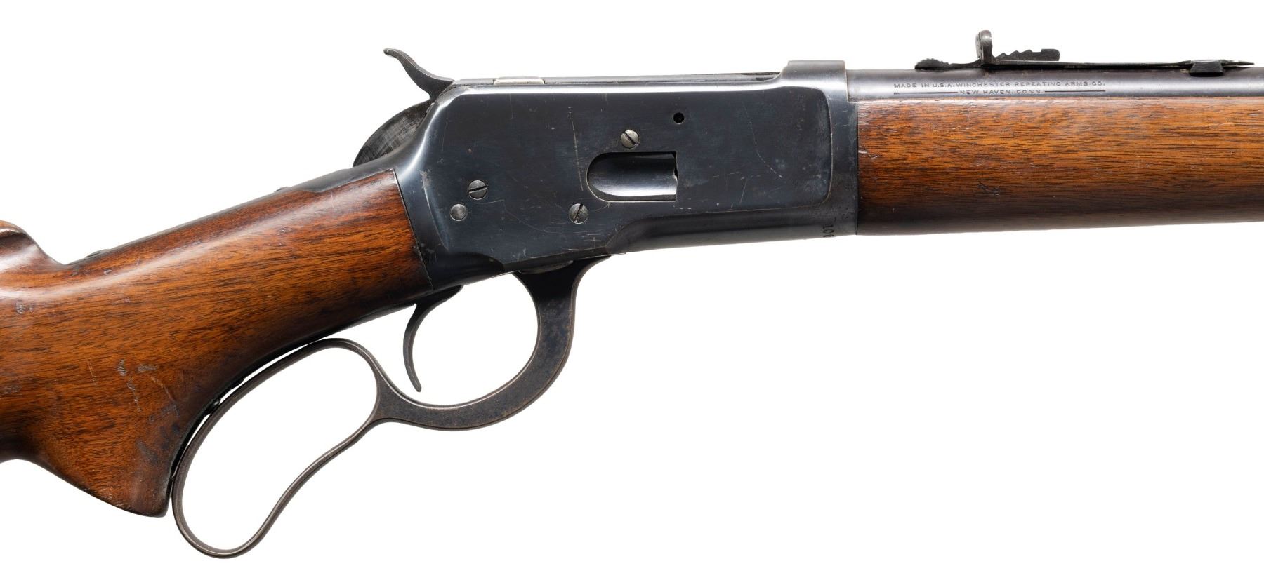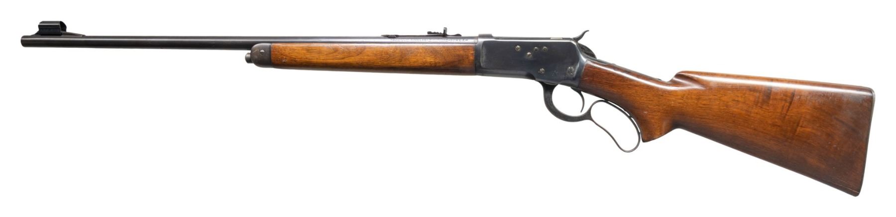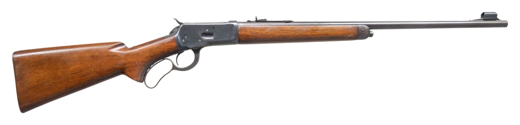 Cal. 32 WCF. S# 1006974. Bbl. 22" with hooded stippled ramp beaded front sight and elevator adjustable sporting rear sight. Tapped with plugged holes for a receiver sight. Uncheckered pistol grip walnut stock set terminated with a checkered steel shotgun buttplate and blued forearm cap. CONDITION: bbl has thinning original blue with about 75% coverage and scattered handling marks. Receiver retains approx 85% original finish with scattered handling marks and some mild freckled oxidation. Stock has an approx 2" crack at the butt that runs through and scattered impressions and scratches. Bright bore with good sharp rifling. (25-1280/ZAL). CURIO. $800-1,200.