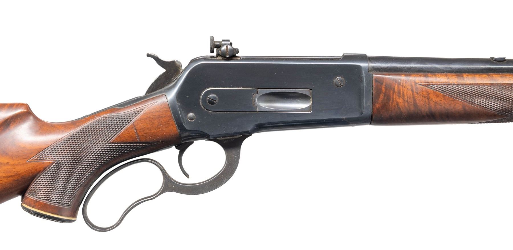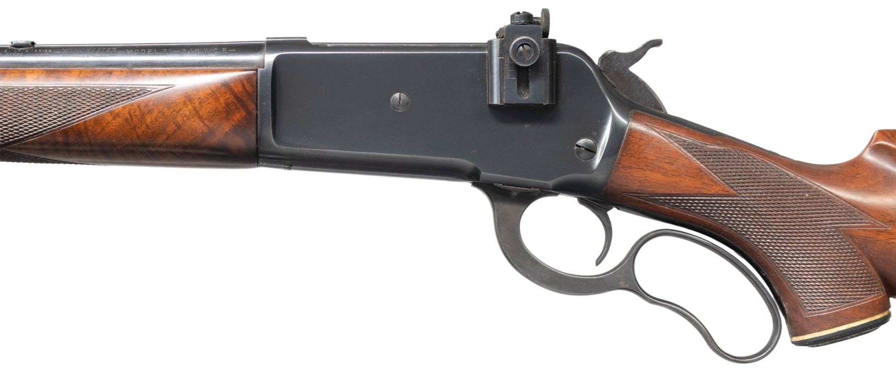 RIFLE. Cal. 348 WCF. S# 40603. Bbl 24" round. Ramp mounted replacement front bead sight filler and in rear dovetail with an aftermarket Lyman No. 56 receiver sight. 2/3 length mag. Blue finish. Custom replacement forearm and Monte Carlo stock of fancy walnut. Features include point pattern hand checkering, hard rubber grip cap with white line spacer, and super grade swivels on forearm cap and in the toeline. LOP: 13 3/8" over a solid red Winchester pad. Mfg. 1954. CONDITION: metal retains 98% nicely polished reblued finish showing small marks. Custom wood has good finish showing scratches and scattered mildew spots. Sound action. Bore retains strong rifling showing some darkness in the grooves. (25-1381/DS). CURIO. $1,000-1,500.