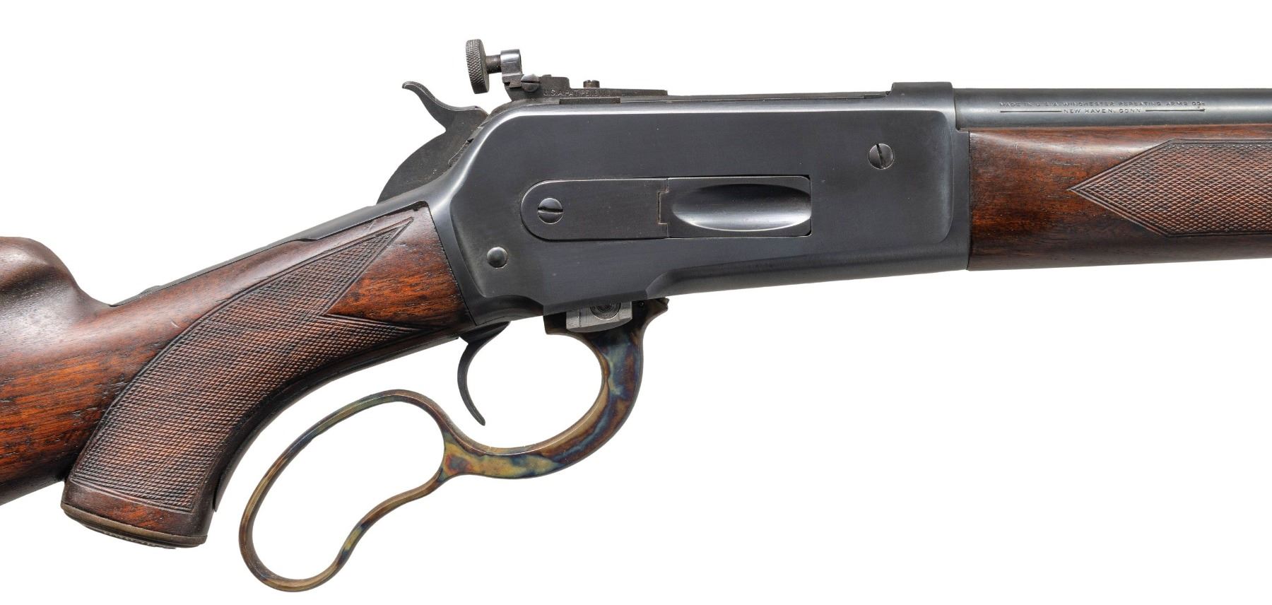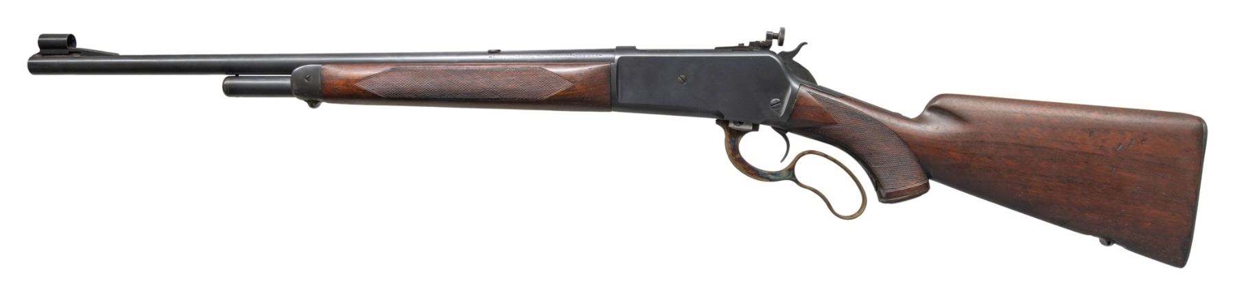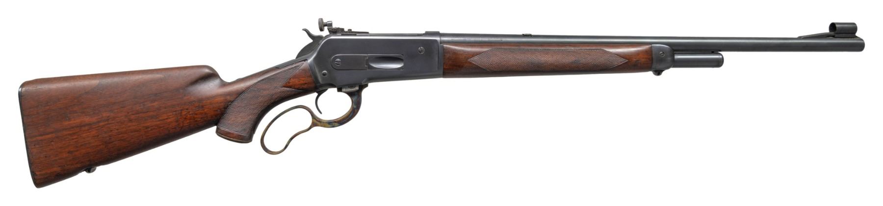 Cal. 348 WIN. S# 188. Mfg 1935. Bbl. 20: Winchester proof steel with hooded brass bead front sight dovetailed on a stippled, plugged rear dovetail. "-Winchester/ProofSteel - Model 71 - Winchester / -Trademark- 348 W.C.F.-" & "Made in U.S.A. Winchester Repeating arms Co. / -New Haven. Conn -" bbl markings. Winchester. No.98 bolt peep sight. Deluxe checkered walnut pistol grip stock set with checkered steel shotgun butt plate and Winchester Repeating Arms hard rubber pistol grip cap. Factory butt and nosecap swivel eyes. CONDITION: overall very fine as professionally restored. The bbl. is shortened from 26" rifle length to 20" carbine length. Bbl and receiver have very fine metal finish with only a couple of faint handling marks present. The markings including proofs remain crisp with the restorer taking care not to destroy the bbl marks during polishing. The case coloring on the lever is vibrant and shows little signs on use after restoration. Stock set has been lightley sanded with some scattered moderate scratches and light handling marks. Good original buttplate bluing with 85% coverage. An attractive restoration with a slightly duller blue tone than factory examples. (25-1330/ZAL). CURIO. $1,000-1,500.