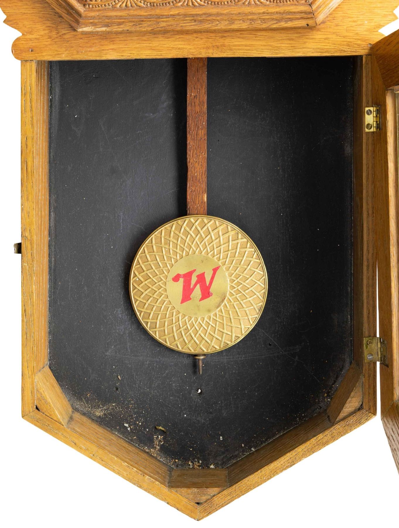 ADVERTISING CLOCK. From one of the finest private clock collections in the United States we offer this Winchester advertising clock. According to the sessions catalog this model was called Star Pointer and was manufactured during the 1920's. It is the rarest of all the Winchester advertising clocks produced by the Sessions Clock Co. as only a few are known to exist! The flawless golden oak case measures 33 inches tall, 18 inches wide, with a brilliant 12 inch original Winchester advertising dial.The clock is 100% original. The eight day movement is stamped sessions and has recently been serviced assuring decades of accurate use. Both glasses are old and wavy. The hands are original as is the pendulum that portrays the "W" logo. All the hardware, hooks and hinges are original. When hanging in your gun room it will attract fellow gun collectors to admire and gravitate to it upon entering the room. (02-25749/KAT). $3,000-5,000.