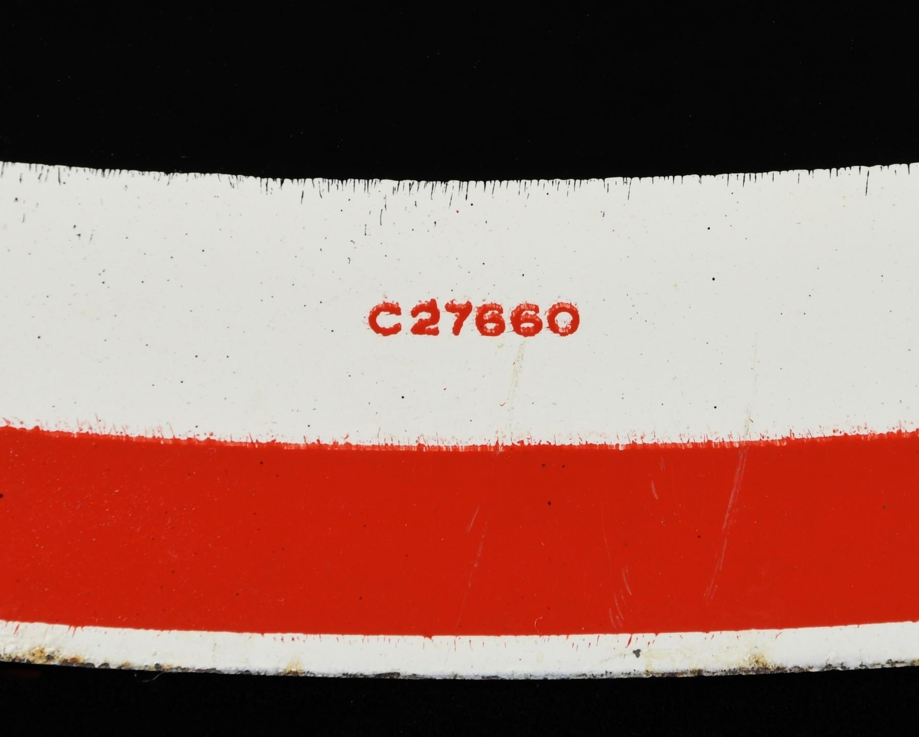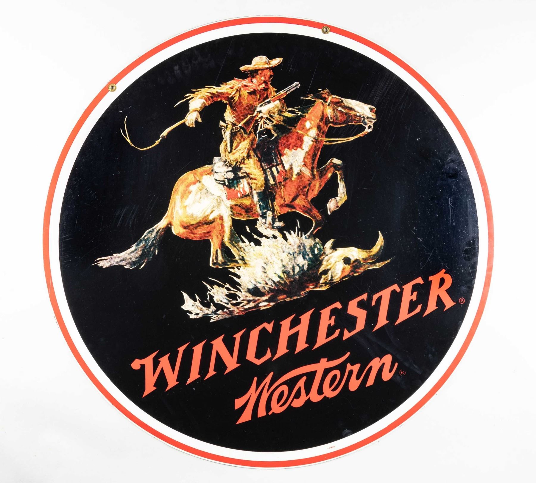 SIGN. Large circular double sided Winchester advertising sign, showcasing the Winchester horse & rider logo above the Winchester and Western trademark logos. Bottom of sign is marked "C27660" on either side. Sign measures 38" in diameter and features brass hanging loops at the top. CONDITION: very good, with the sign retaining bountiful amounts of its original finish, exhibiting some superficial handling marks, as well as scattered areas of what appears to be bubbling. A large and attractive Winchester double sided advertising sign. PROVENANCE: Estate of Russell Dickerman. (02-24327/MLW). NON-GUN. $300-400.