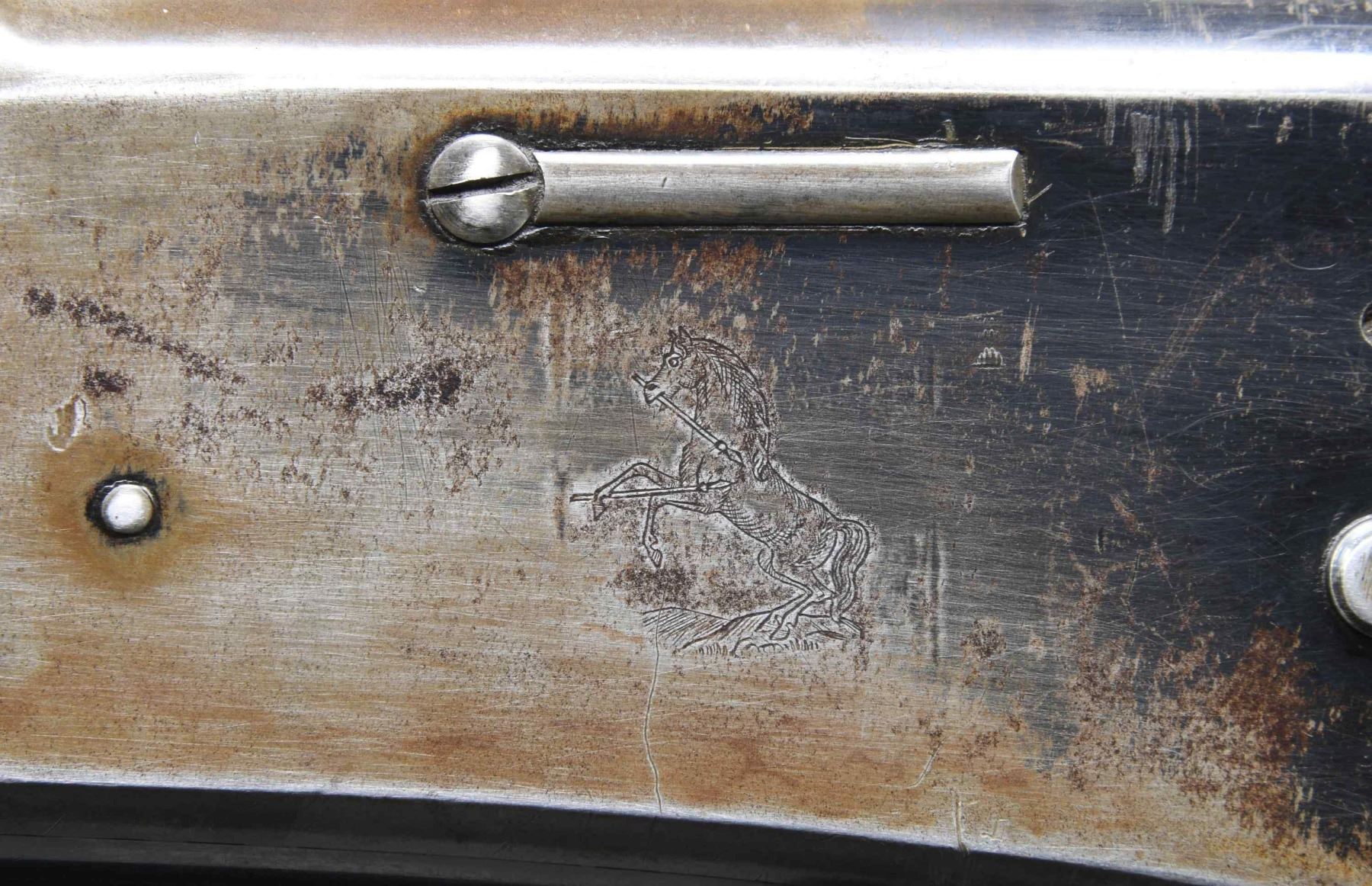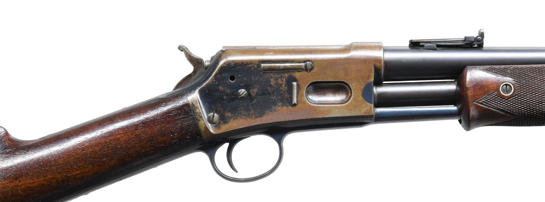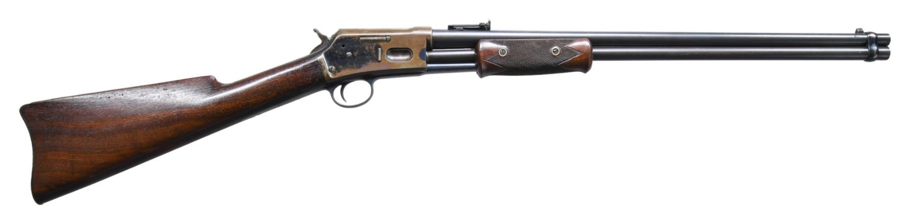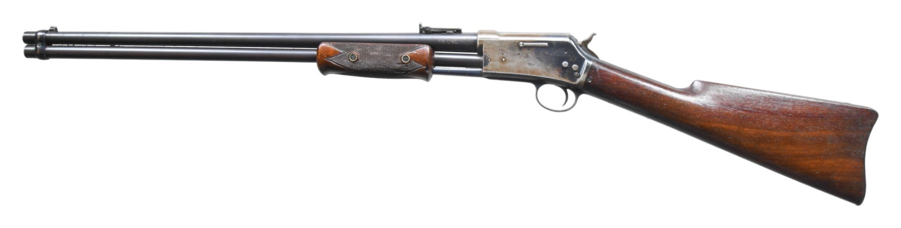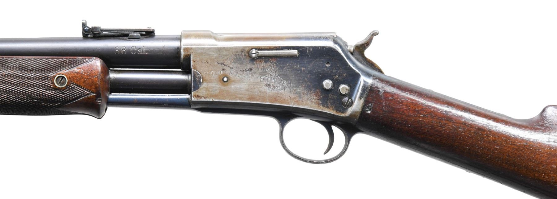 Cal. 38-40. S# 42255. Bbl. 20" tapered rnd. with fixed front sight and reverse mounted carbine leaf rear sight. Full length mag. Left side of action features the Rampant Colt logo. Blue finish. 2-piece checkered walnut milk pale handle forearm and straight grip walnut stock with steel carbine buttplate. Mfg. in 1890. 5 lbs. 7.8 oz. CONDITION: bbl. and mag. tube retain 90% lightly faded blue showing small spots and handling marks. Receiver retains fading blue in protected areas with balance having acquired a mottled brown patina. Stock and forearm have original wood finish showing scratches and marks. Forearm retains good checkering showing a few flattened diamonds. Sound mechanics. Very bright bore with strong rifling showing a patch of light pitting towards the muzzle. PROVENANCE: The Esteemed Norm Greenberg Collection. (01-28148/DS). ANTIQUE. $3,500-5,000.