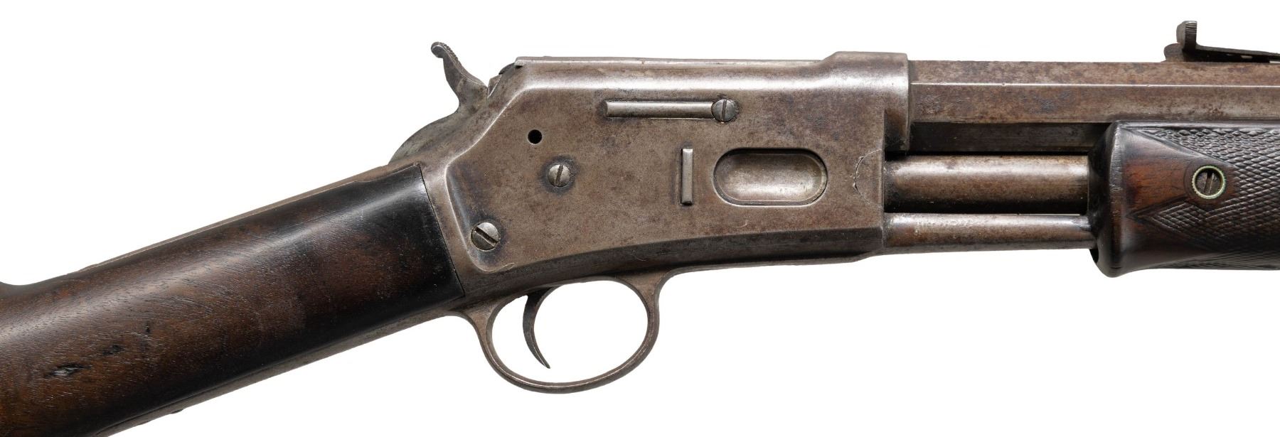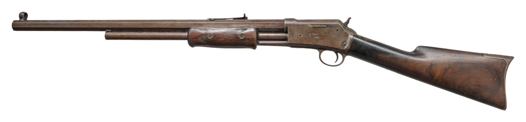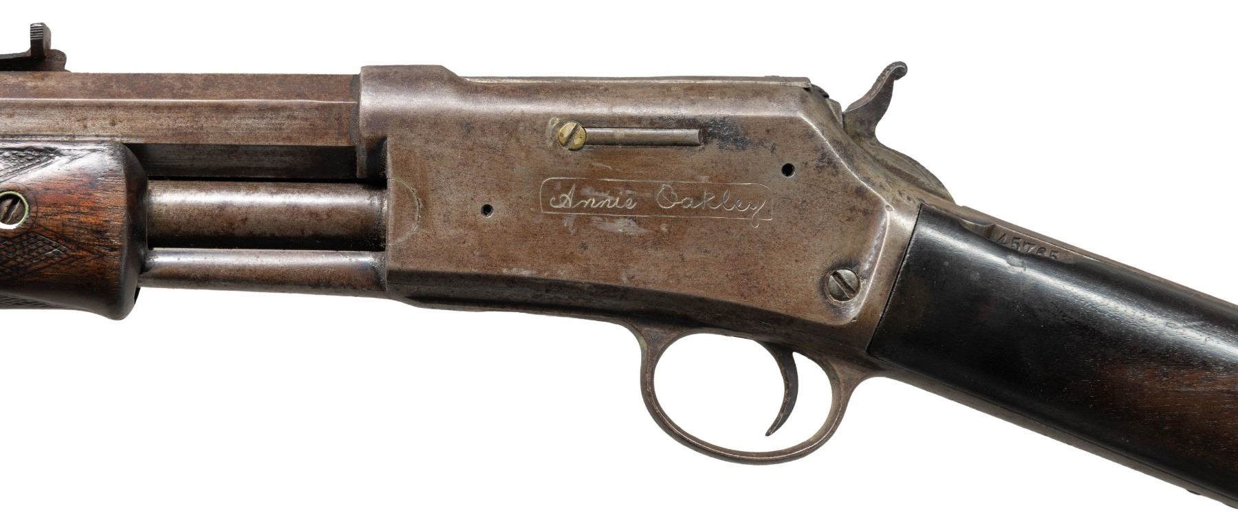 Cal. 44-40. S# 45765. Bbl. Shortened to 19" oct. with dovetailed ring front sight that has no reticle or post. Elevator adjustable sporting style rear sight. Left side of the receiver has a spuriously added engraved "Annie Oakley" within a box. Checkered forearm. Straight grip walnut butt with smooth steel crescent butt plate. CONDITION: metal surfaces finish has entirely faded to grey with moderatly freckled oxidation. Sanded and refinished stock set with heavy wear to the forearm checkering and chip at the wrist. Bore shows wear and pitting. (01-26323/ZAL). ANTIQUE. $600-900.