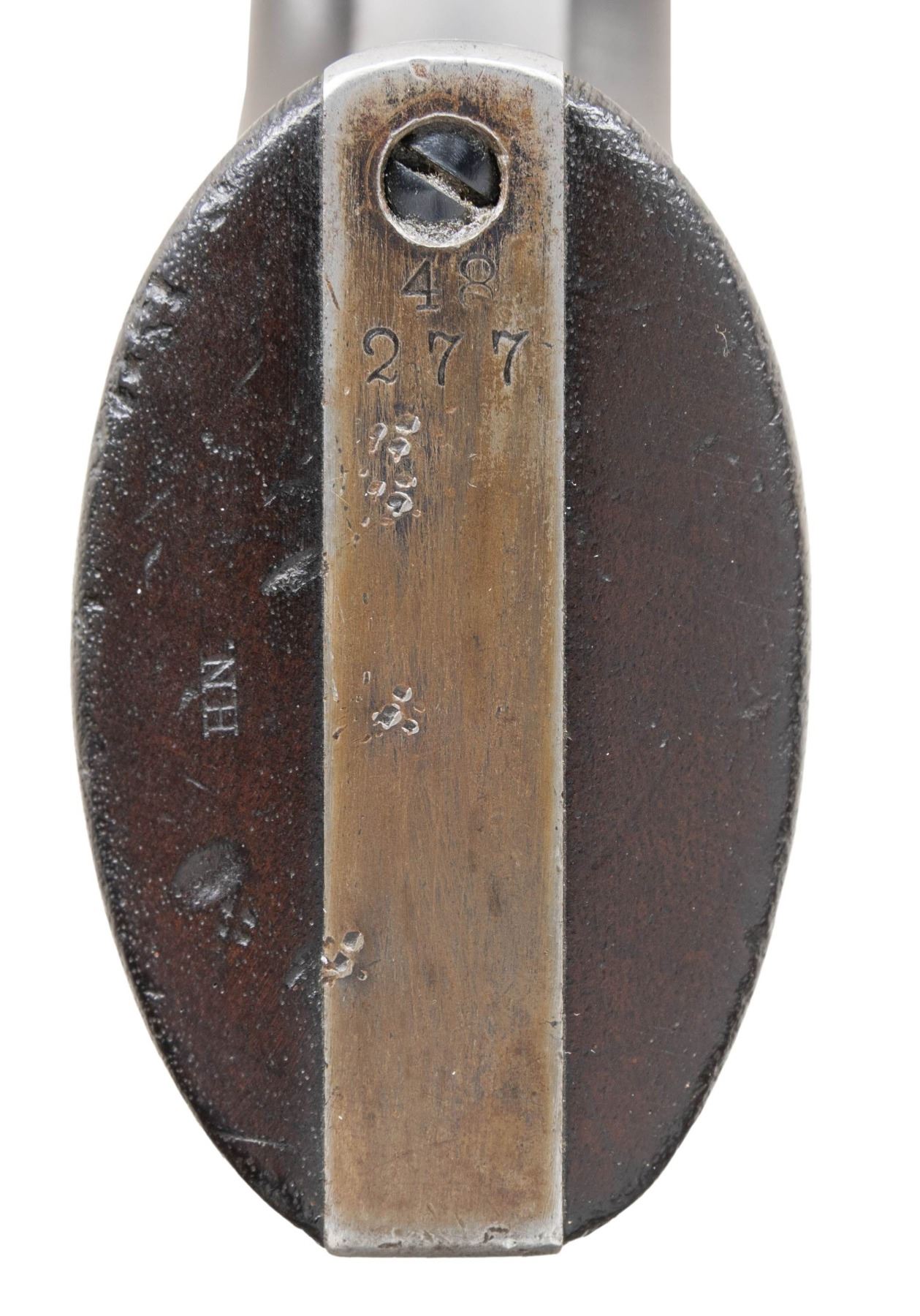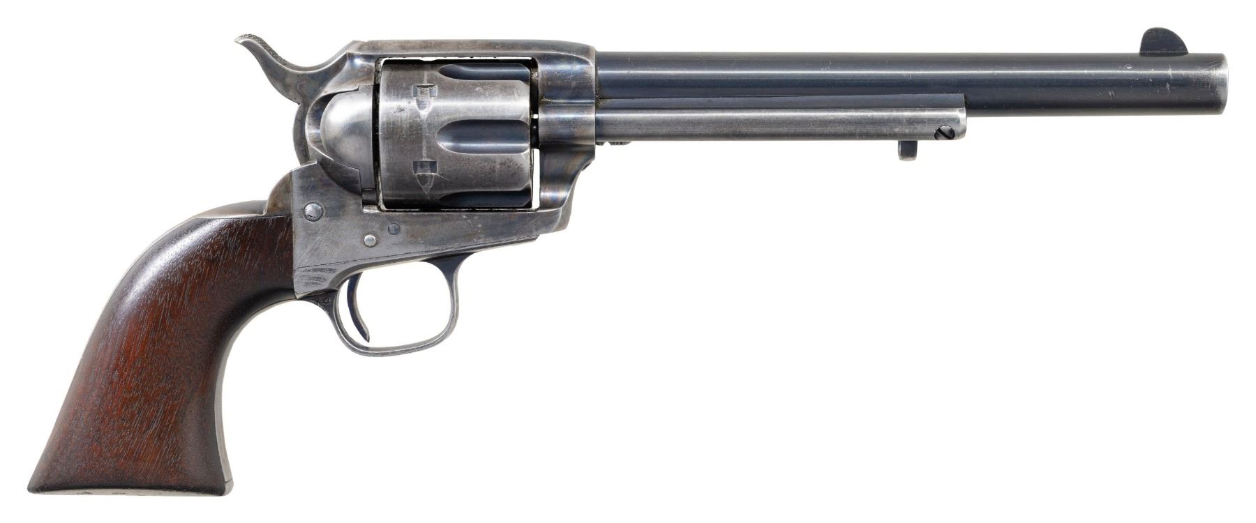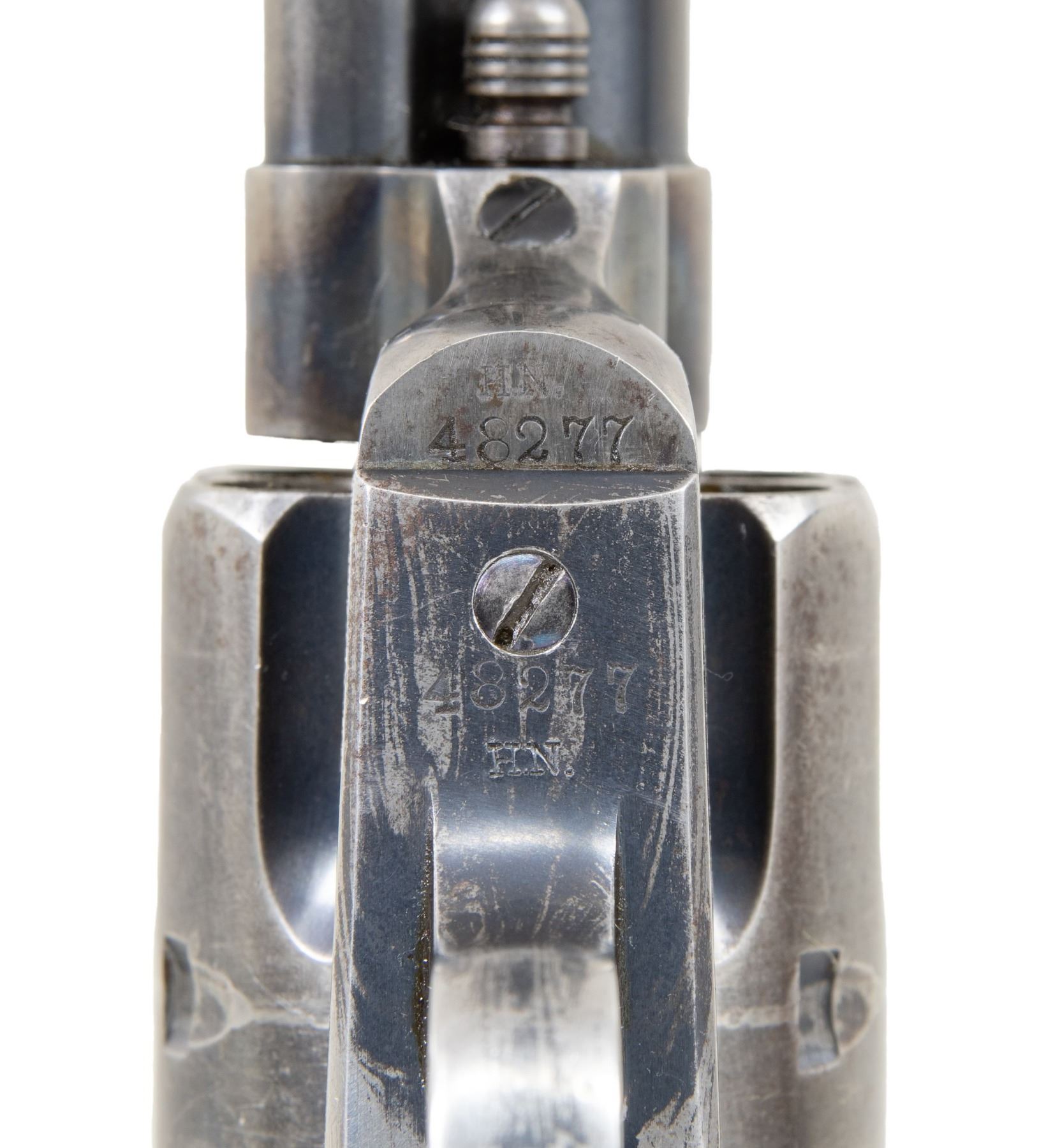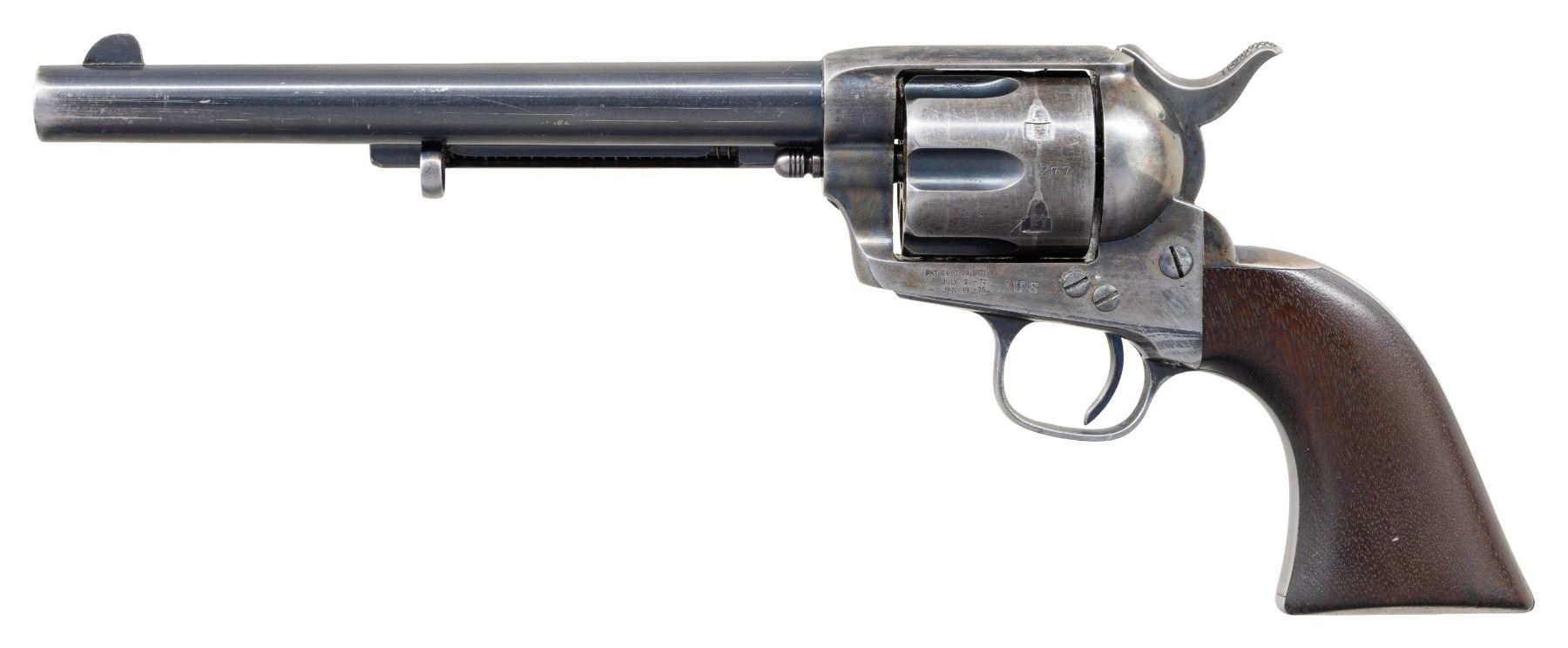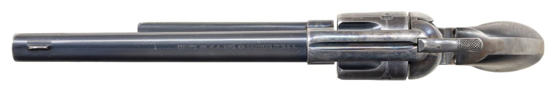 U.S. SINGLE ACTION ARMY CAVALRY MODEL REVOLVER. Cal. 45 LC. S# 48277. Henry Nettleton inspected revolvers remain one of the most difficult to obtain as he only inspected approx. 3,000 units (47,000-50,000 S# range). While scarcity alone makes this a desirable Cavalry revolver, existing specimens with this level of original finish rarely present themselves on the market. This revolver would be a worthy addition to any advanced Martial or Colt collection! Bbl. 7 1/2". Black powder frame. 6-shot fluted cyl. Bullseye ejector rod head. Blue and case colored finish. Frame, bbl., grip straps, and cyl. have matching S#s. Frame, trigger guard, and butt of right grip panel have "HN" (Henry Nettleton) inspector marks. 1-piece walnut grip stamped on bottom "HN". Mfg. in 1878. CONDITION: over 60% original bbl. and ejector blue showing honest light carry wear and scratches. Grip straps and cyl. retain 30% original blue showing small spots of pitting at butt. Original frame case colors lightly visible overall but remain strong in protected areas. Lightly sanded and refinished grips show small chips and minor handling marks around the butt. Sound mechanics. Bore is generally bright with sound rifling. (01-28217/DS). ANTIQUE. $12,000-18,000.