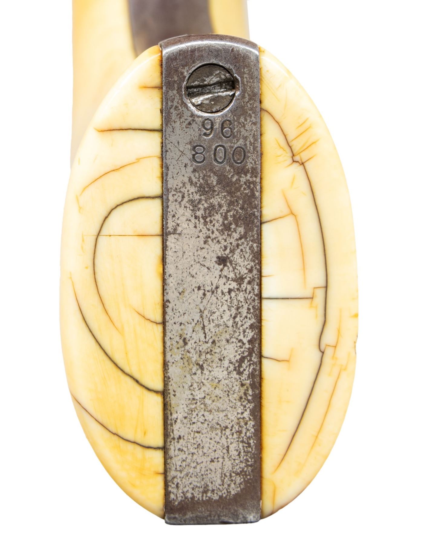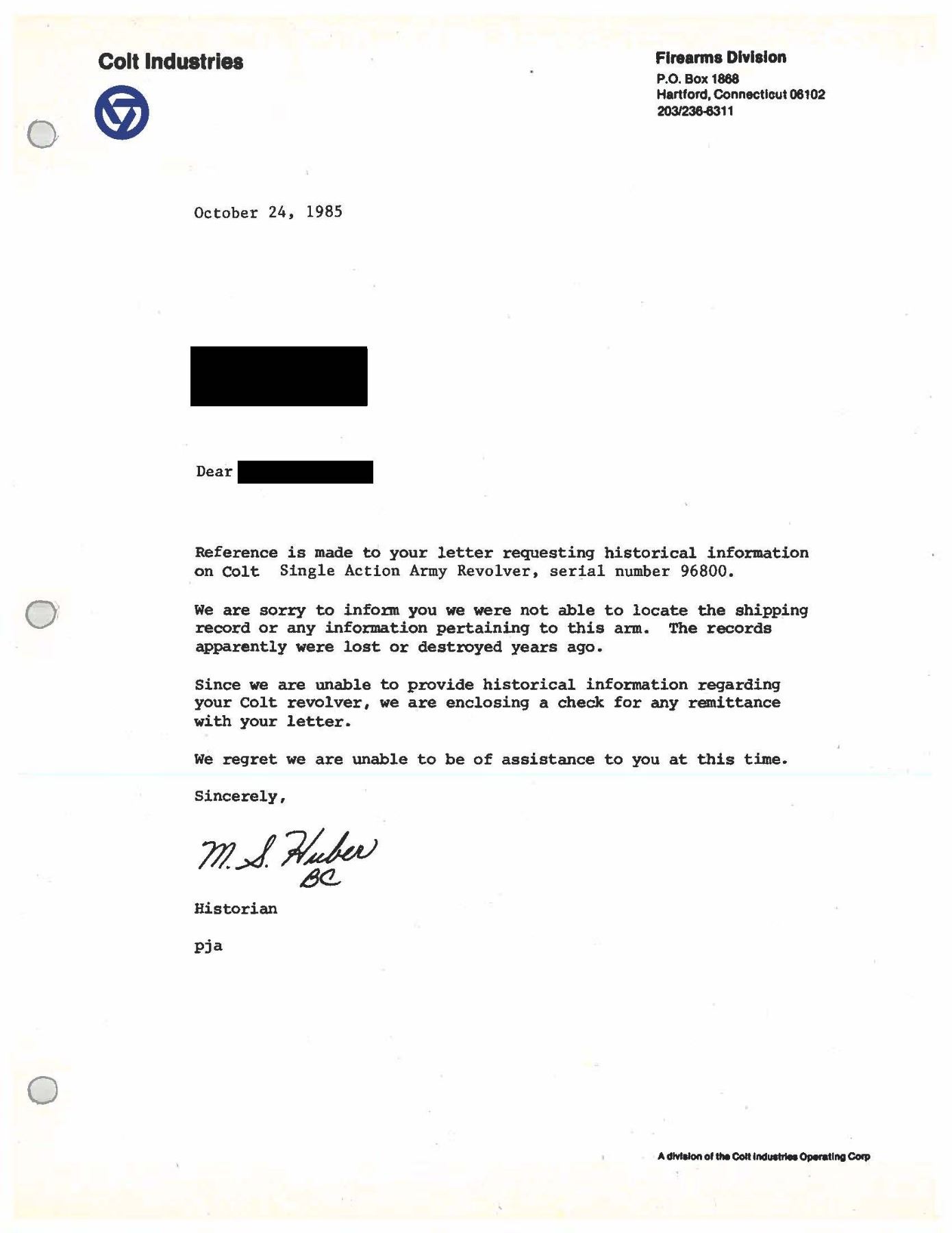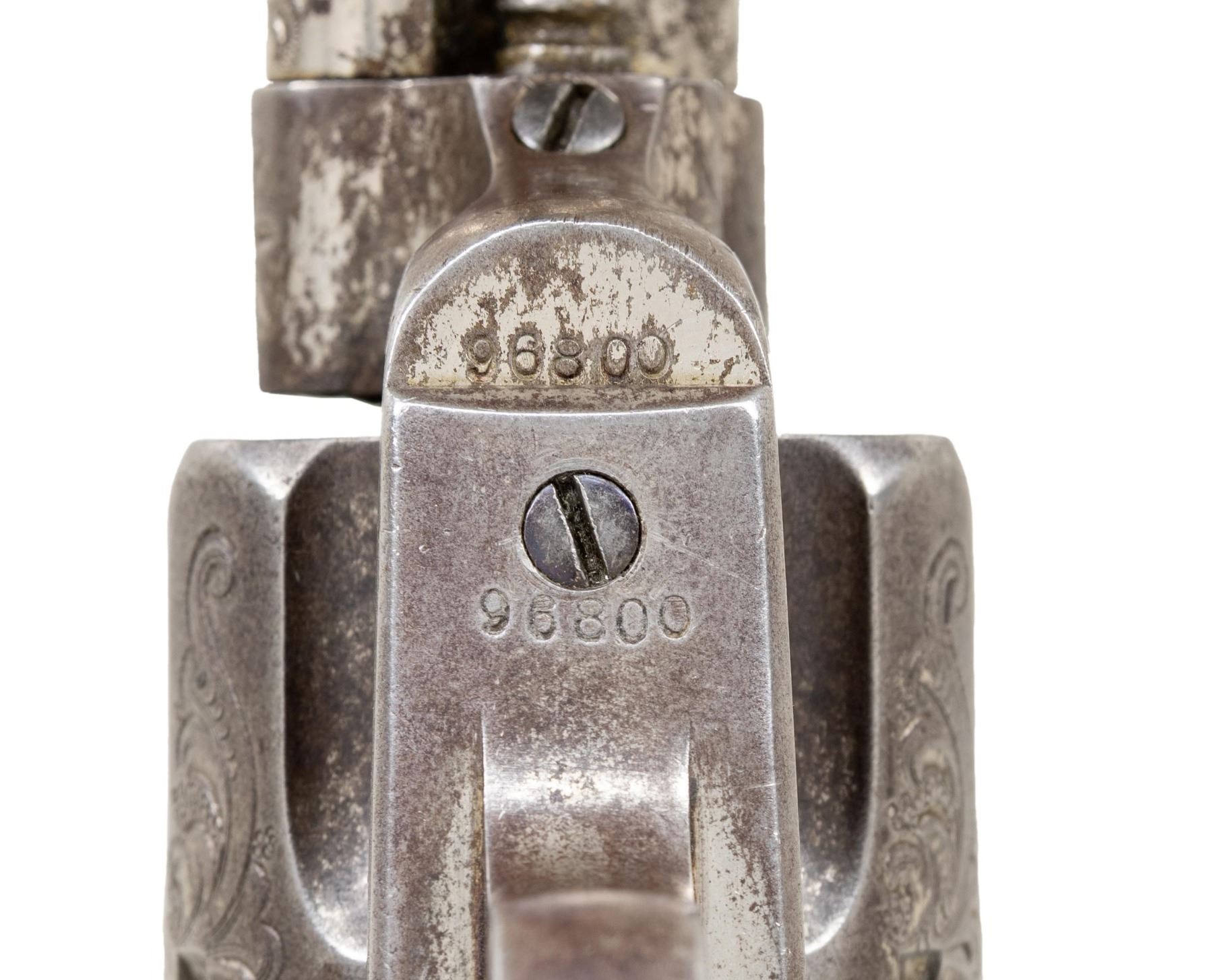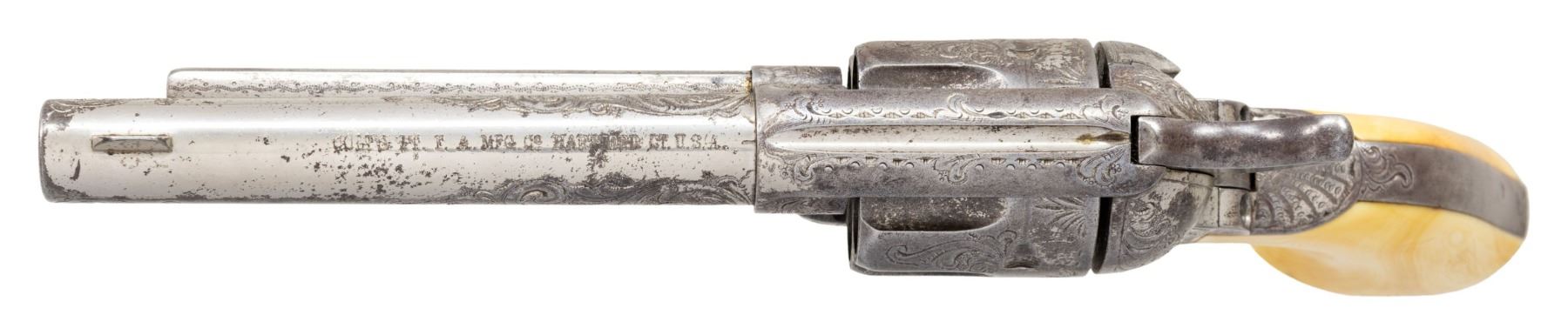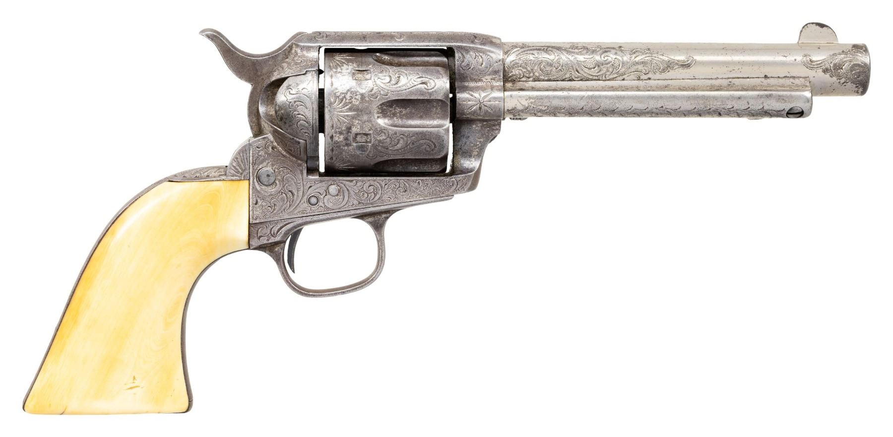 REVOLVER. Cal. 45 Colt. S# 96800. Bbl. 5 1/2". Single Action Army revolver mfg. by Colt in 1883. Top of the bbl. is marked with Colt's single line address, with Colt's 3-line patent information marked on the left side of the frame. Left side of forward trigger guard web is marked "45 CAL". Revolver exhibits classic L.D. Nimschke style New York engraving of scrollwork patterns, punch dot backgrounds and "Nimschke stars" in B-level coverage, most likely "shipped soft" to a distributor for client engraving orders. The black powder frame with arabesque foliate scroll engraving on punch dot backgrounds over the entirety incl loading gate and recoil shield, a starburst is adjacent the cylinder pin on either side. Top of backstrap with trademark scalloped fan and trailing arabesque flourish. Trigger bow has starburst. Cyl. exhibits matching scrollwork between the flutes and half-stars around the back edge. Scrollwork extends halfway down the sides of the bbl w/ 1" flourishes at the muzzle. Ejector tube having a classic vine pattern running the length. Configuration and engraving of this revolver is virtually identical to several known examples in the 1883 serial range shipped soft to Hartley & Graham ( 88008, 88208, 98601, 98679). Metal components exhibit a nickel plated finish overall, save for on the trigger and frame screws, which were nitre blued. Frame is mounted with a 1-piece smooth ivory grip. Standard SAA pattern blade front sight and frame notched rear sight. All serialized parts are matching and include the frame, trigger guard, and rear grip strap. Cyl. and bbl. are unnumbered. UNATTACHED ACCESSORIES: Colt factory letter dated October 24th, 1985 indicating that the information pertaining to this revolver was lost or destroyed and is unavailable. CONDITION: metal components retain large amounts of their period nickel plated finish, exhibiting large areas of wear and flaking that show through to a dark gray patina, with some light to mild pitting. Nitre blued trigger and frame screws exhibit either a gray patina or retain traces of their nitre blue finish. Bore exhibits consistent light to mild pitting, while retaining good rifling throughout. Proper manual mechanics. Ivory grips have acquired a pleasing yellow patina, showing scattered superficial handling marks, with checking present on the butt. PROVENANCE: The Esteemed Norm Greenberg Collection. (01-27647/MLW). ANTIQUE. $10,000-15,000.