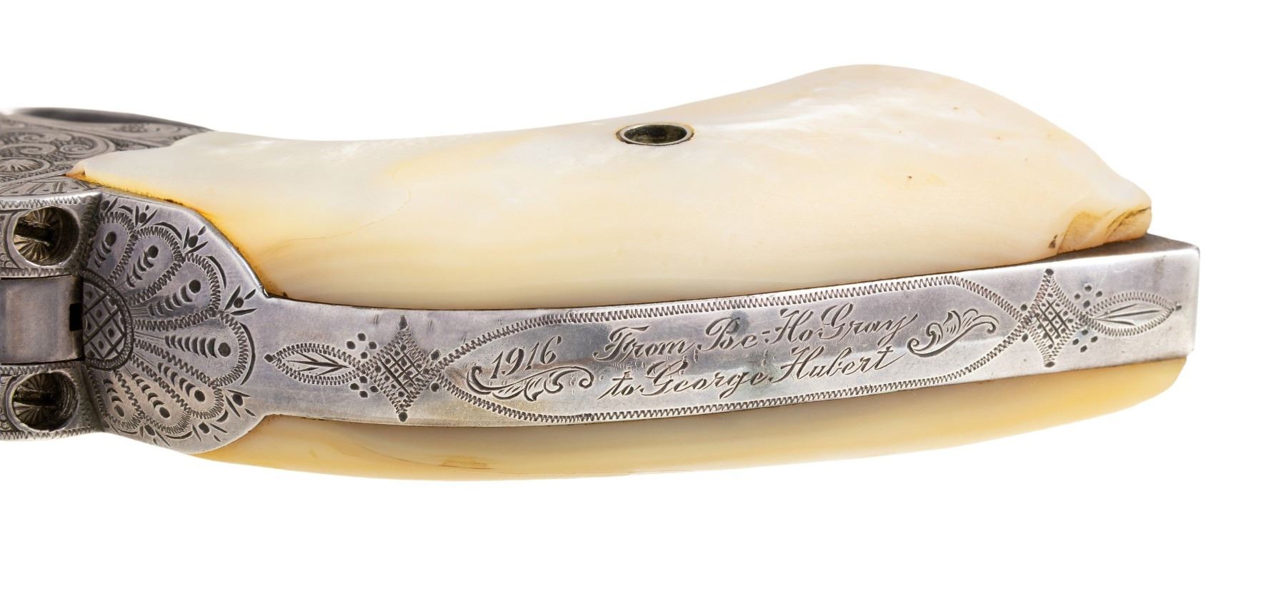 PERIOD SILVER PLATING & INSCRIPTION FROM BEE HO-GRAY TO GEORGE HUBERT. Cal. 45 Colt. S# 317105. Mfg. 1911. Bbl. 7 1/2" with blade front sight. Bee-Ho Gray (1885-1951). Was an accomplished trick roper who performed in circuses, rodeos and a multitude of Wild west shows including the Miller Brothers / 101 Ranch Real Wild West Show. Born Emberry Cannon Gray in Leon, Chickasaw Nation, Indian Territory, OK, Gray was raised amongst the Apache, Comanche, and Kiowa tribes and would eventually take on the name Bee-Ho. Bee Ho Gray joined the Miller Brothers / 101 Ranch show and traveled with them from 1907-1916 and again from 1925-1931. It should be noted that this revolver was shipped to Chicago on March 30, 1911, Bee-Ho Gray travelled with the show and performed in Chicago just over 3 months later on July 8, 1911. Other notable performers include Tom Mix & "Buffalo" Bill Cody. Revolver appears to be factory engraved in the complex style of Cuno Helfricht. Frame & bbl. feature foliate scroll over a punch dot background. Recoil shield & loading gate have the Helfricht style sunburst pattern. In between cyl. flutes alternate notes of scroll and fancy finial patterns. Found throughout are zig zag, punch dot, straight & wavy line borders. Backstrap professionally inscribed (non factory) :1916 Fron Bee-Ho Gray / To George Hubert". Revolver is fully silver plated, tarnish would indicate that this was likely done at the time of inscription. It is unknown who George Hulbert was but date of inscription coincides with Gray's final year of his first stint with the Miller Brothers / 101 Ranch show. Revolver is stocked with fancy factory 2 piece mother of pearl grips. Matching numbers on frame, trigger guard frame, cyl. & butt. UNATTACHED ACCESSORIES: excerpt from Colt factory letter stating the following: "Serial Number: 317105 / Caliber: 45/c / Barrel Length: 7 1/2" / Finish: Nickel / Type of Stocks: Pearl / Factory Engraved: Yes / Shipped To: Von Lengerke & Antoine / Address: Chicago, Illinois / Date of Shipment: March 30, 1911 / Number of Same Type Guns in Shipment: 1". Custom glass topped red velour shadow lined oak display case containing commemorative plaque and an assortment of Western themed souvenirs. Case is housed in a white cardboard shipping carton. CONDITION: metal retains 98% of its period silver plating with small spot of flaked finish at lower right of muzzle. Silver has acquired a handsome darkening tarnish with age. Sharp edges are softened slightly. Grips are very good with small dings and scratches. Right panel has small loss at heel. Good bore is generally bright with scattered areas of fine pitting. An overall attractive Wild West Colt SAA. PROVENANCE: From the Buckstix Collection. (25-6319/BH). CURIO. $18,000-27,000.