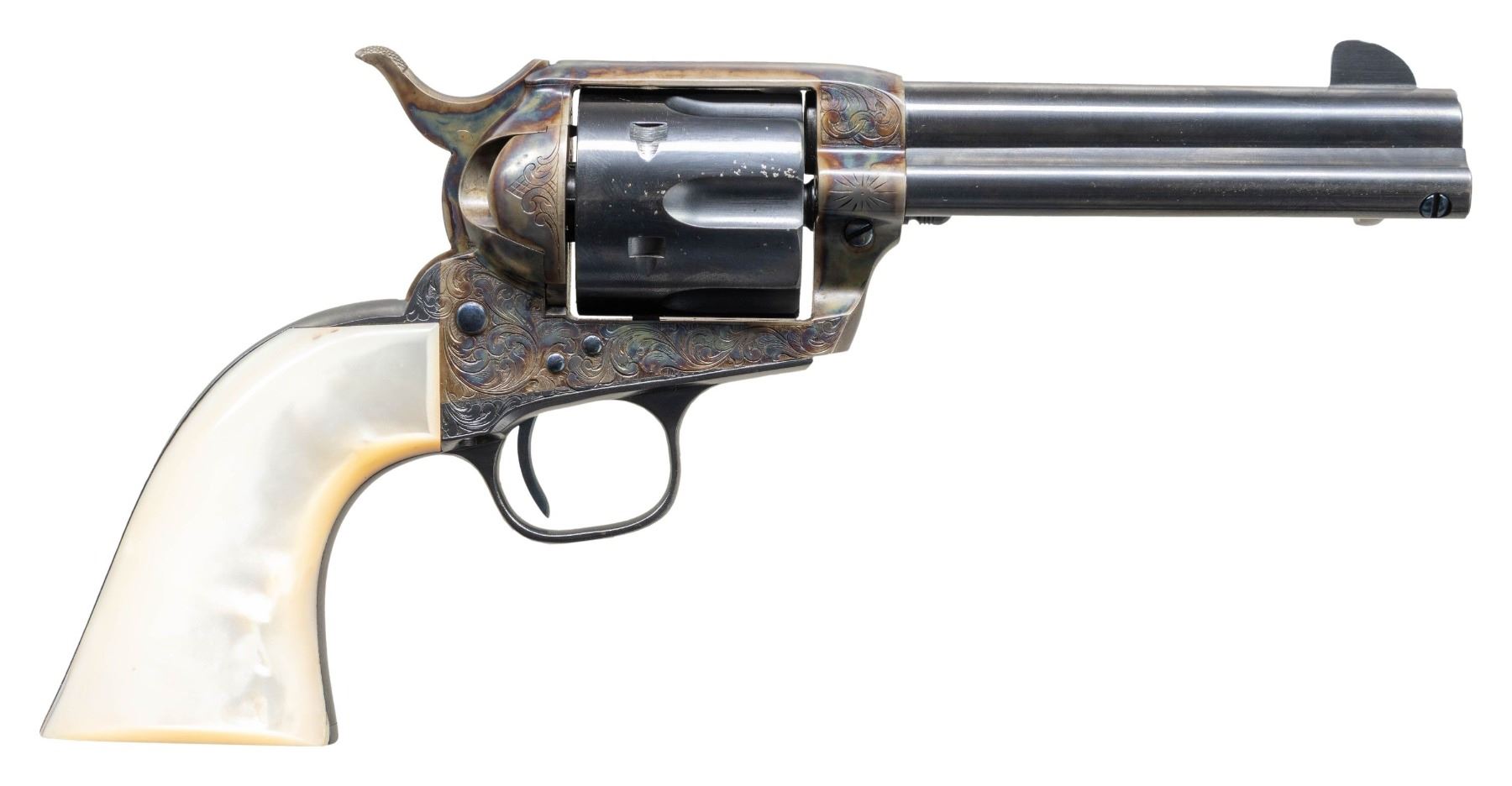 SINGLE ACTION ARMY REVOLVER. Cal. 45 Colt. S# 338911. Bbl. 4 3/4". First Generation Single Action Army revolver mfg. by Colt in 1920. Left side of the bbl. is marked "45 COLT", with Colt's 2-line address marked across the top. Left side of the frame is hand engraved with Colt's 2-line patent information. Sides of frame exhibit professionally executed bordered vine type scrollwork on a hatched background, with a starburst motif also engraved on the right. Matching pattern scrollwork extends to the sides of the trigger guard and rear grip strap. Frame, loading gate, and hammer exhibit a reapplied case colored finish. Frame screws, rear grip strap screws, and trigger exhibit a reheated nitre blue finish. Apparent contemporary replacement bbl., ejector rod assembly, cyl., trigger guard, and rear grip strap exhibit a blue finish. Frame is mounted with a 1-piece custom pearl grip. Standard SAA pattern blade front sight and frame notched rear sight. Trigger guard and rear grip strap have been renumbered to match, with the S# applied on the left, beneath the grip panel. UNATTACHED ACCESSORIES: plain cardboard box with mostly illegible Colt end label. CONDITION: frame, loading gate, and hammer retain the vast majority of their vibrant reapplied case colored finish, showing a few small spots of discoloration on the recoil shield. Blue parts retain the majority of their finish, showing some scattered spots of light surface oxidation, as well as some small scattered spots of flaking (predominately on the cyl. and let forward edge of the bbl.). Near mirror bore, exhibiting some very light pitting, with a small spot of mild pitting present towards the muzzle. Proper manual mechanics, with tight lock up. Grip shows some light superficial handling marks, with cracking present on the butt on either side at the grip strap. Box remains sound, with end label showing numerous losses. (25-1250/MLW). CURIO. $3,000-4,000.