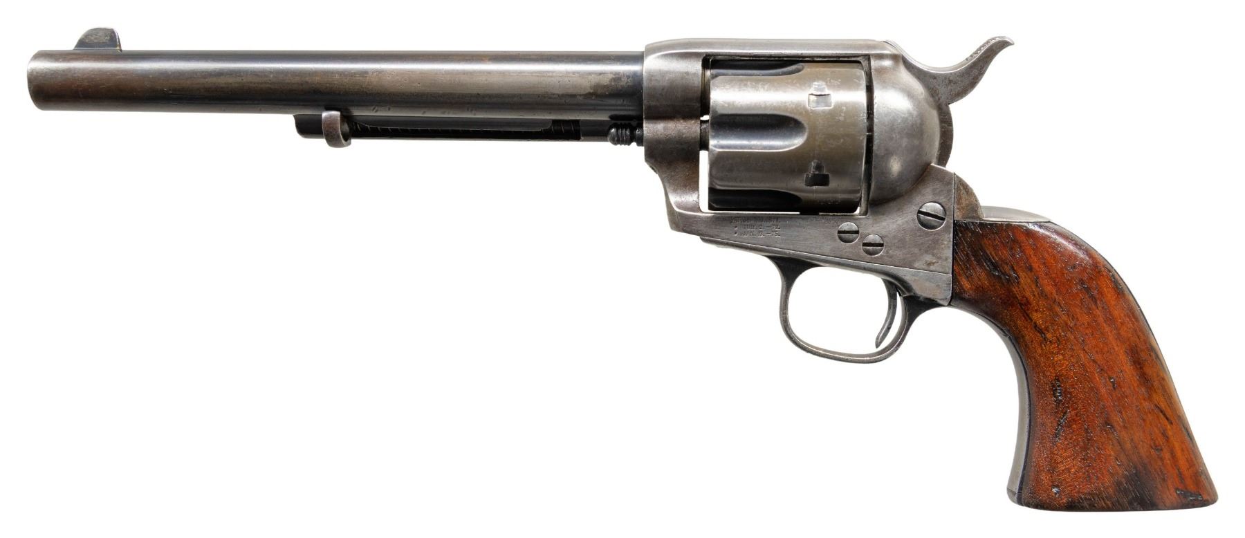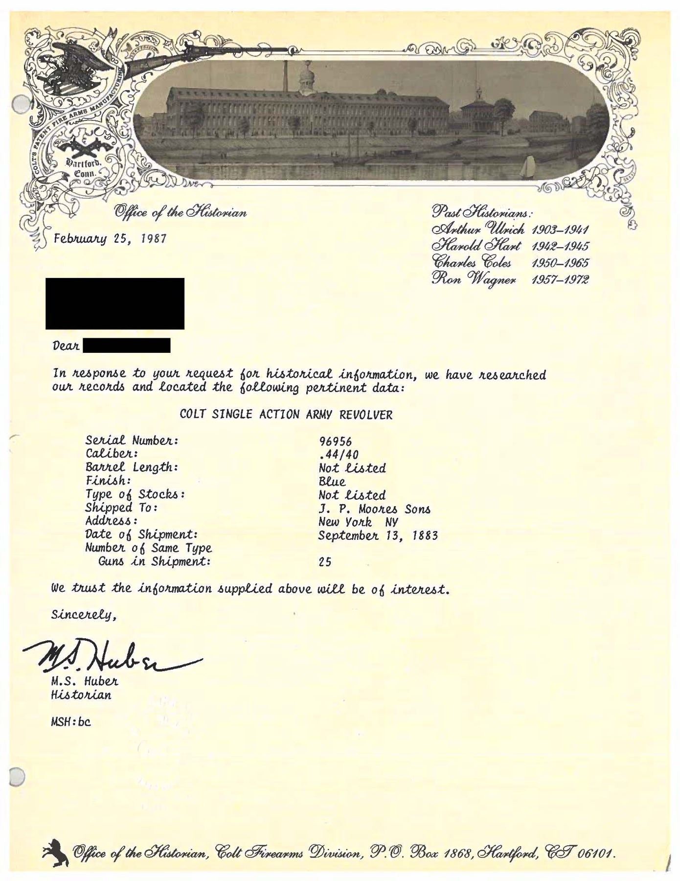 REVOLVER. Cal. 44-40. S# 96956. Bbl. 7 1/2" with Hartford address and etched panel cal. marking. 6-shot fluted cyl. Blue and case colored finish. Black powder frame. Frame, grip straps, and cyl. have matching S#s. 1-piece walnut grip. UNATTACHED ACCESSORIES: Colt factory letter stating: "Serial Number: 96956/ Caliber: .44/40/ Barrel Length: Not listed/ Finish: Blue/ Type of Stocks: Not Listed/ Shipped To: J.P. Moores Sons/ Address: New York NY/ Date of Shipment: September 13, 1883/ Number of Same Type Guns in Shipment: 25". CONDITION: bbl. and ejector housing retain 30% dull fading blue with slightly weakened etched panel cal. marking. Action and grip straps have largely faded to gray with scattered spots of light pitting. Cyl. shows numerous small dents. Heavily sanded and refinished grip have spots of darkened appearance with remaining dents and scratches. Action shows wear with slow timing, cyl. does not latch when slowly cocked. Bore has dark frosted appearance with moderately worn rifling. PROVENANCE: The Esteemed Norm Greenberg Collection. (01-27627/DS). ANTIQUE. $5,000-8,000.