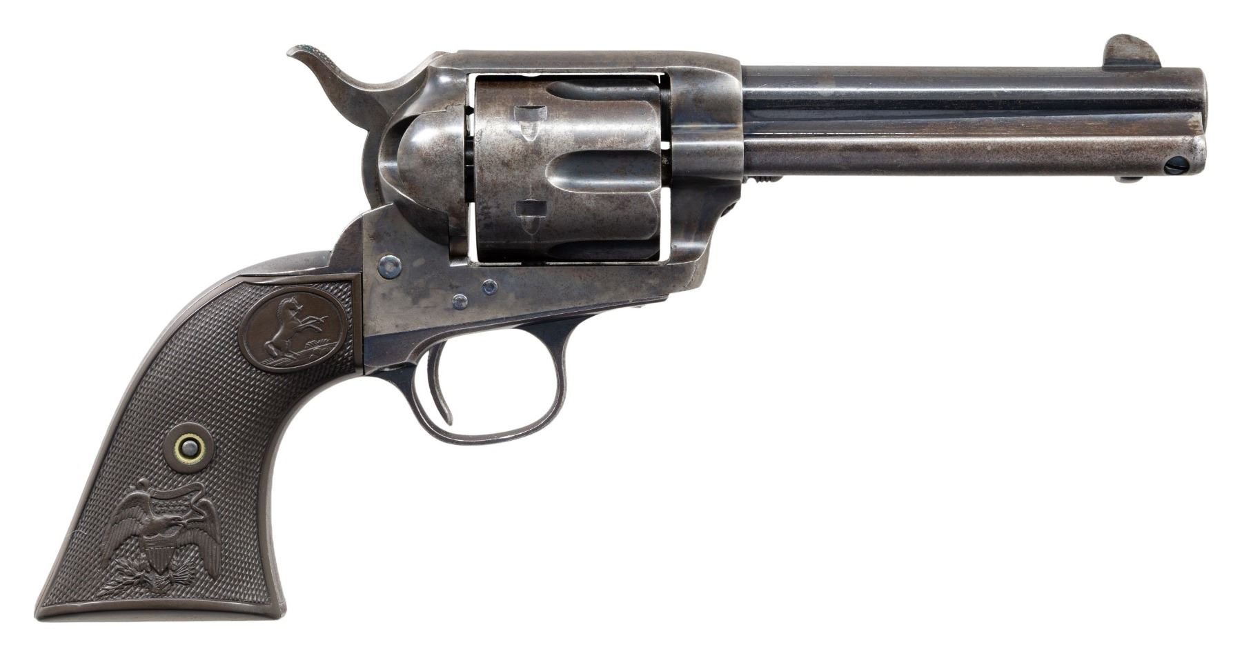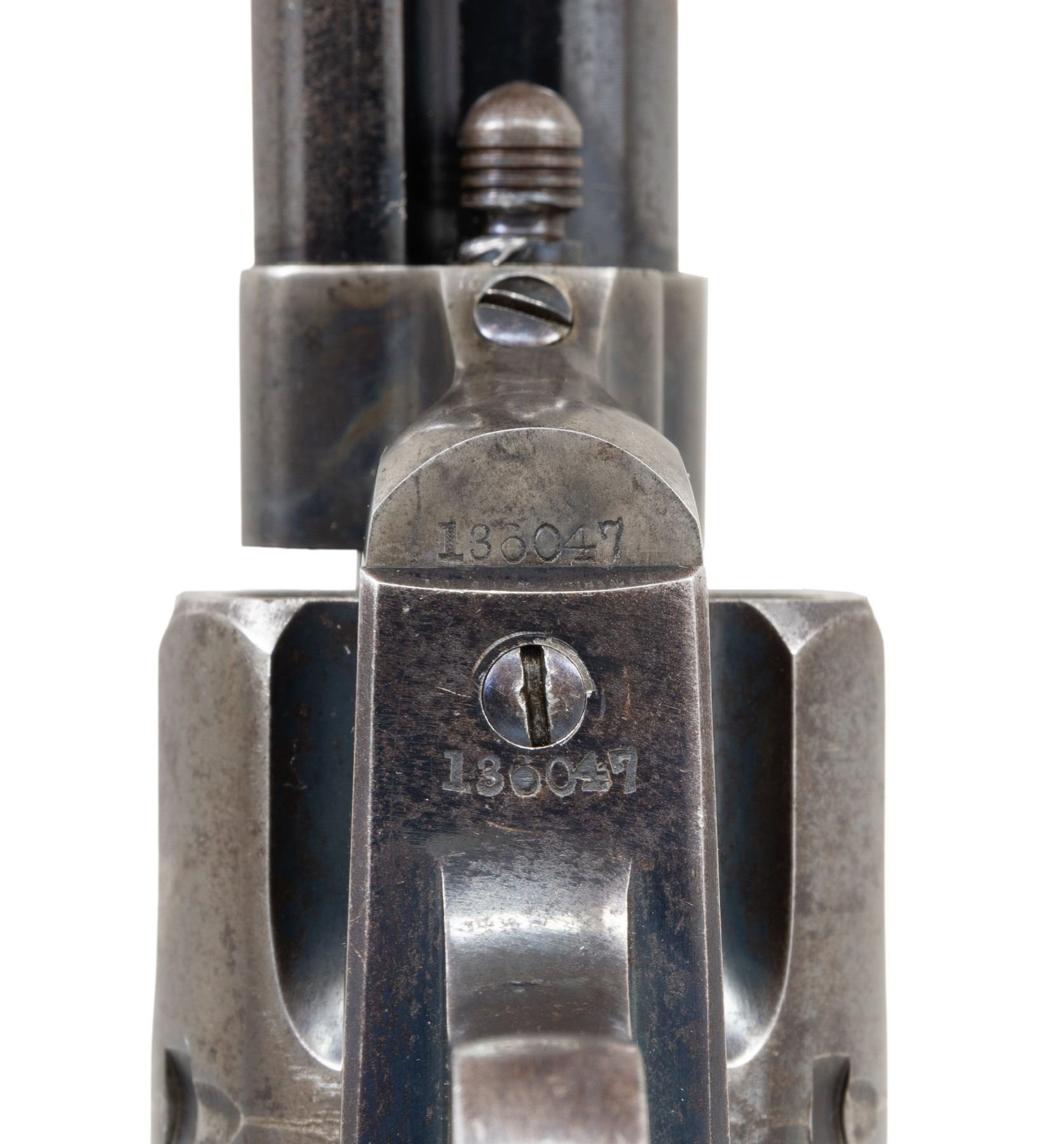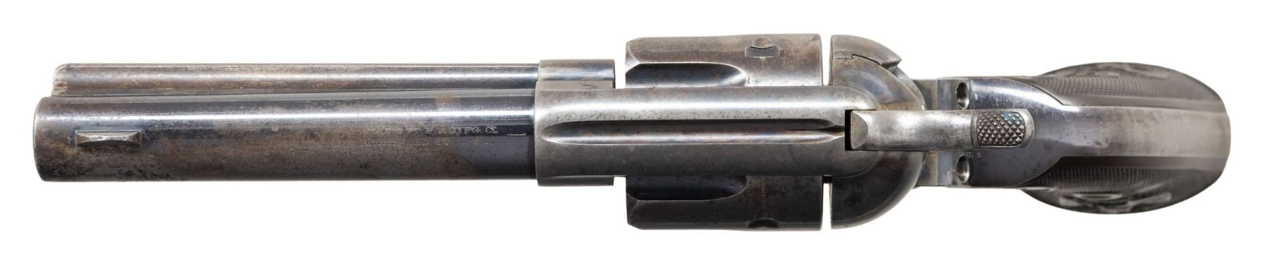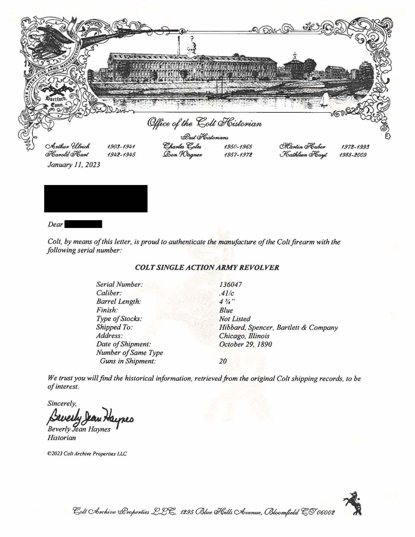 CHAMBERED IN DESIRABLE 41 COLT WITH FACTORY LETTER. Cal. 41 Colt. S# 136047. Bbl. 4 3/4". Mfg. 1890. The 41 Colt chambering, while not exactly rare is still quite scarce on comparison to other calibers. Introduced in 1885 to the SAA line, 1 year ahead of 38 cal introduction, only 19,676 SAAs were chambered in this caliber which is less than half of 38 W.C.F. production (50,520). Blued bbl., 6 shot fluted cyl & grip frame. Case hardened black powder frame and hammer. 2 Piece checkered hard rubber eagle grips. UNATTACHED ACCESSORIES: Colt factory letter stating the following: "Serial Number: 136047 / Caliber: .41/c / Barrel Length: 4 3/4" / Finish: Blue / Type of Stocks: Not Listed / Shipped To: Hibbard, Spencer, Bartlett & Company / Address: Chicago, Illinois / Date of Shipment: October 29, 1890 / Number of Same Type Guns in Shipment: 20". Condition: grip frame & trigger guard frame retain retain 40% blue with front and back strap having faded to gray with scattered brown patina. Cyl. retains 30% original blue, turning brown with scattered light peppery oxidation and cyl. drag line. Bbl. & ejector housing retain 40% original blue, mostly in protected areas with left side of bbl. exhibiting evidence of a clean up having all finish removed from muzzle to 3" rearward. Frame shows 30% muted original case colors, notably stronger in protected areas. Frame screw slots show minor distortion. Very good grips with a few areas of flattening to diamonds. Very good bore has a lightly frosted appearance with sharp rifling. (01-28381/BH). ANTIQUE. $4,500-6,500.