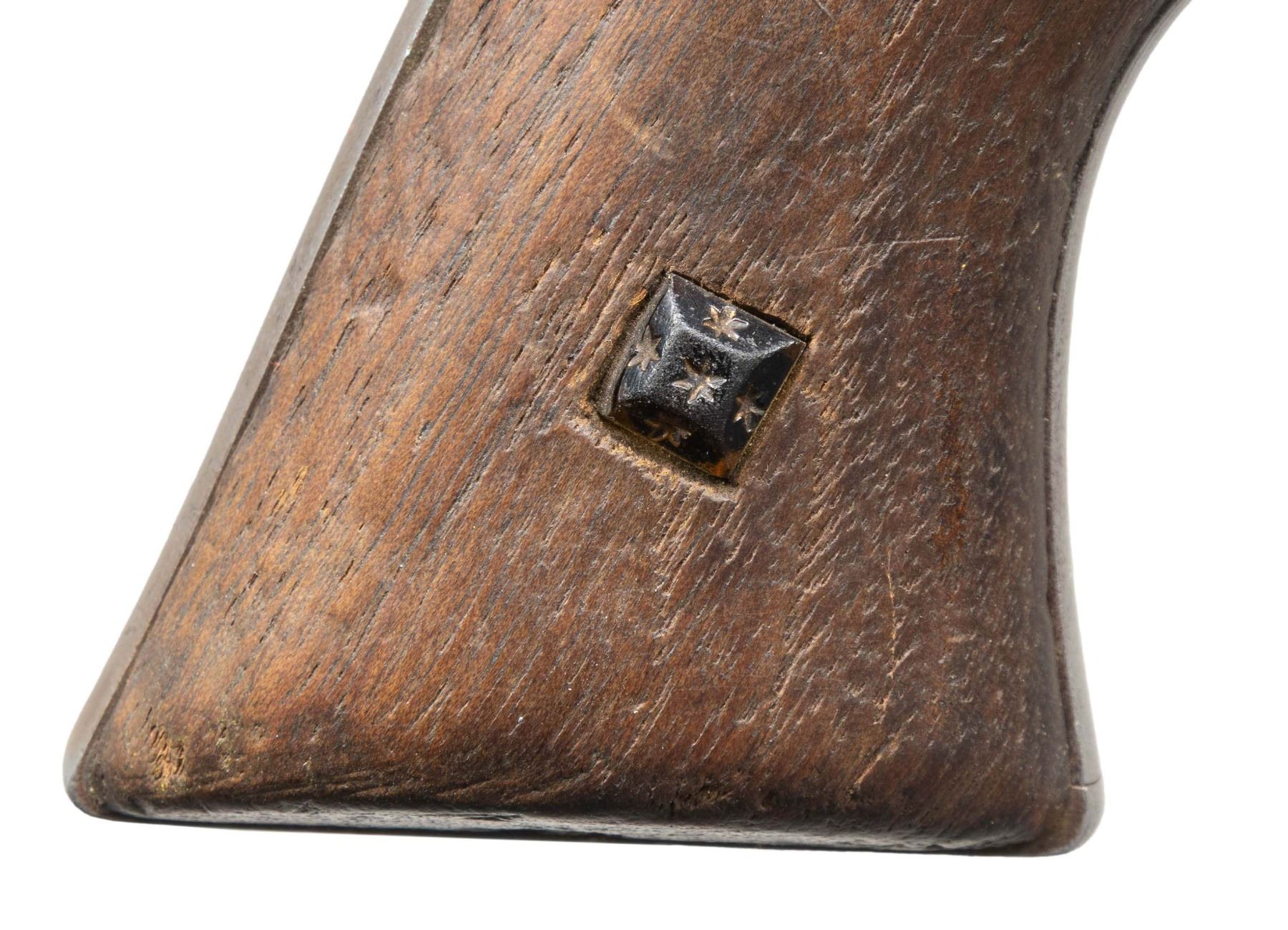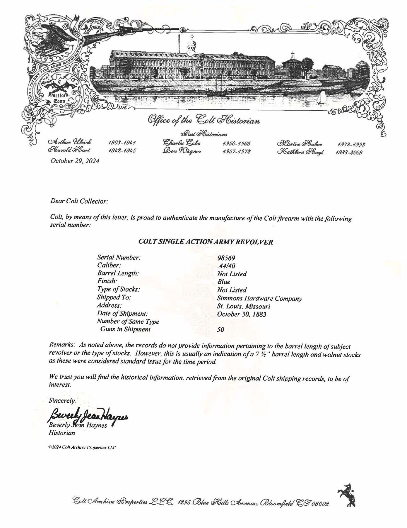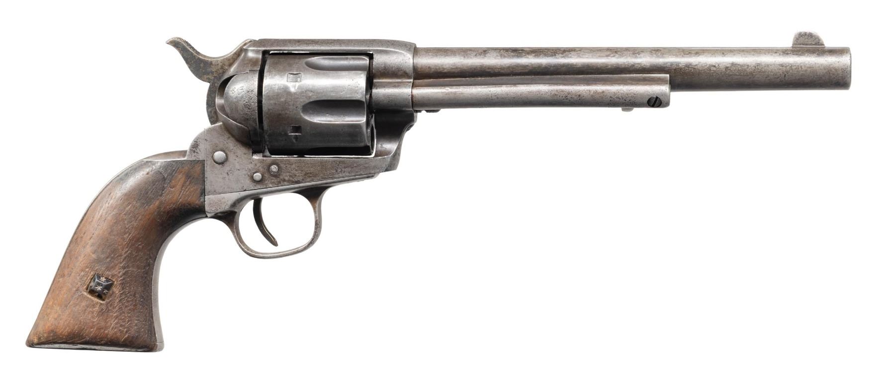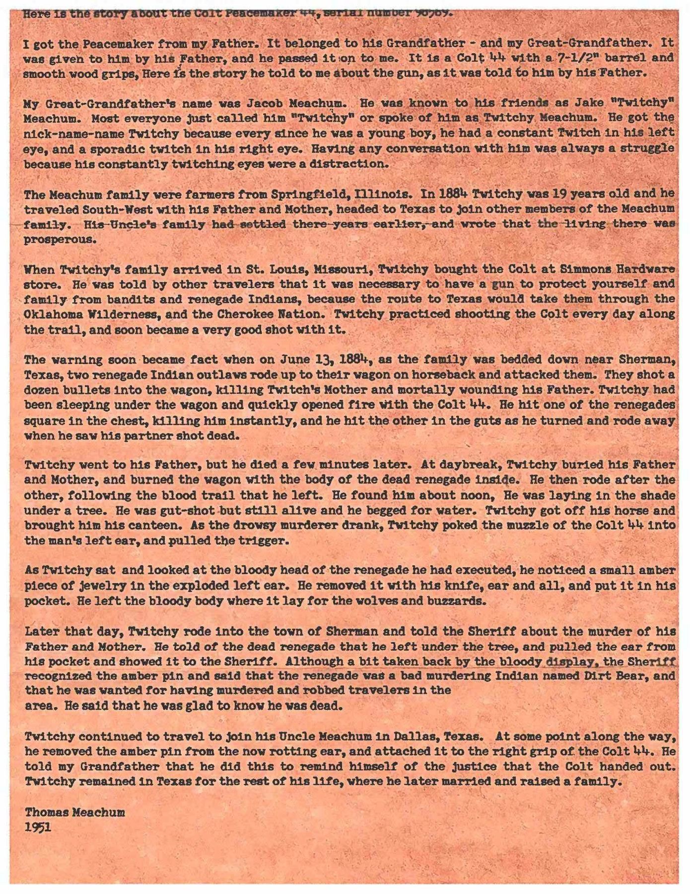 FRONTIER SIX SHOOTER WITH INTERESTING FAMILY HISTORY. Cal. 44-40. S# 98569. Bbl. 7 1/2" with blade front sight. Mfg. 1883. This interesting revolver comes with a typed letter from Thomas Meachum dated 1951 detailing this revolver's history. Excerpts from letter state "Here is the story the Colt Peacemaker 44, serial number 98569. I got the revolver from my father. It belonged to his Grandfather-and my Great-Grandfather. He was known to his friends as Jake "Twitchy" Meachum. Most everyone just called him "Twitchy" or spoke to him as Twitchy Meachum. He got the nick-name "Twitchy" because ever since he was a young boy, he had a constant twitch in his his left eye, and a sporadic twitch in his right eye. Having any conversation with him was always a struggle because his constantly twitching eyes were a distraction.". This MUST READ letter goes on to tell of the Meachum family's travels from Springfield, Illinois to Dallas, Texas. Letter goes into detail regarding events such as Twitchy's purchase of this revolver from Simmons Hardware in 1884, the renegade attack on Meachum's family on June 13, 1884, avenging the deaths of his parents by aforementioned renegades and even the affixment of the amber pin found on the right side of the grip which is explained as being an earring belonging to one of the renegades followed by: "He told my grandfather he did this to remind himself of the justice that the Colt handed out". See hi resolution scan of letter on our website. Revolver is stocked with original 1 piece walnut grip having matching number penciled in backstrap channel. Matching number also front on bottom of bbl. as well as small stamped "44". Right grip has decorative amber earring. UNATTACHED ACCESSORIES: letter pertaining to this revolver. Colt factory letter stating the following: Caliber: 44/40 / Serial Number: 98569 / Barrel Length: not listed / Finish: Blue / Type of Stocks: Not listed / Shipped to: Simmon's Hardware Company / Address: St. Louis, Missouri / Date of Shipment: October 30, 1883 / Number of Same Type Guns in Shipment: 50". CONDITION: appears original and complete, condition is consistent with a frontier used gun. Metal has faded to gray with cleaned appearance over prior pitting & retains only traces of bluing and case colors in protected areas. Grip has been sanded & refinished with moderate to heavy wear. Bore retains intact rifling with areas of oxidation & pitting. Mechanics in need of attention but still appears functional. A very neat frontier used Colt SAA with a fantastic letter. PROVENANCE: From the Buckstix Collection. (01-28596/BH). ANTIQUE. $4,000-6,000.