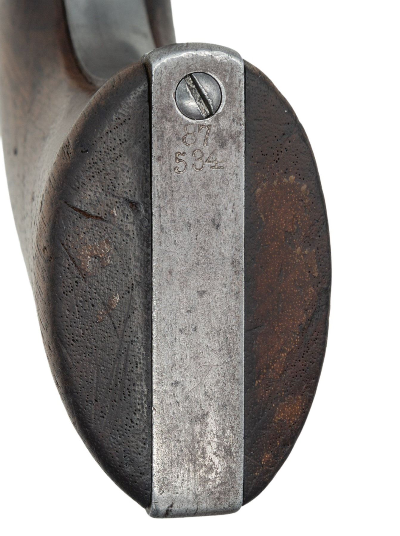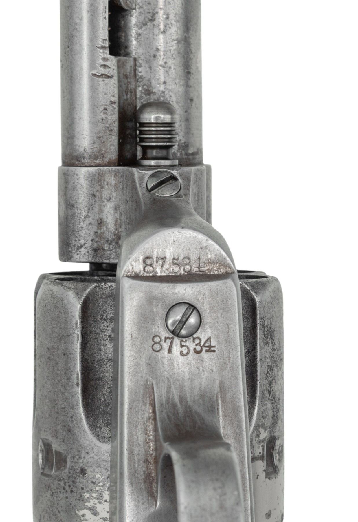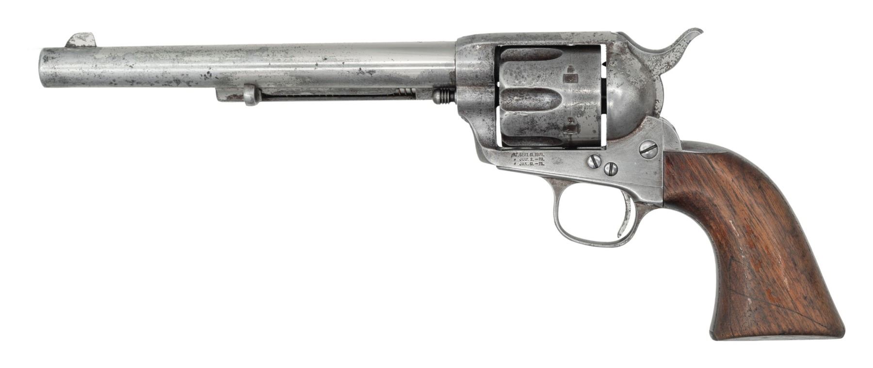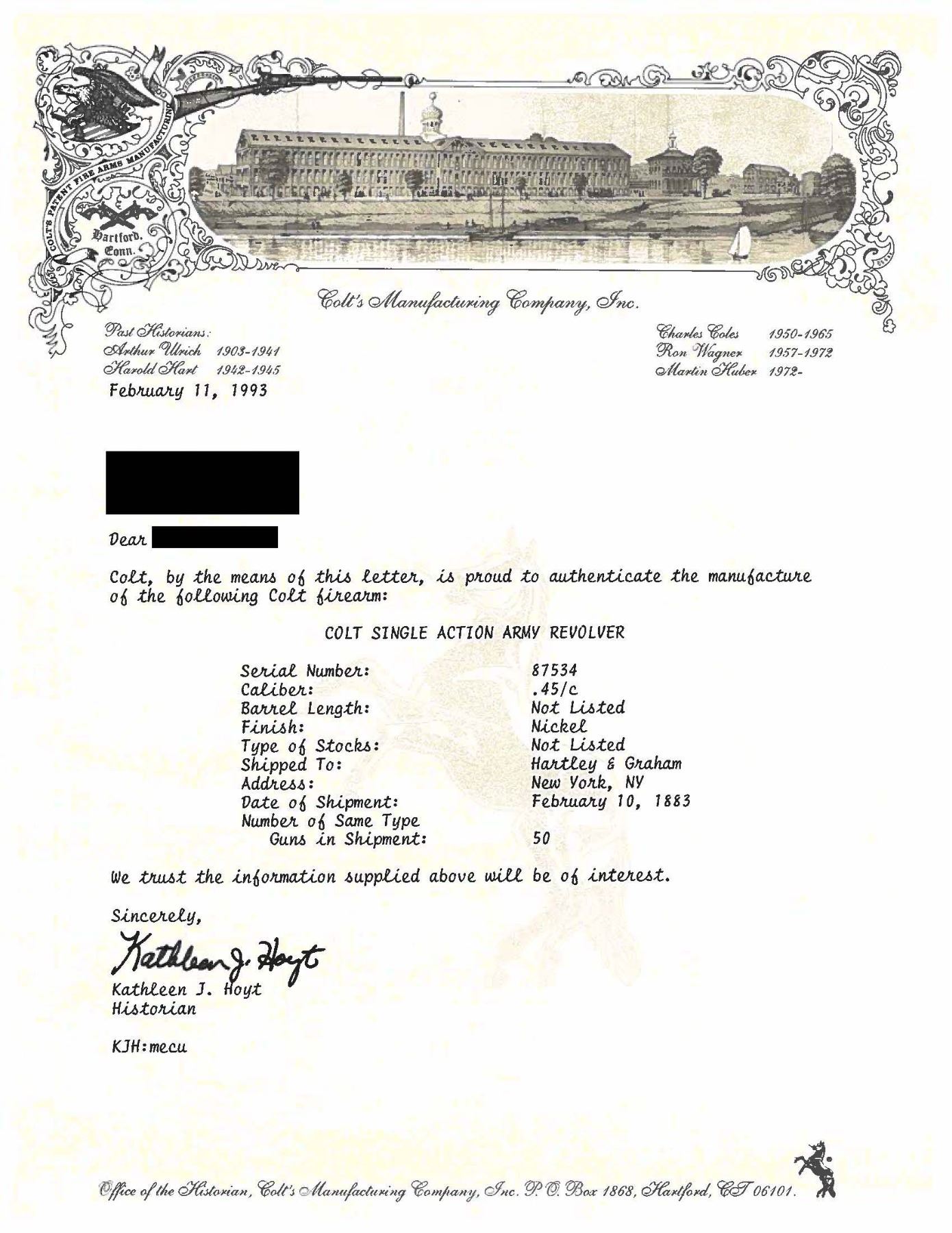 REVOLVER WITH FACTORY LETTER. Cal. 45 Colt. S# 87534. Mfg. 1883 Bbl. 7 1/2" with blade front sight & block letter barrel address without dashes. Front left side of trigger guard bow marked "45 Cal". Left side of frame has 3 line patent dates. Full nickel finish. 1 Piece smooth walnut grip has matching number in backstrap channel. Matching numbers on frame, butt & trigger guard frame. UNATTACHED ACCESSORIES: Colt factory letter stating the following: Serial Number: 87534 / Caliber: .45/c / Barrel Length: Not Listed / Finish: Nickel / Type of Stocks: Not Listed / Shipped To: Hartley & Graham / Address: New York, NY . Date of Shipment: February 10, 1883 / Number of Same Type Guns in Shipment: 50". CONDITION: metal parts retain 20% original nickel finish; balance has flaked away. Frame & cyl. show evidence of cleaning with sharp edges have been lightly rounded. Grip has been lightly sanded & refinish with scattered spots of varnish remaining. Left grip shows a couple old moderate scratches. Bore retains strong rifling with frosting in grooves. Mechanically sound with some minor play in action, all 4 clicks present and hold strong at full cock. PROVENANCE: From the Buckstix Collection. (01-28605/BH). ANTIQUE. $4,000-6,000.