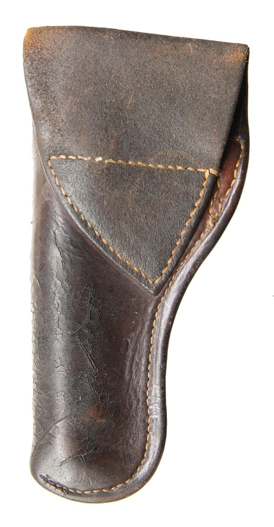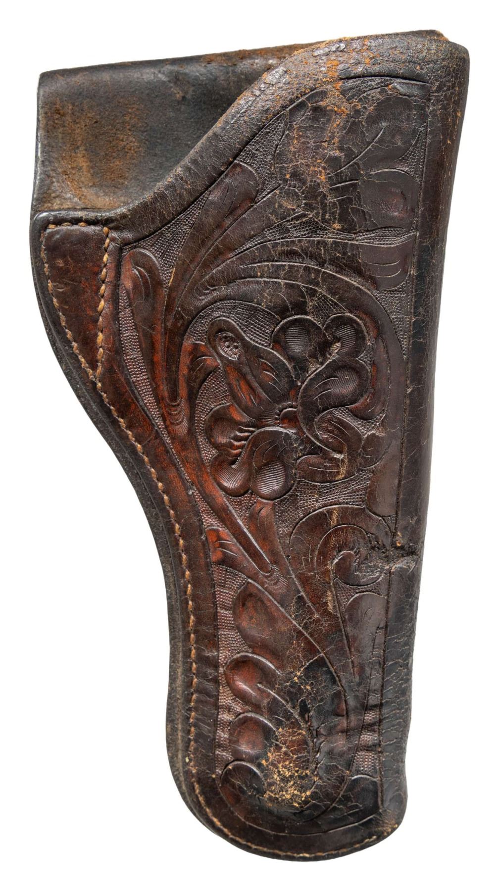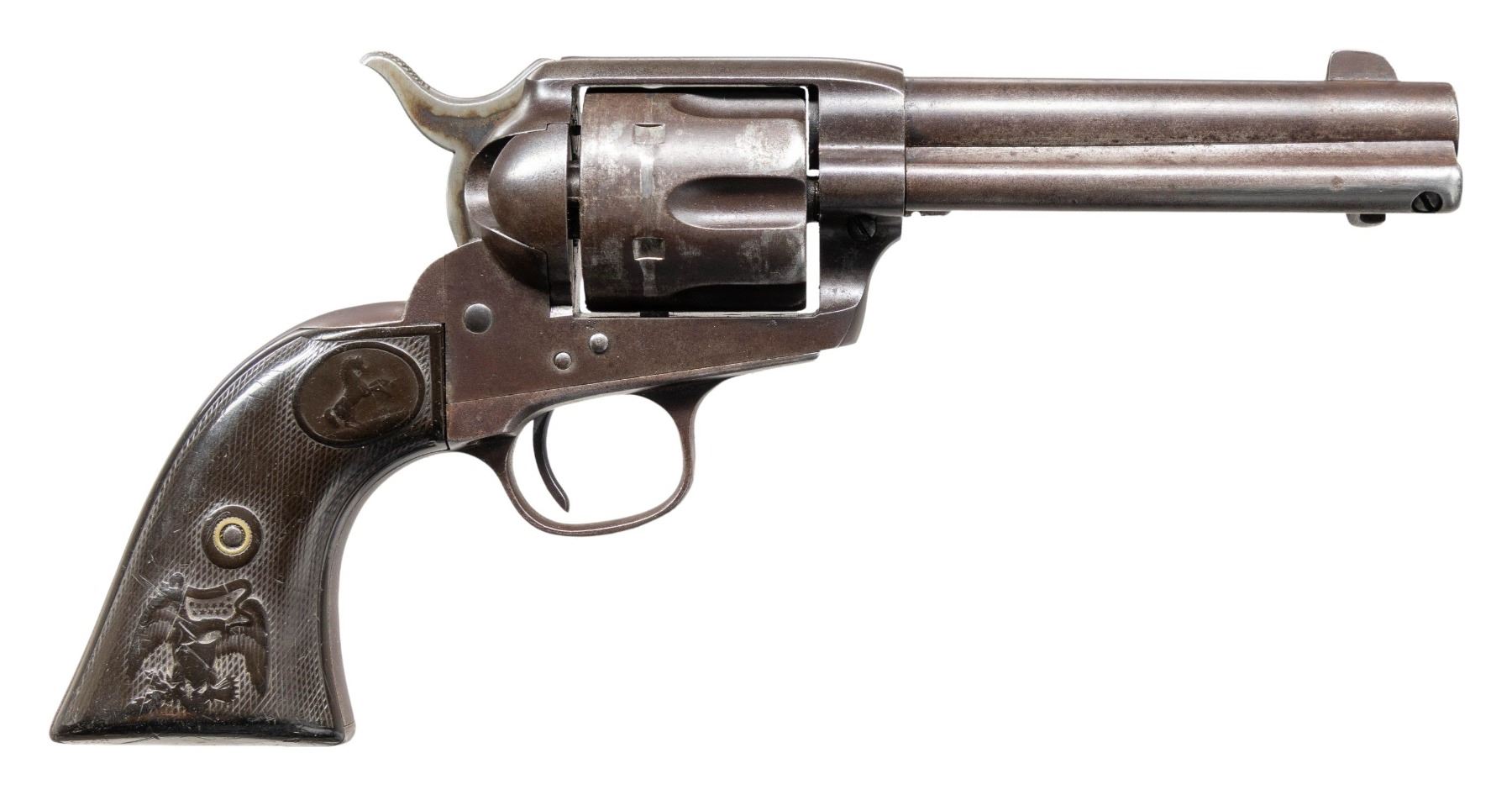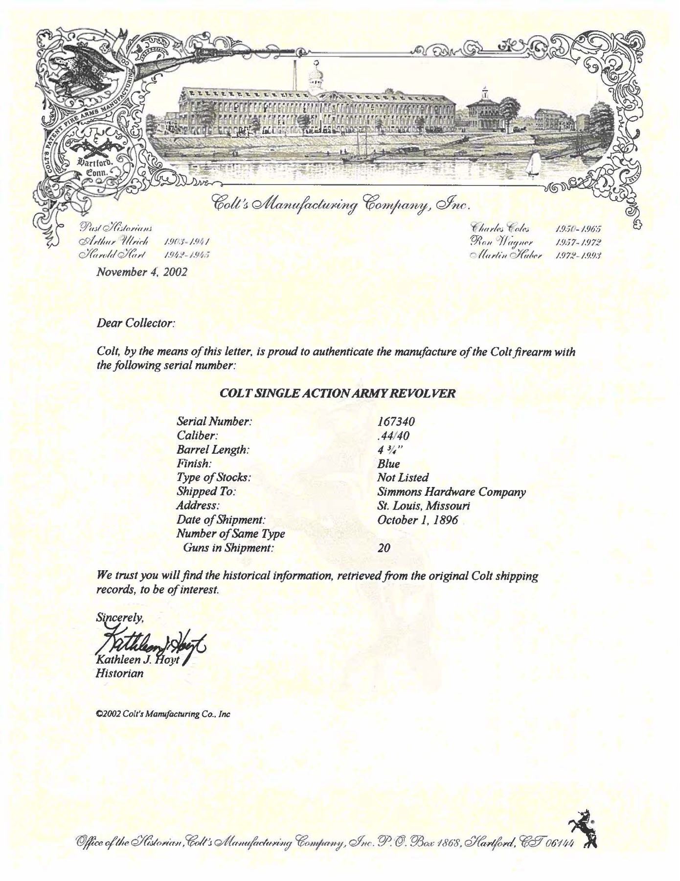 SHOOTER SAA REVOLVER WITH FACTORY LETTER & TOOLED LEATHER HOLSTER. Cal 44-40. S# 167340. Mfg. 1896. Bbl. 4 3/4" with 2 line bbl. address & low profile blade front sight. Up until 1896, Colt SAA frames were mfg with a transverse frame screw mfg to holt the cyl. pin in place, beginning with S# 164000 (approx.), the company made a switch to the pushbutton release as seen here. The design remains the same to this day. With the Federal legislation of 1968 classifying firearms manufactured prior to 1899 as antique, a small window was created in which these push button release guns are considered antique (1896-1898). Left side of frame roll stamped "COLT FRONTIER SIX SHOOTER". Hammer appears replacement. Revolver is stocked with 2 piece checkered hard rubber "Eagle" grips. UNATTACHED ACCESSORIES: vintage tooled leather holster marked at front near loop "RJ ANDREWS / SAN ANTONIO". Colt factory letter stating the following: "Serial Number: 167340 / Caliber: .44/40 / Barrel Length: 4 3/4" / Finish: Blue / Type of Stocks: Not Listed / Shipped To: Simmons Hardware Company / Address: St. Louis, Missouri / Date of Shipment: October 1, 1896 / Number of Same Type Guns in Shipment: 20". CONDITION: metal has faded to an even brown patina with light oxidation & fine pitting. Grips are worn with handling marks & scratches. Fair bore shows strong rifling with darkened areas of pitting. Mechanically fine.PROVENANCE: From the Buckstix Collection. (01-28604/BH). ANTIQUE. $2,500-3,500.