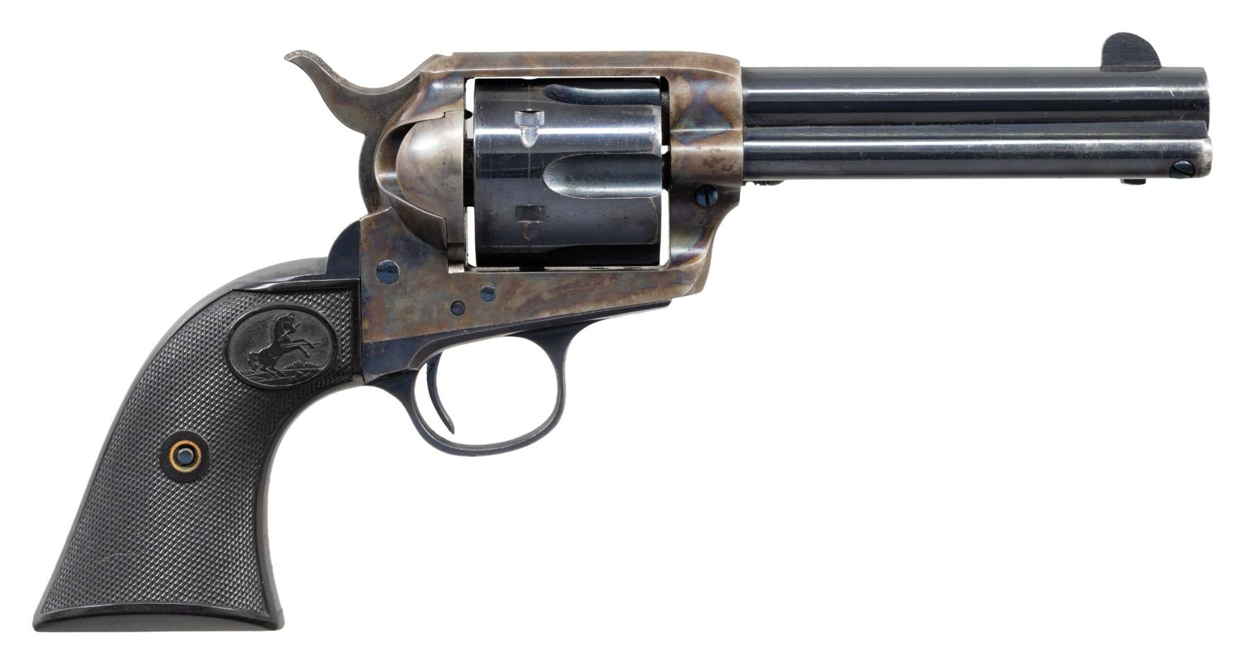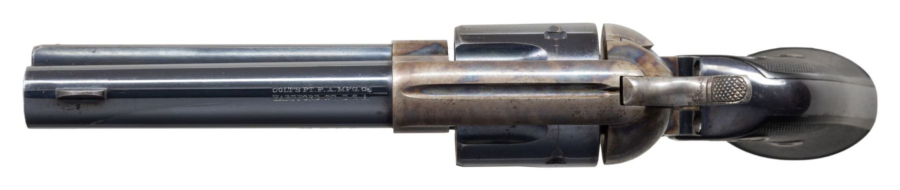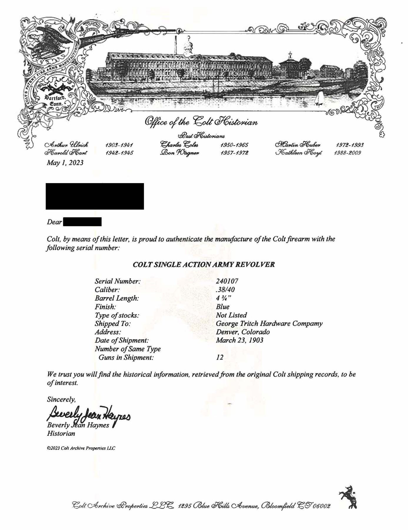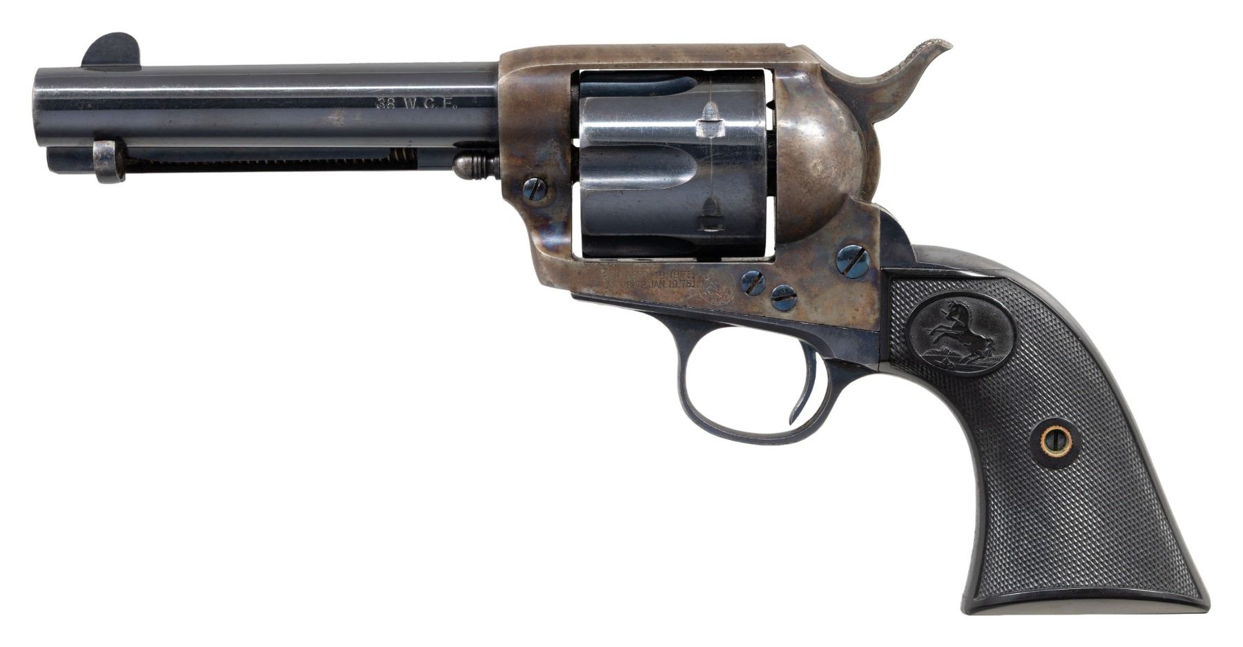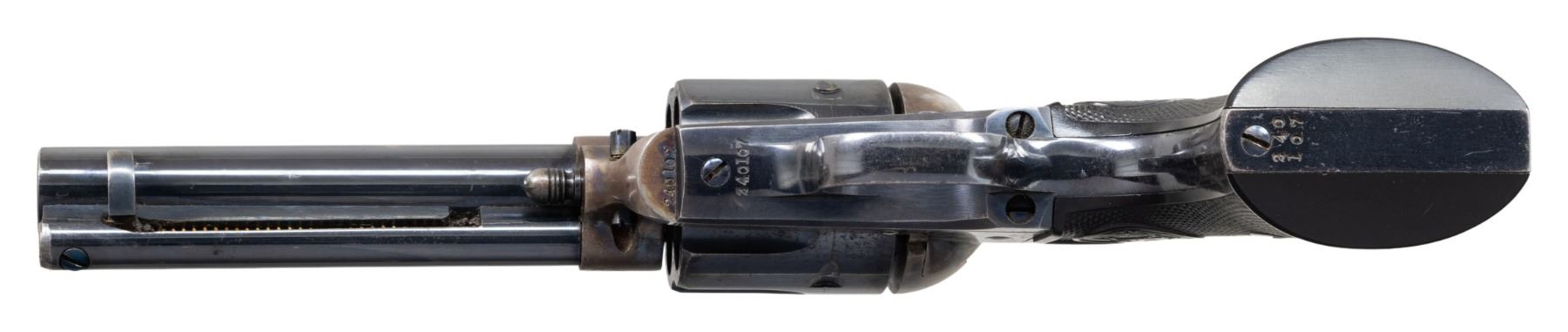 COLT SAA REVOLVER WITH FACTORY LETTER. Cal. 38-40. S# 240107. Bbl. 4 3/4" with blade front sight. Colt SAA revolvers chambered in 38 W.C.F. were produced in a much smaller quantity that the standard 45 Colt (50,520 vs 158,885). This example was mfg 1903 and has no verified "VP" mark on the trigger guard, meaning it was not guaranteed for smokeless loads. Matching numbers on frame, trigger guard frame & butt. Blued bbl., ejector housing, 6 shot fluted cy. & grip frame. Case hardened frame & hammer. Nitre blued screws & trigger. 2 Piece checkered hard rubber Rampant Colt grips. UNATTACHED ACCESSORIES: Colt factory letter stating the following: "Serial Number: 240107 / Caliber: .38/40 / Barrel Length: 4 3/4" / Finish: Blue / Type of stocks: Not Listed / Shipped To: George Tritch Hardware company / Address: Denver, Colorado / Date of Shipment: March 23, 1903 / Number of Same Type Guns in Shipment: 12". CONDITION: blued metal parts retain 75-80% original finish with areas of mild thinning, high edge wear, moderate cyl. drag line and slight freckling. Case hardened parts retain 75-80% vivid, original case colors with light fading and areas of peppery oxidation. Screw heads are all crisp with exception of light screw slot distortion on butt screw. Very good grips. Bright, shiny bore with crisp rifling. Mechanically excellent, all 4 clicks present. A very nice example of a Western shipped turn of the Century mfg. SAA. (25-5778/BH). CURIO. $5,500-8,500