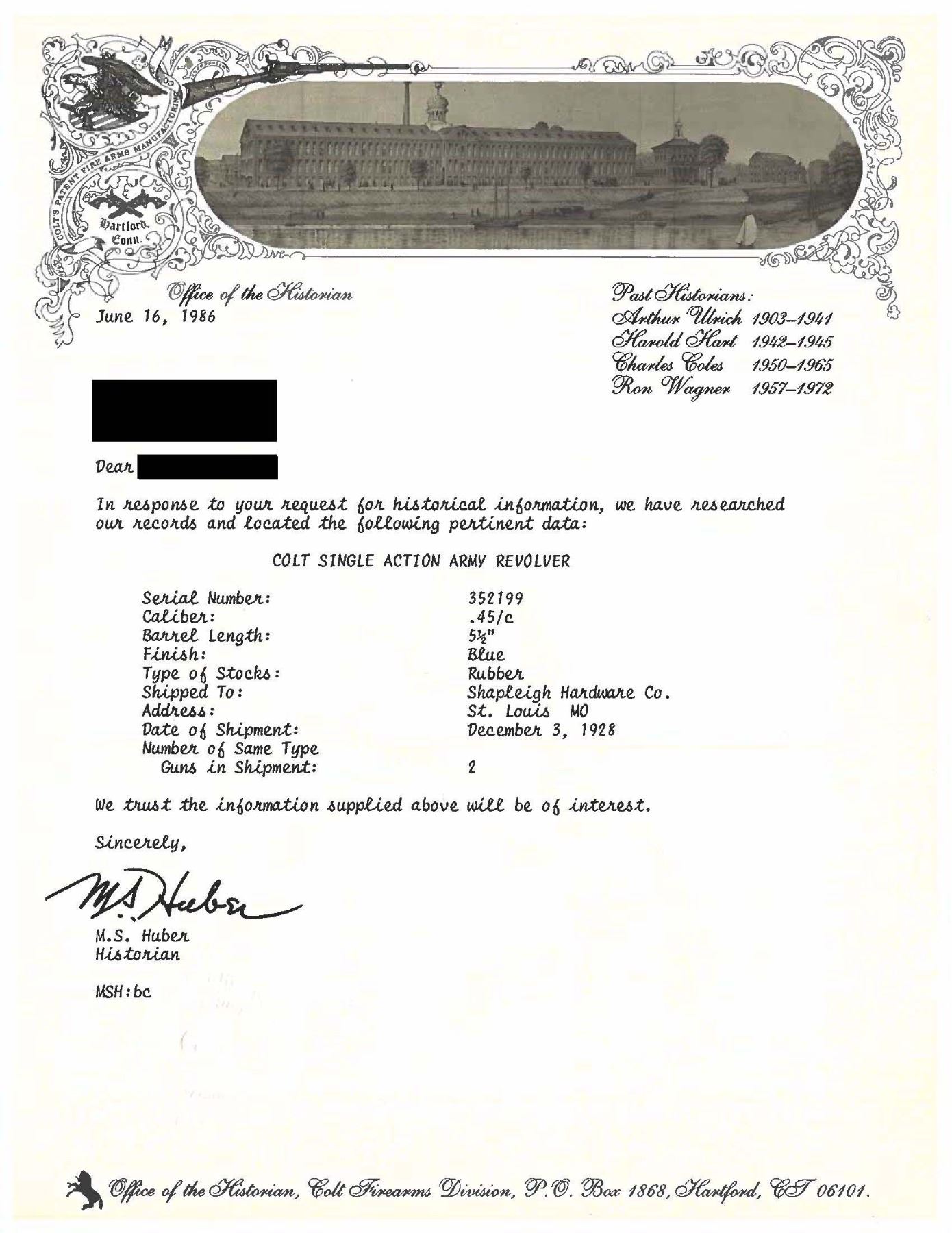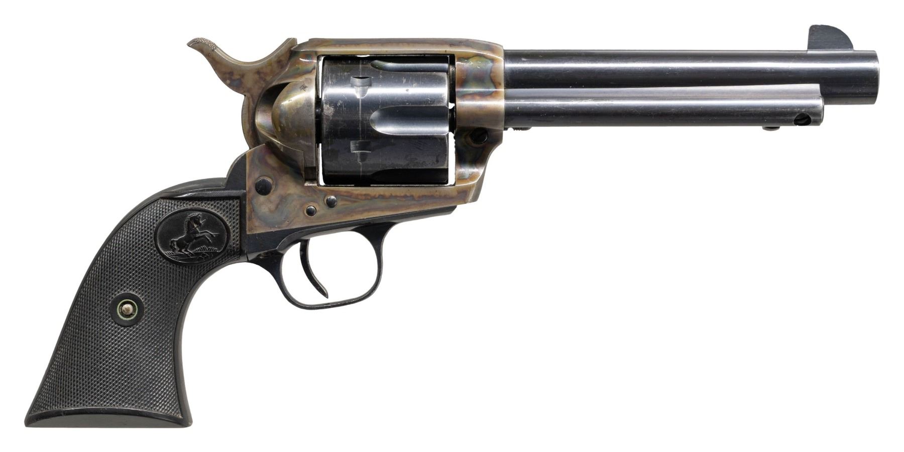 Cal. 45 Colt. S#. 352199. Bbl. 5 1/2". six shot fluted cyl. Blue & case colored finish. Checkered hard rubber 2 piece rampant colt grips. UNATTACHED ACCESORIES: Colt Firearms Division letter stating: "Serial Number: 352199, Caliber: .45/c, Barrel Length: 5 1/2", Finish: Blue, Type of Stocks: Rubber, Shipped To: Shapleigh Hardware Co., Address: St. Louis, MO, Date of Shipment: December 3, 1928, Number of Same Type Guns in Shipment: 2." CONDITION: over 75% blue showing some edge & carry wear witha cyl. drag line. Action retains over 60% lightly faded case colors. Grips show light wear. Sound mechanics. Very good bore. PROVENANCE: The Esteemed Norm Greenberg Collection. (25-4172/DS). CURIO. $3,500-5,500.