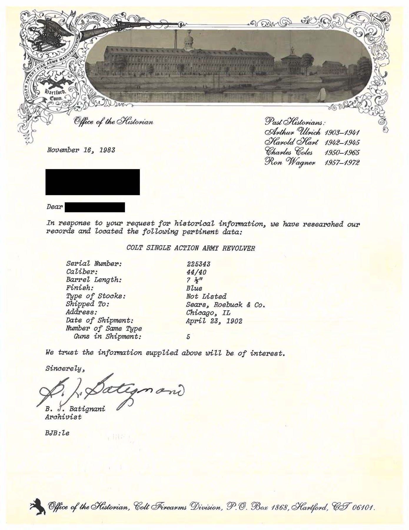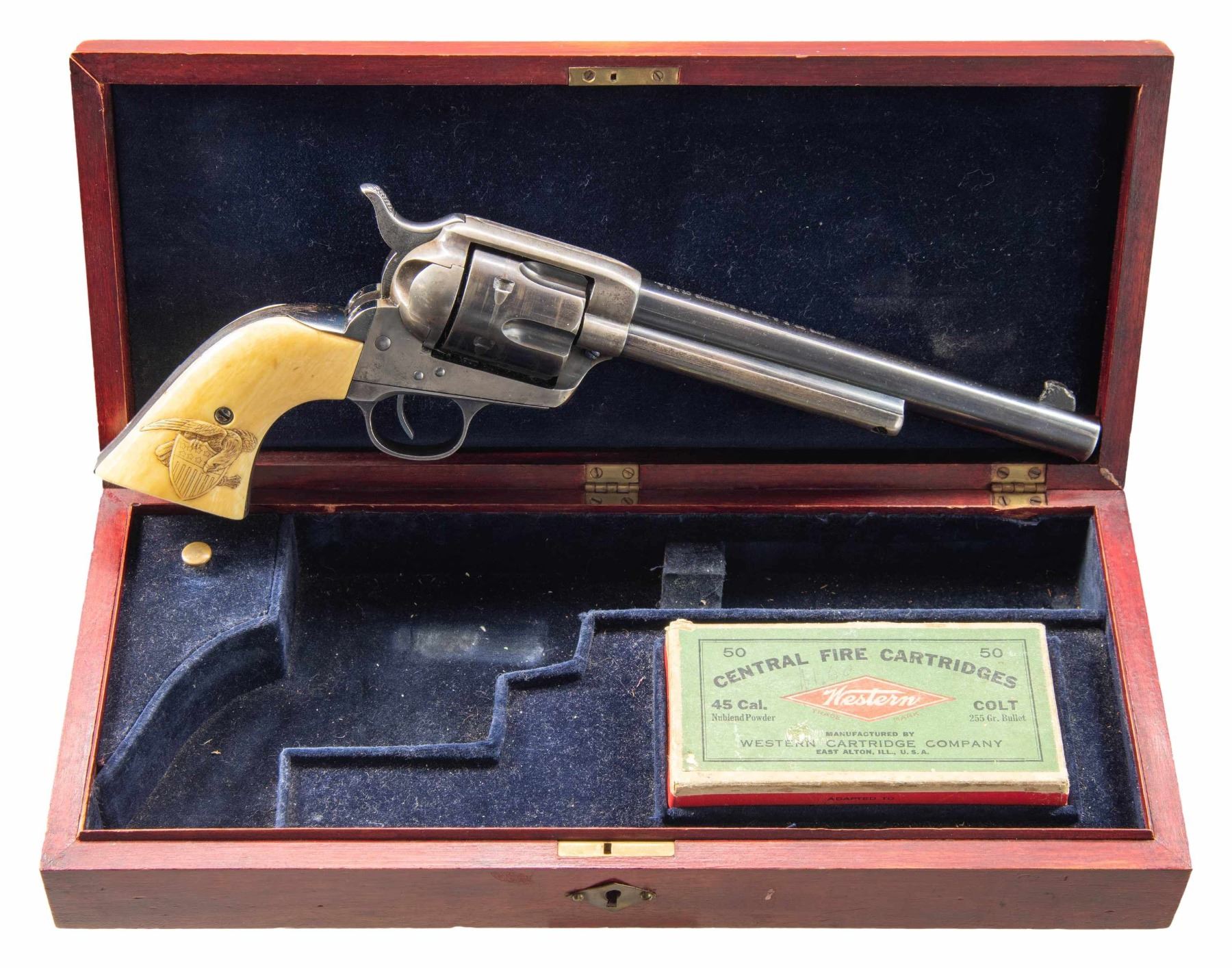 REVOLVER. Cal. 44-40. S# 225343. Bbl. 7 1/2" with thinned front sight having an added brass blade with a slight bend to the left. 6-shot fluted cyl. Blue and case colored finish. Added 2-piece ivory grips, both sides are ornamented with relief carved American eagles and shields. UNATTACHED ACCESSORIES: Colt factory letter stating: "Serial Number: 225343/ Caliber: 44/40/ Barrel Length: 7 1/2"/ Type of Stocks: Not Listed/ Shipped To: Sears, Roebuck & Co./ Address: Chicago, IL/ Date of Shipment: April 23, 1902/ Number of Same Type Guns in Shipment: 5". Gun is housed in an added wood case with blue velour fitted interior. Case contains a partial box of Western .45 Colt cartridges, a screw driver, and a small plastic bottle of oil. CONDITION: 60% fading blue showing carry wear. Frame has 20% lightly visible case colors. Grips have acquired a mild aged patina. Action shows wear, missing 1 notch. Bore retains sound rifling. PROVENANCE: The Esteemed Norm Greenberg Collection. (25-4159/DS). CURIO. $3,000-5,000.