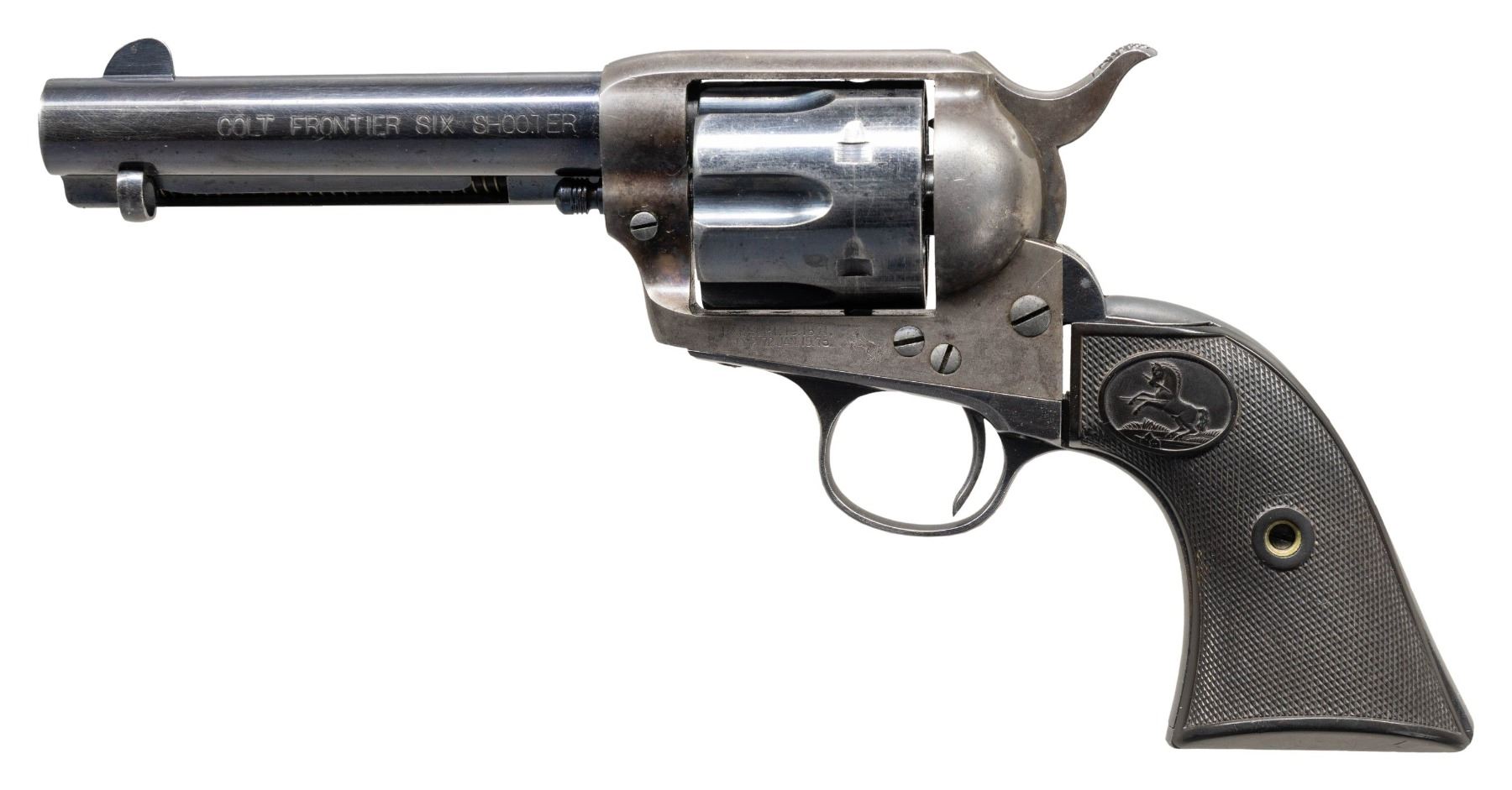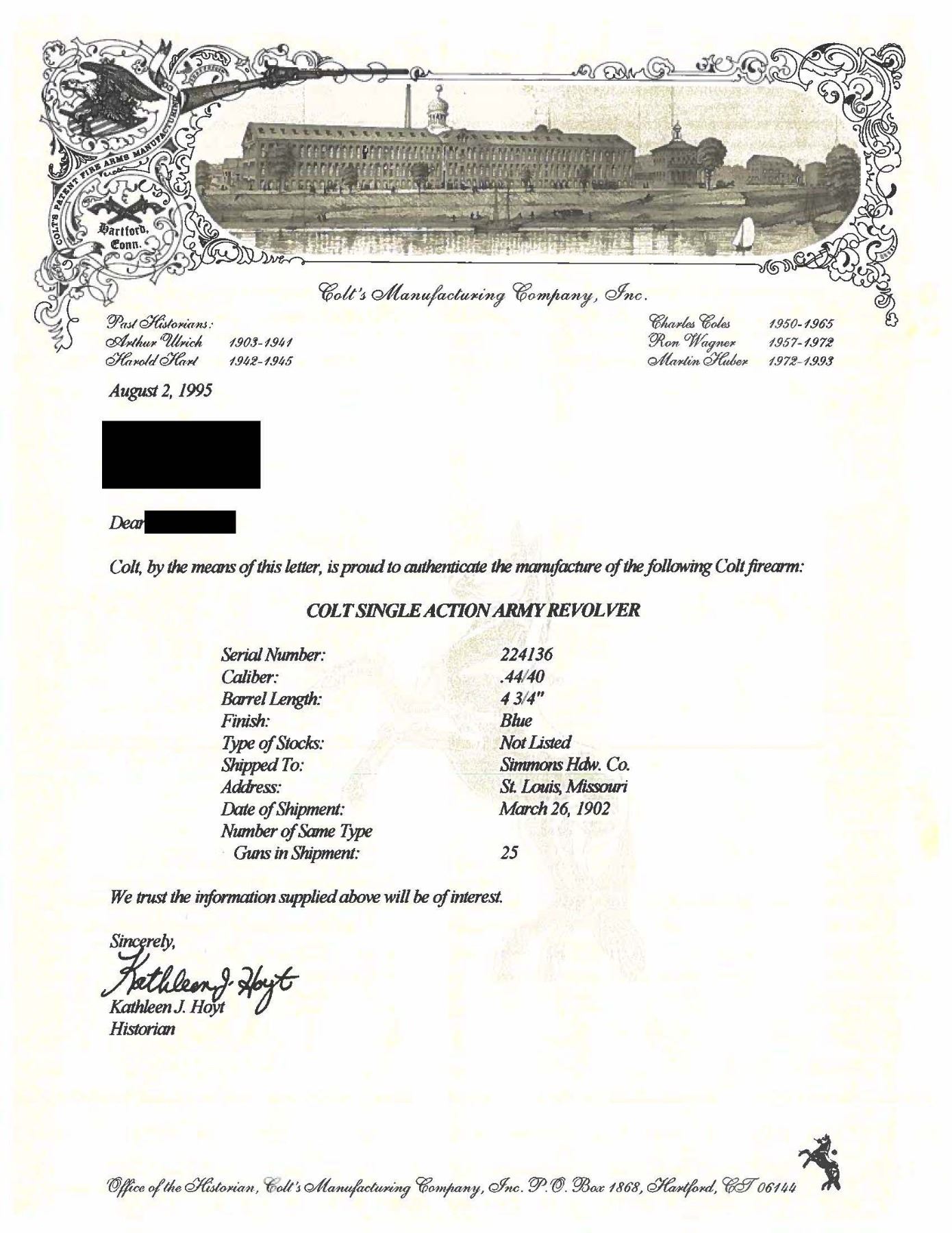 REVOLVER. Cal. 44-40. S# 224136. Bbl. 4 3/4". 6-shot fluted cyl. Blue and case colored finish. 2-piece checkered hard rubber Rampant Colt grips. UNATTACHED ACCESSORIES: Colt factory letter stating: "Serial Number: 224136/ Caliber: .44/40/ Barrel Length: 4 3/4"/ Finish: Blue/ Type of Stocks: Not Listed/ Shipped To: Simmons Hdw. Co./ Address: St. Louis, Missouri/ Date of Shipment: March 26, 1902/ Number of Same Type Guns in Shipment: 25". CONDITION: bbl., cyl., and grip straps retain over 60% original blue showing carry wear with a cyl. dragline. Frame has largely faded to gray with some muted case colors visible in protected areas. Grips show light wear with a poor fit to the frame and may be replacements. Sound mechanics. Bore retains sound rifling showing spots of light pitting. PROVENANCE: The Esteemed Norm Greenberg Collection. (25-4180/DS). CURIO. $2,750-3,750.