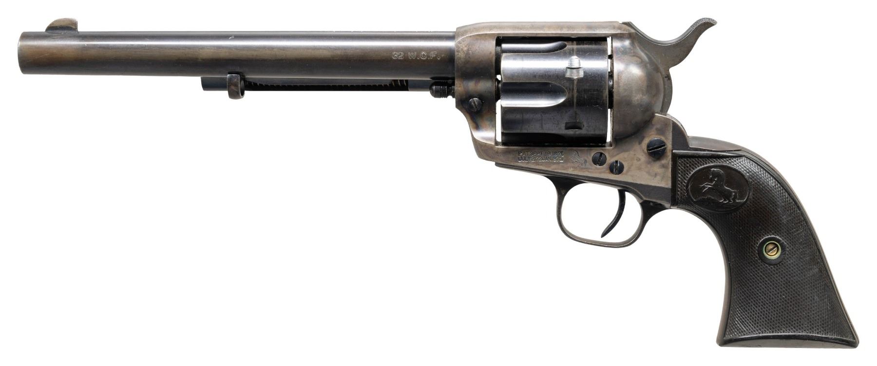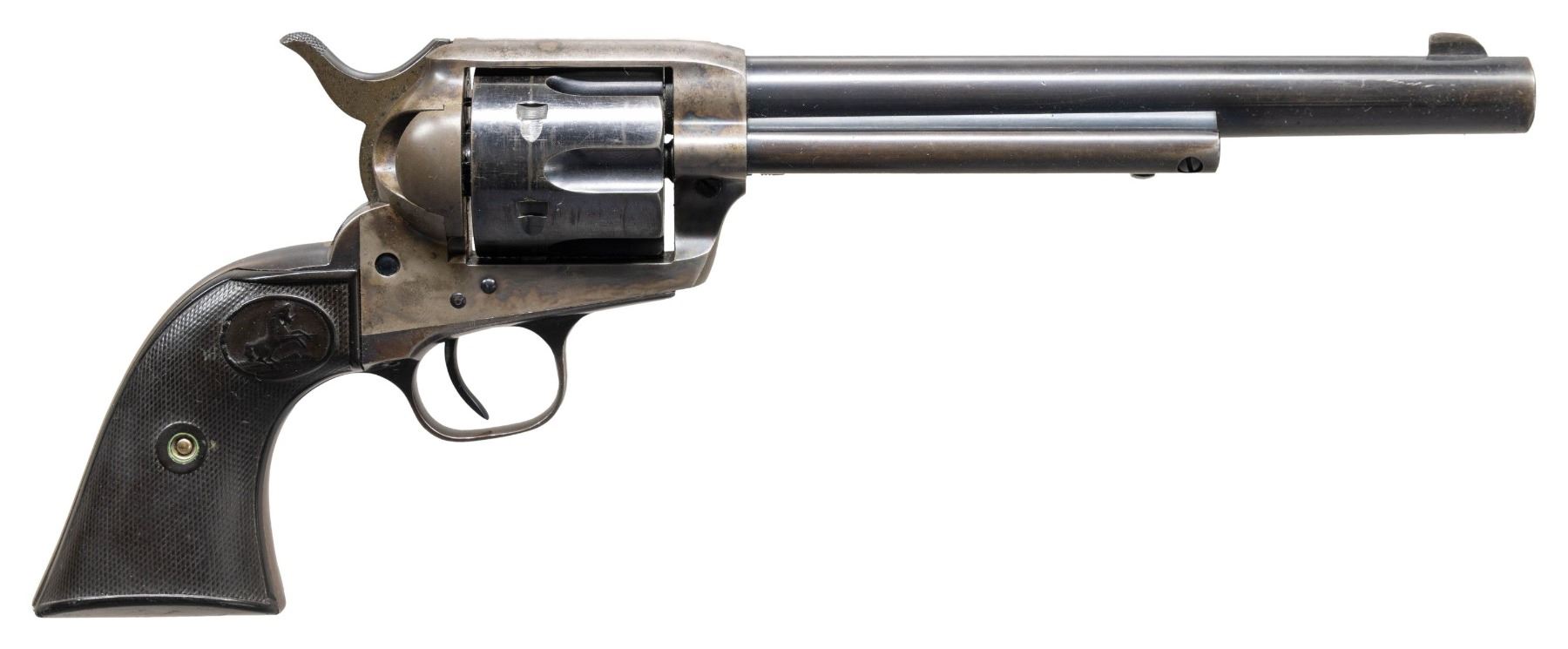 Cal. 32 WCF. (32-20). S# 342019. Bbl. 7 1/2". Six shot fluted cyl. Blue & case colored finish Two piece checkered hard rubber rampant colt grips. Mfg. 1922. CONDITION: over 70% lightly faded blue. The action retains over 30% fading case colors. Grips show checkering wear & handling marks. The front sight has been lowered and thinned with a file. The action shows some wear. The bore is generally bright with sound rifling. PROVENANCE: The Esteemed Norm Greenberg Collection. (25-4124/DS). CURIO. $2,500-3,500.