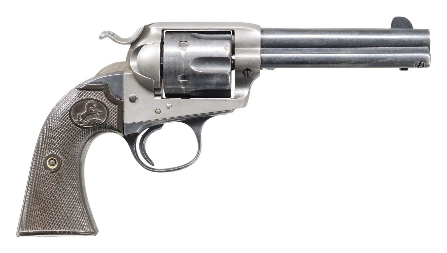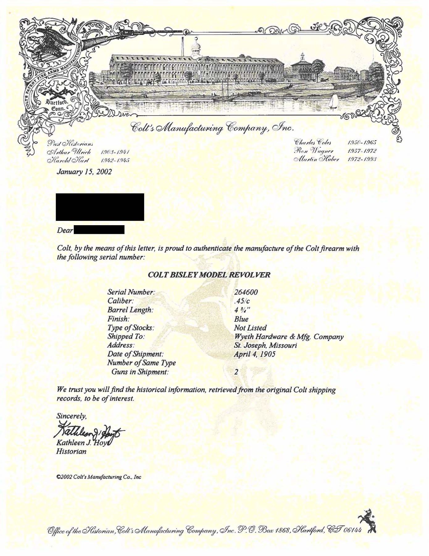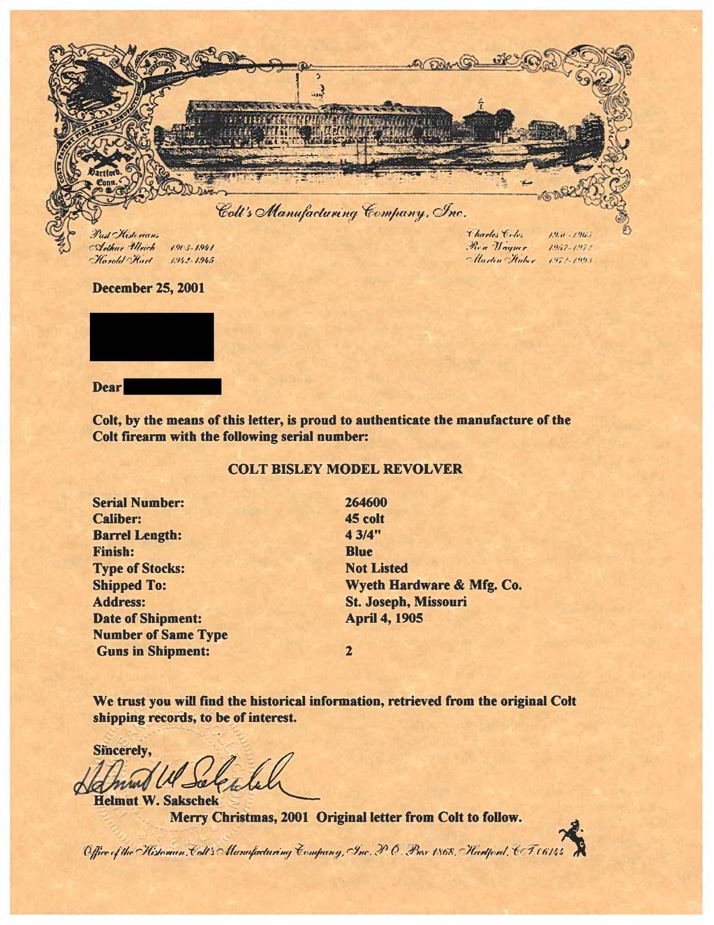 FACTORY LETTERS. Cal. 45 Colt. S# 264600. Bbl. 4 3/4". Single Action Army Bisley Model revolver mfg. by Colt in 1905. Left side of the bbl. is marked "(BISLEY MODEL) 45 COLT", with Colt's 2-line address marked across the top. Left side of the frame is marked with Colt's 2-line patent information, followed by the encircled Rampant Colt logo. Bbl., ejector rod housing, cyl., trigger, and grip straps exhibit a reapplied blue finish overall. Frame is mounted with 2-piece Colt checkered brown hard rubber grips. Butt of left grip is carved with an apparent diamond, with an "E" carved on the butt of the right grip. Standard fixed blade front sight and square frame notched rear sight. All serialized parts are matching and include the frame, trigger guard, and rear grip strap. Grips are matching via a faint "4600", which is lightly etched on the interior of the panels. UNATTACHED ACCESSORIES: brown leather holster stamped "10" on the rear of the belt loop. Revolver is also accompanied by x2 Colt factory letters (x1 dated 2001, x1 dated 2002) indicating: "Serial Number: 264600/ Caliber .45/c/ Barrel Length: 4 3/4"/ Finish: Blue/ Type of Stocks: Not Listed/ Shipped To: Wyeth Hardware & Mfg. Company/ Address: St. Joseph, Missouri/ Date of Shipment: April 4, 1905/ Number of Same Type Guns in Shipment: 2". 2001 factory letter is accompanied by an additional page detailing the history of Wyeth Hardware & Mfg. Co. CONDITION: frame and hammer have faded to a gray patina, exhibiting consistent light to mild pitting overall. Remaining metal components exhibit areas of wear and thinning to their reapplied blue finish, with consistent light pitting, handling marks, and some spots of mild pitting present overall. Bore is mostly bright, exhibiting scattered spots of mild pitting and scattered patches of moderate pitting, while retaining strong rifling throughout. Proper manual mechanics, with slight cyl. play. Grips show smoothing and scattered superficial handling marks overall, with a few small chips. Holster remains malleable, exhibiting agre related cracking overall. PROVENANCE: From the Buckstix Collection. (25-6344/MLW). CURIO. $1,500-2,250.