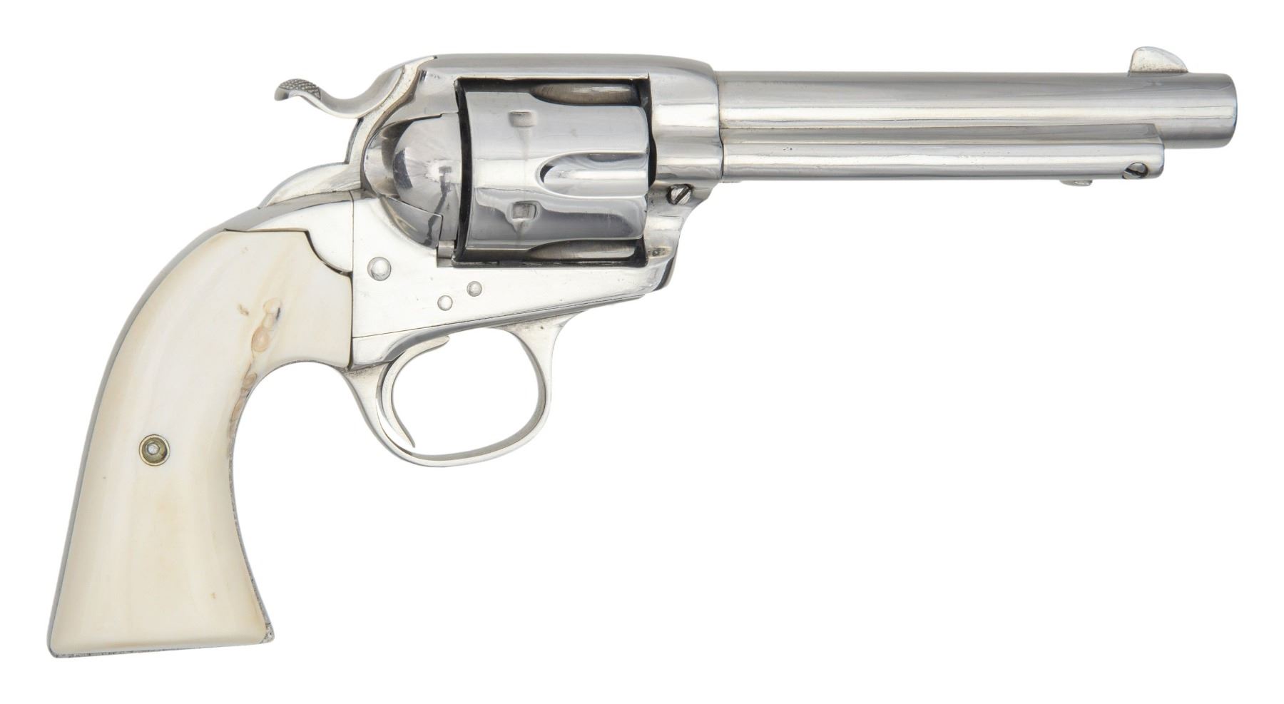 Cal. 32 WCF (32-20). S# 270666. Bbl. 5 1/2" rnd. with blade sight and Hartford address. 6-shot fluted cyl. Aftermarket 2-piece natural white grips. Frame and grip straps have matching S#s. Mfg. 1905. CONDITION: over 95% re-nickeled finish showing spots of remaining pitting with weakened markings. Grips show light age related discoloration. Sound action. Lightly pitted bore retains largely intact rifling. (25-4900/MLW). CURIO. $900-1,400.
