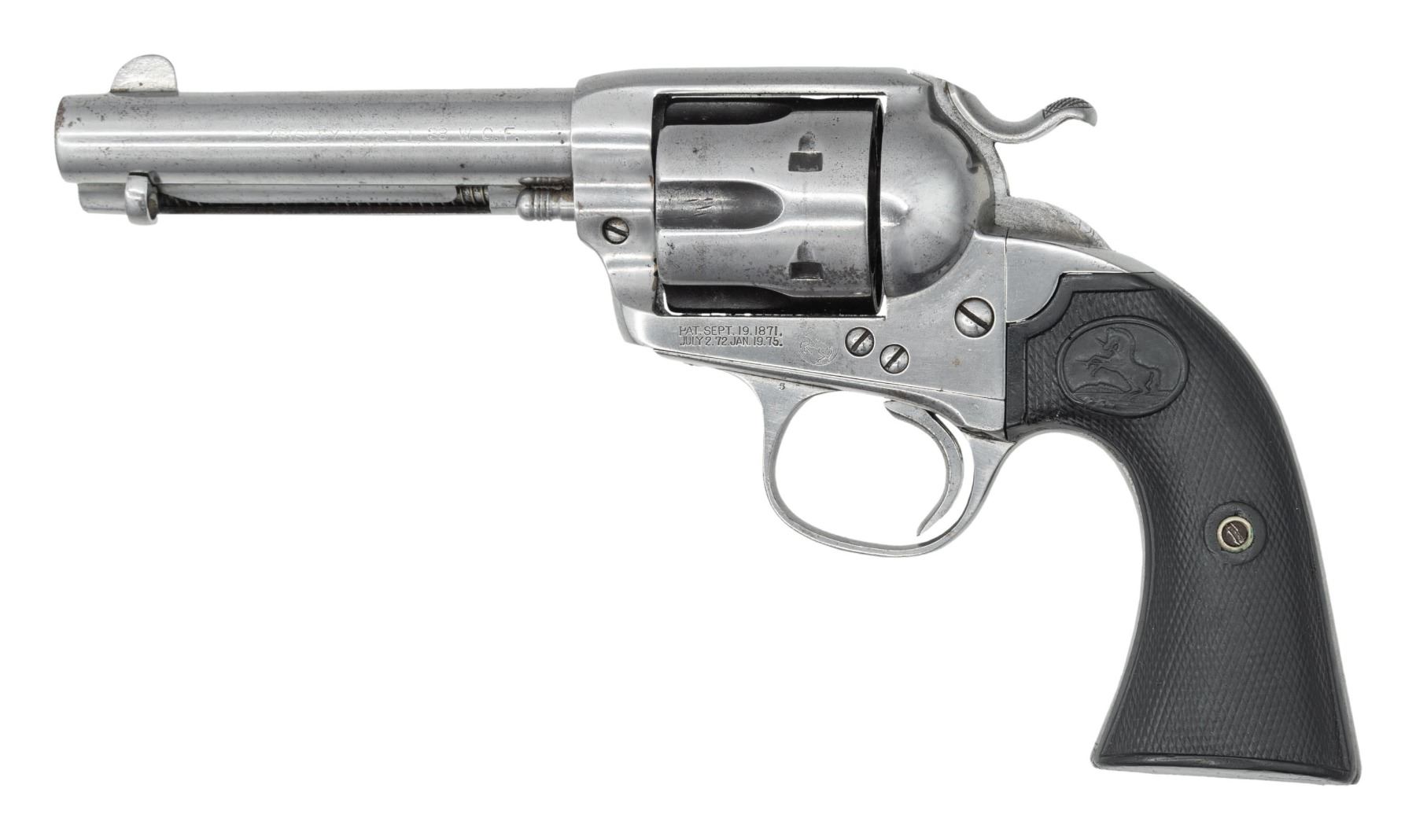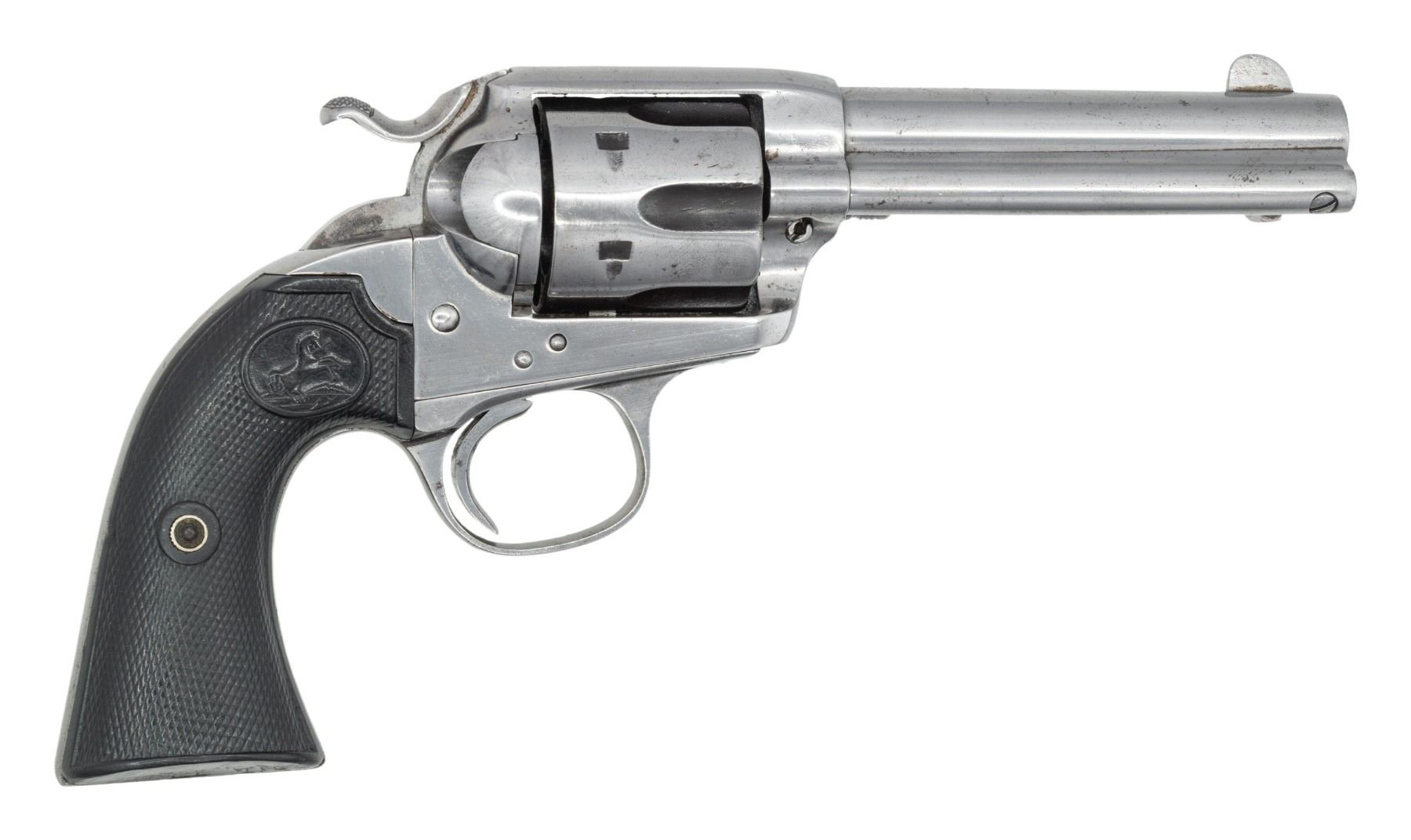 Cal.38 WCF (38-40). S#. 265786. Bbl. 4 3/4" with blade sight & Hartford address. 6 shot fluted cyl. Frame & grip straps have matching numbers. Cylinder S# is stamped out. 2 piece checkered hard rubber rampant colt grips. Mfg. 1906. CONDITION: metal is polished bright showing spots of pitting. Transverse cyl. pin screw is an incorrect replacement. Grips show checkering wear with handling marks at the butt. Action shows wear and is not holding properly on the 3rd notch. Dark lightly pitted bore retains intact rifling. (25-4902/DS). CURIO. $800-1,200.